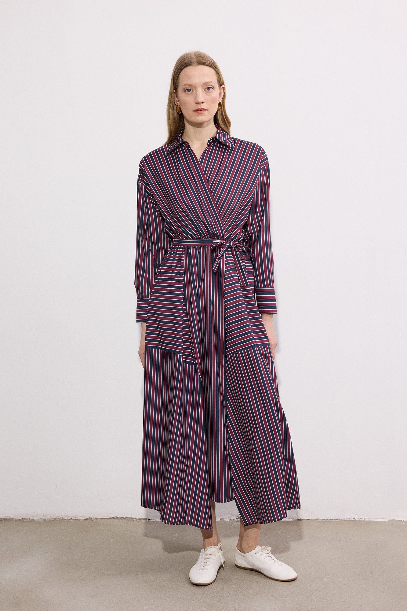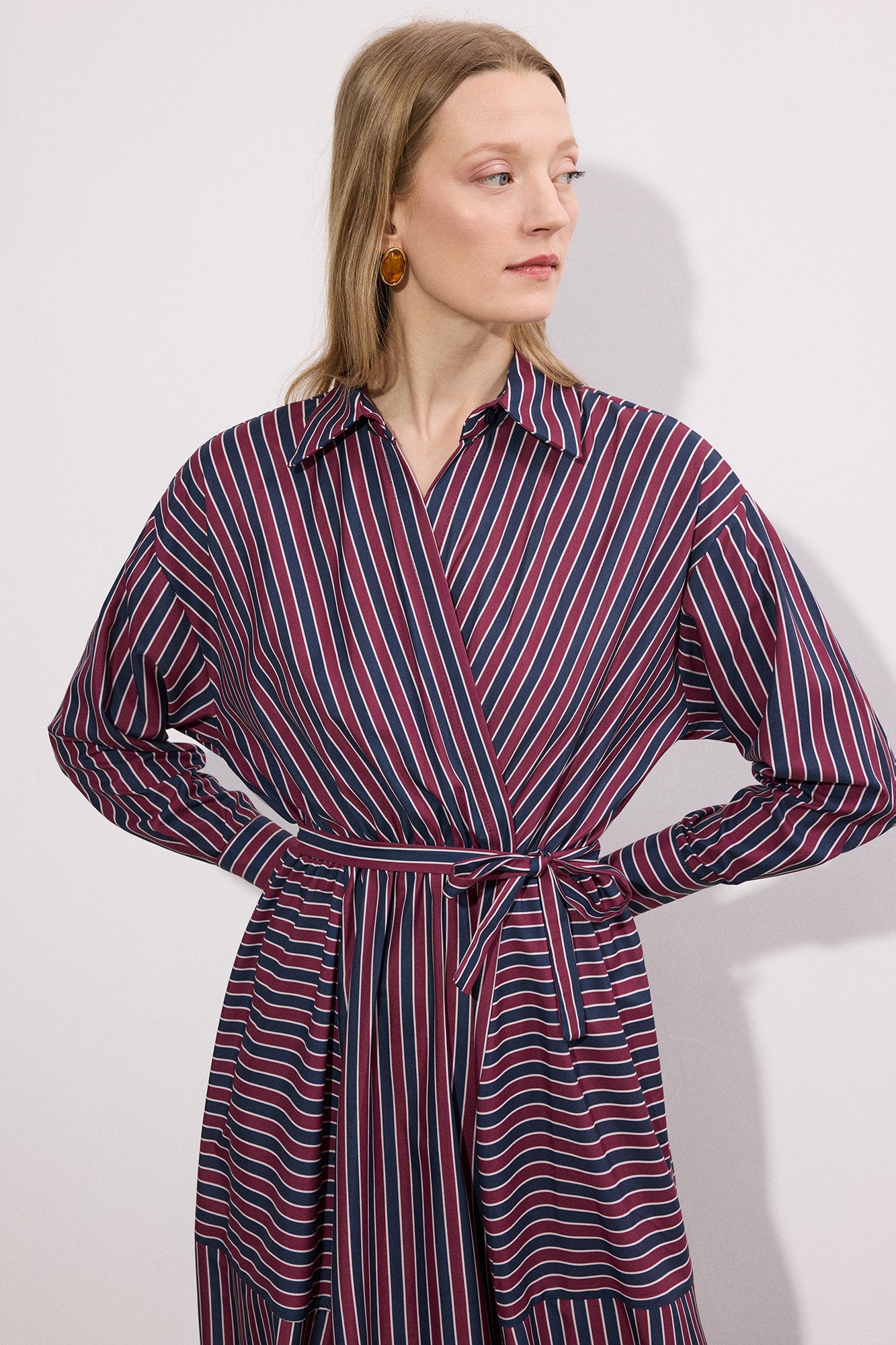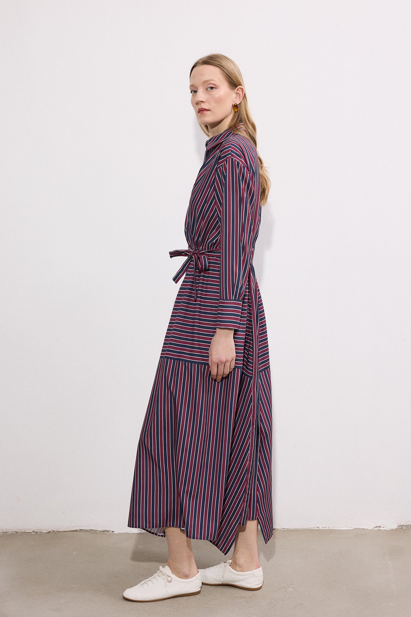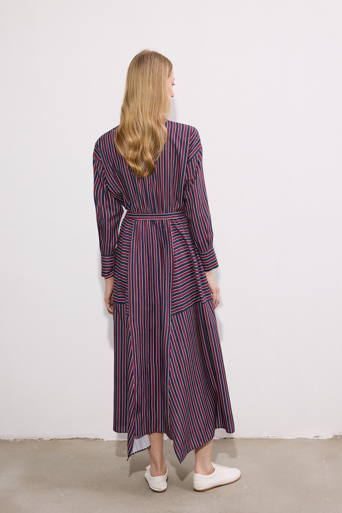 Gömlek yaka. Çizgili desen. Uzun kol. Beli lastikli büzgü detaylı. Yaka kısmı tek düğme kapamalı. Kuşaklı elbise.