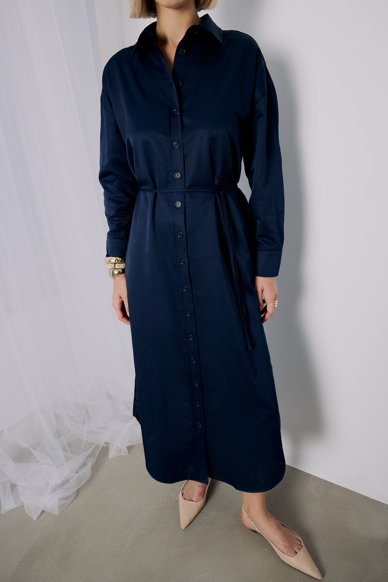 Klasik yaka. Uzun kollu ve düşük omuzlu. Manşetleri düğmeli. Önden düğme kapama.