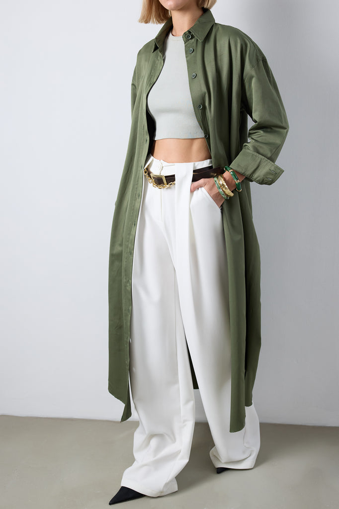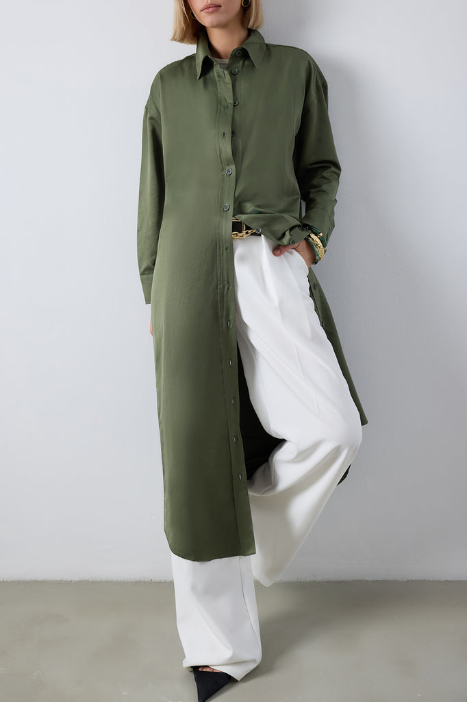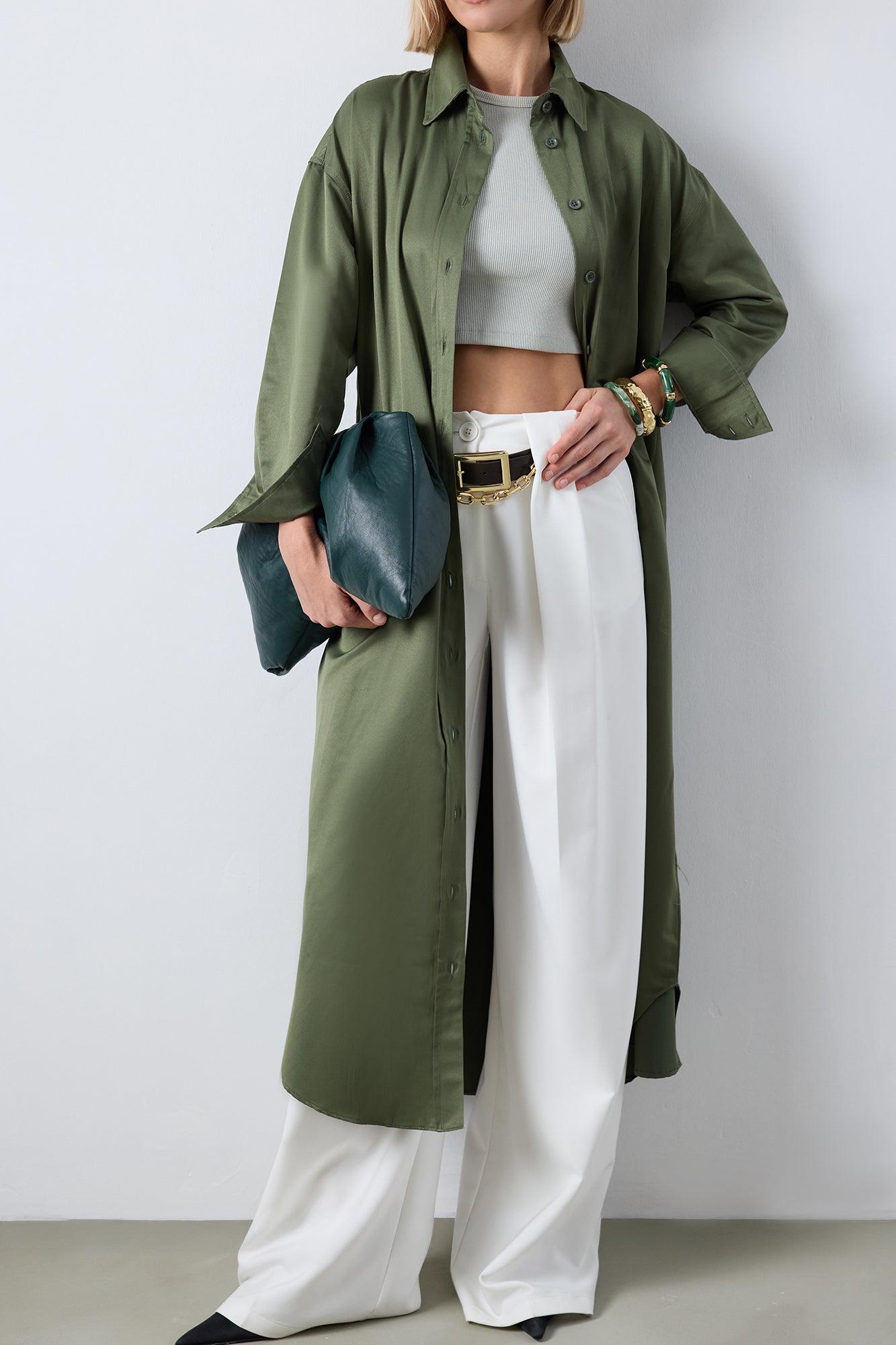 Klasik yaka. Uzun kollu ve düşük omuzlu. Manşetleri düğmeli. Önden düğme kapama.