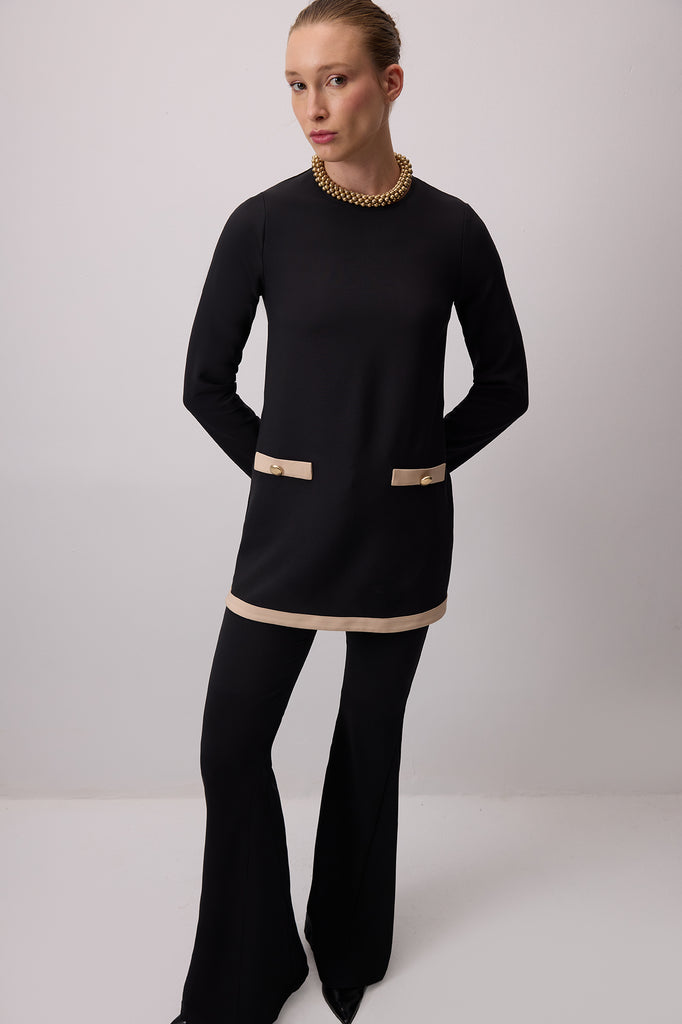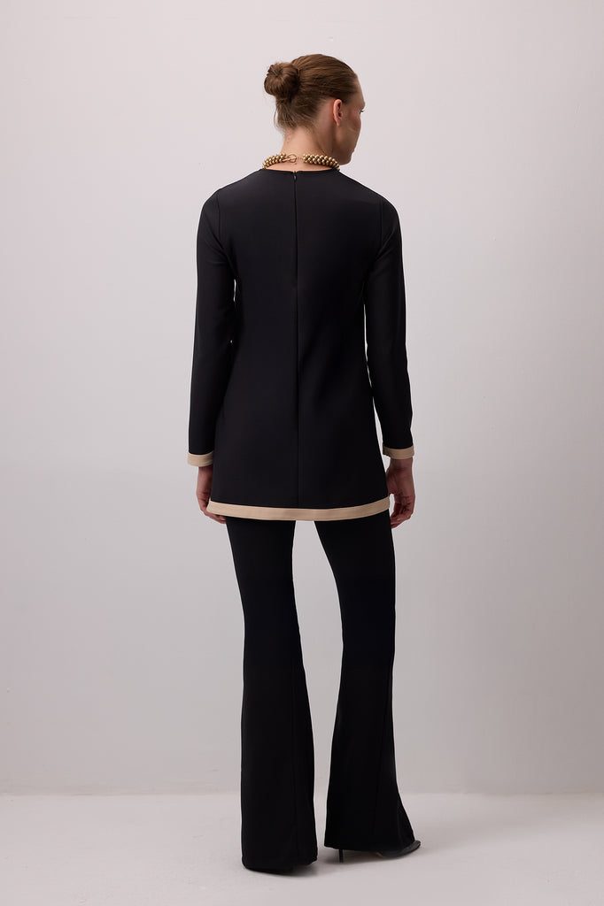 Bisiklet yaka. Uzun kollu. Kontrast manşetli. Arka gizli fermuar kapama.