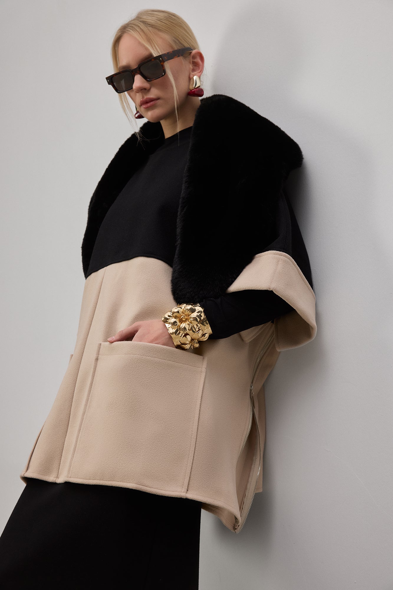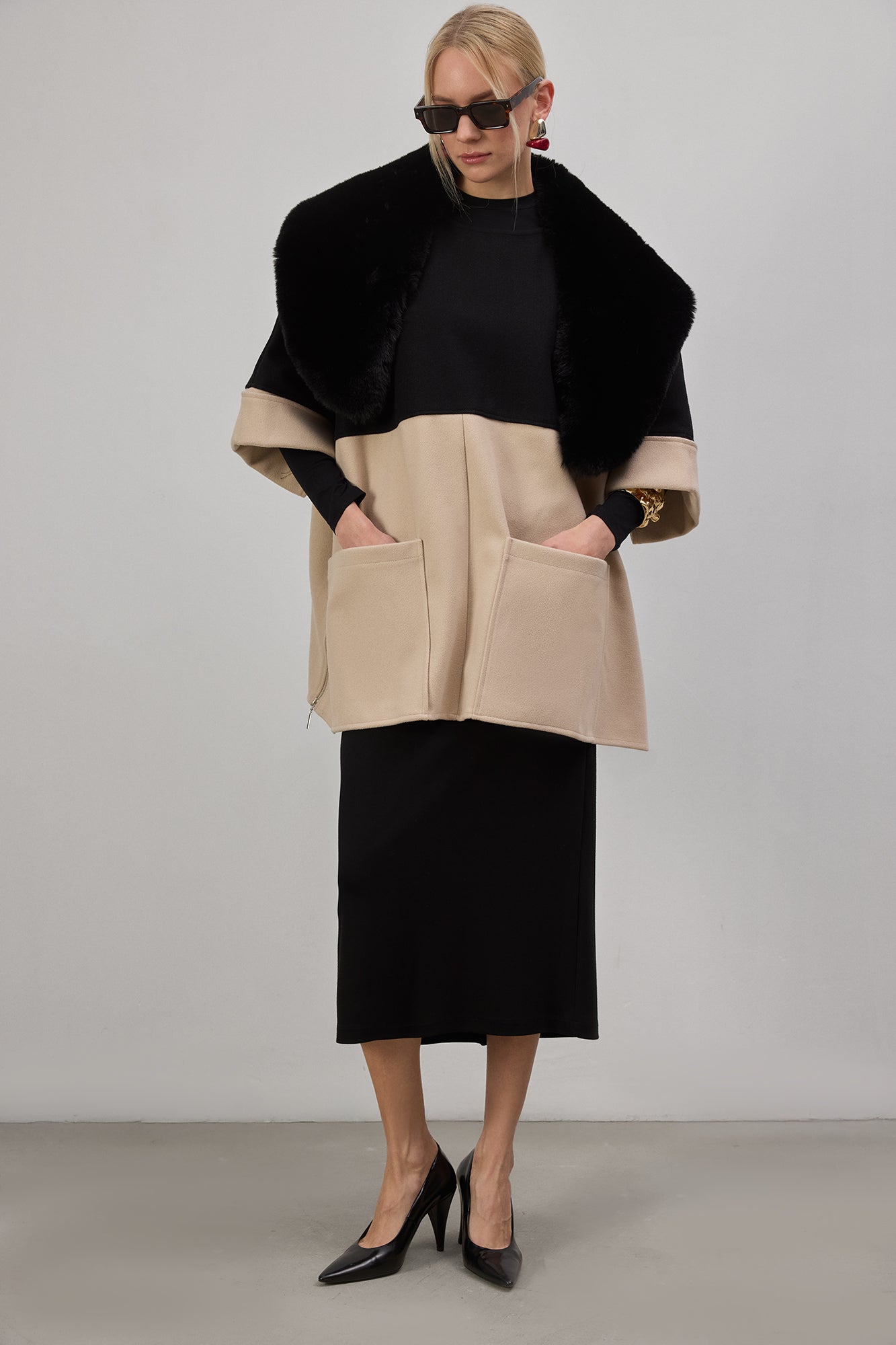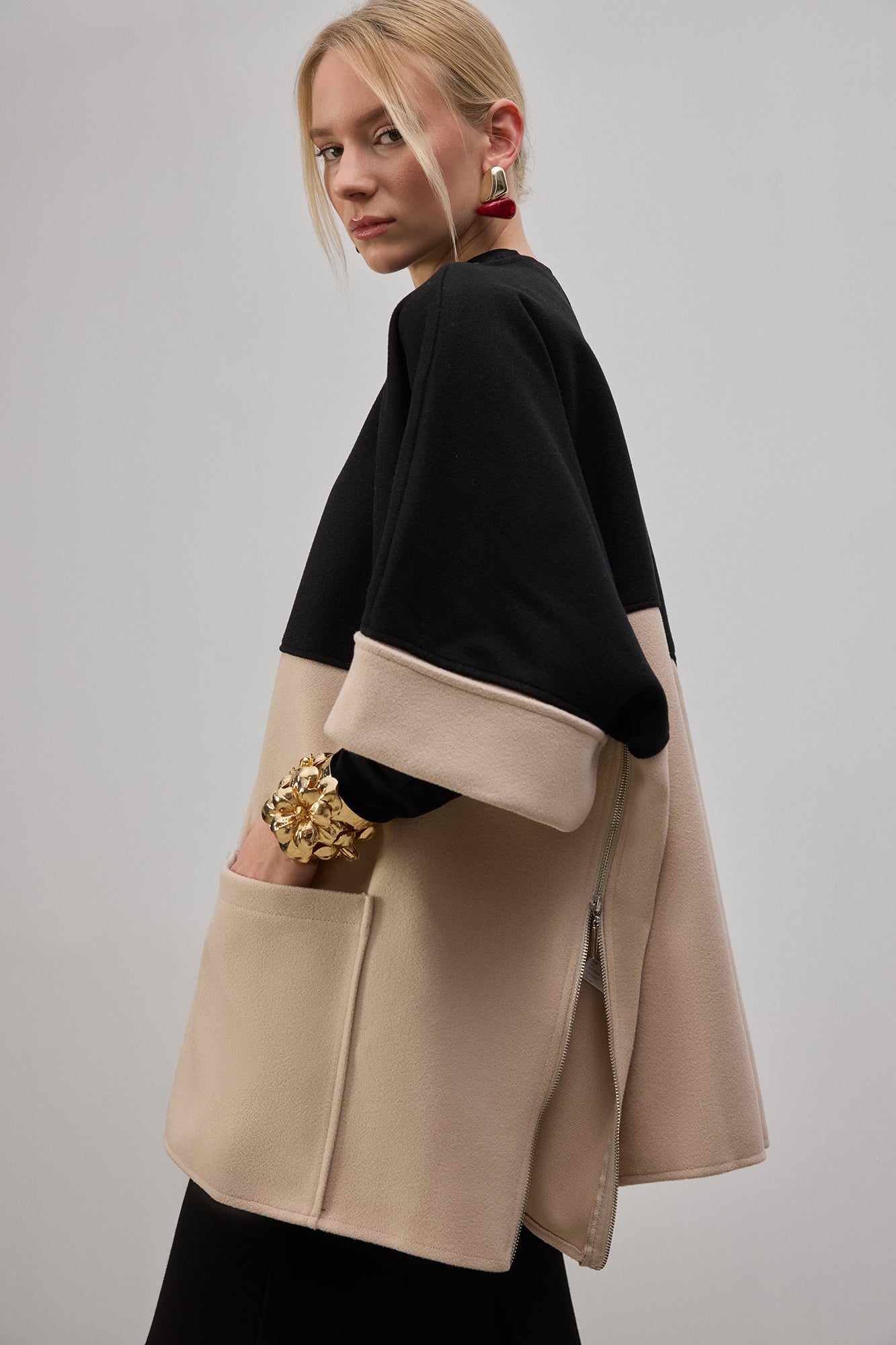 Modern ve şık tasarımıyla öne çıkan bu kontrast renkli kaşe panço, hem rahatlığı hem de sofistike bir görünümü bir arada sunuyor. Yumuşak ve sıcak tutan kaşe kumaşı sayesinde soğuk havalar için ideal bir tercih olurken, geniş kesimi hareket özgürlüğü sağlıyor. İki tonlu tasarımıyla dikkat çeken bu panço, minimal ama etkileyici bir stil sunarken, büyük cep detayları fonksiyonelliği artırıyor. Boğazlı trikolar ve deri pantolonlarla kombinleyerek güçlü bir görünüm elde edebilir, sneaker veya botlarla tamamlayarak casual bir stil oluşturabilirsiniz. Gardırobunuza zamansız bir parça eklemek için mükemmel bir seçenek!
