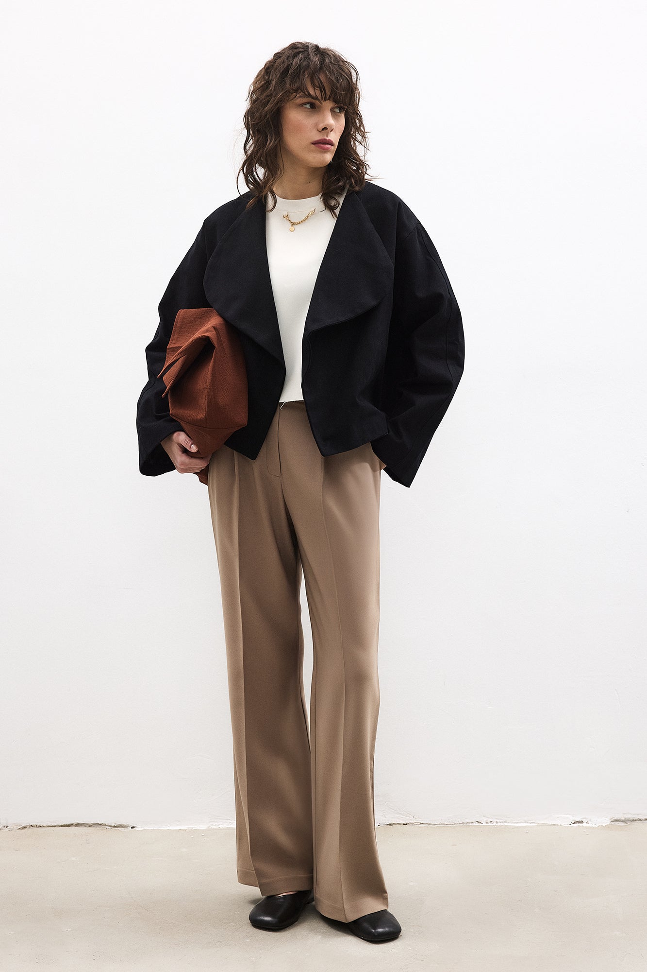Düğmesiz açık form. Uzun kollu. Yan cepli.