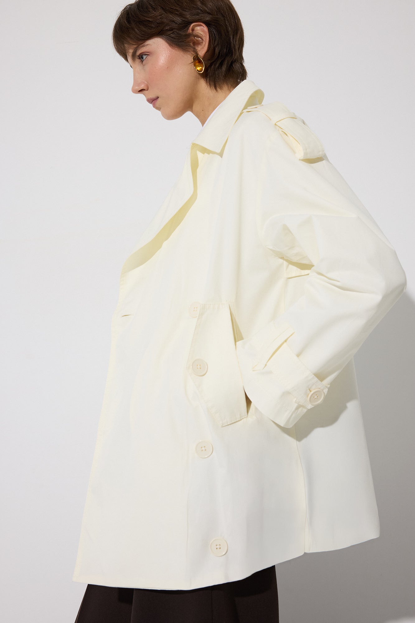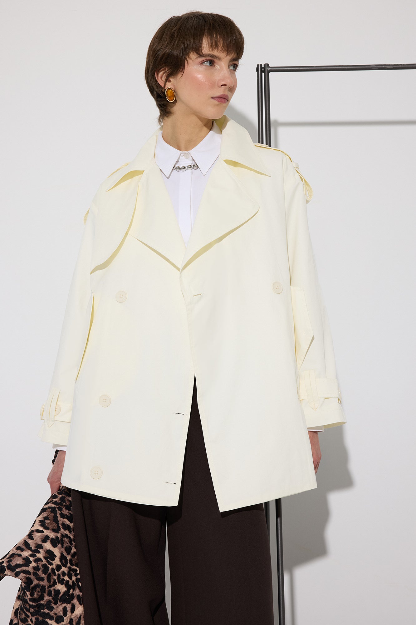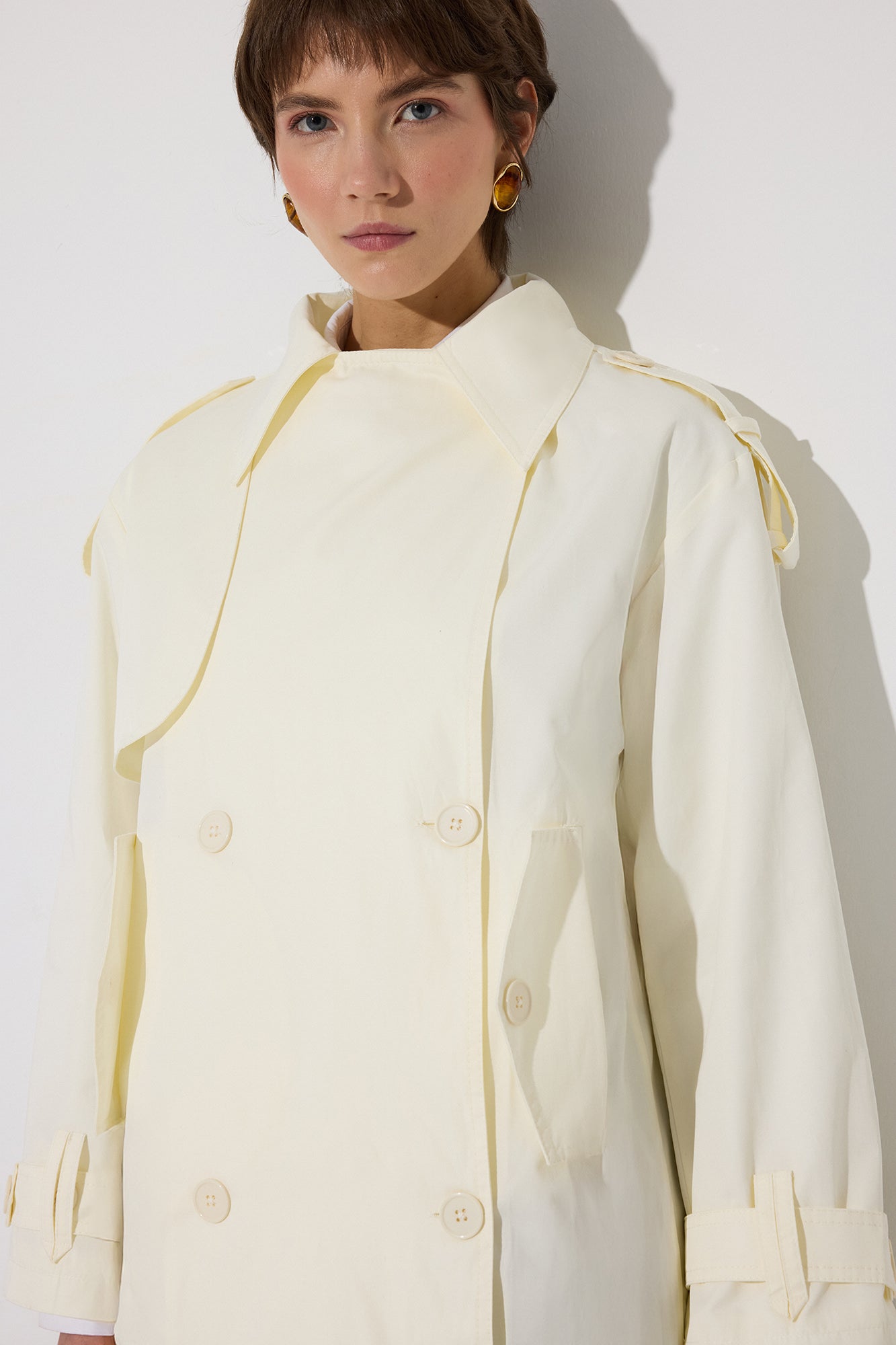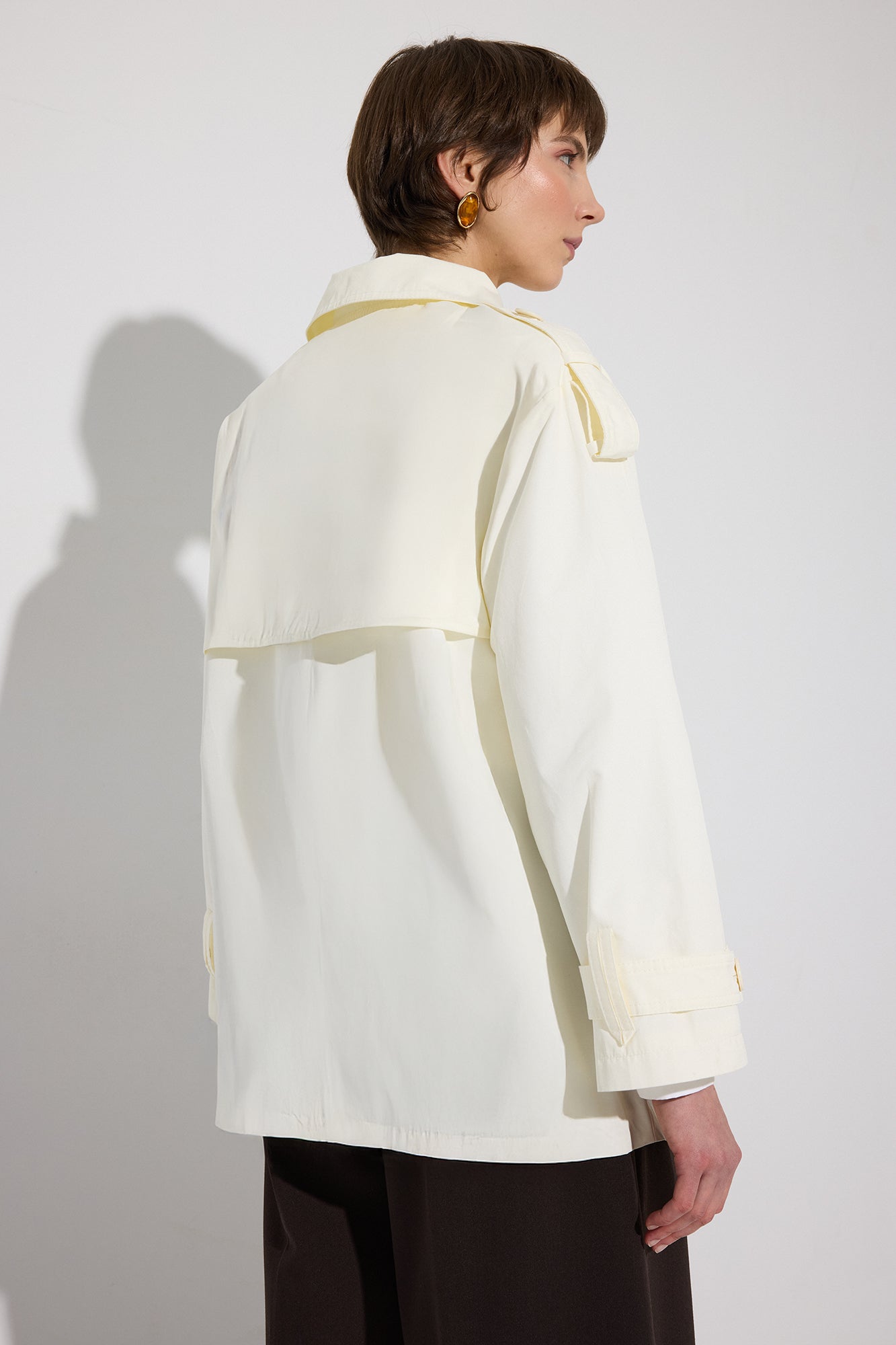 Kısa boy trençkot. Çift sıra düğme kapama. Geniş kruvaze yaka. Omuz apolet detaylı. Manşet kemer detaylı uzun kol.