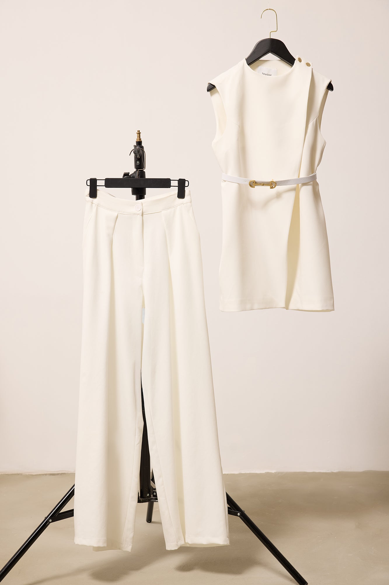 Bisiklet yaka. Kolsuz. Kruvaze kapamalı. Kemer detaylı. Uzun boy. Pileli. Bol paça pantolon.
