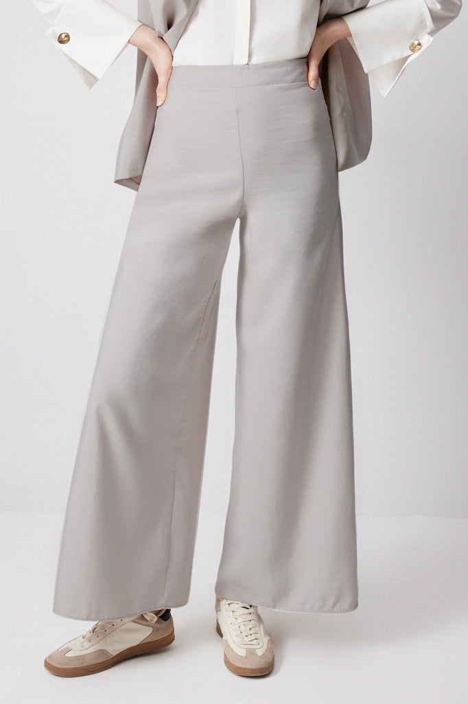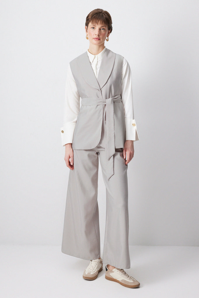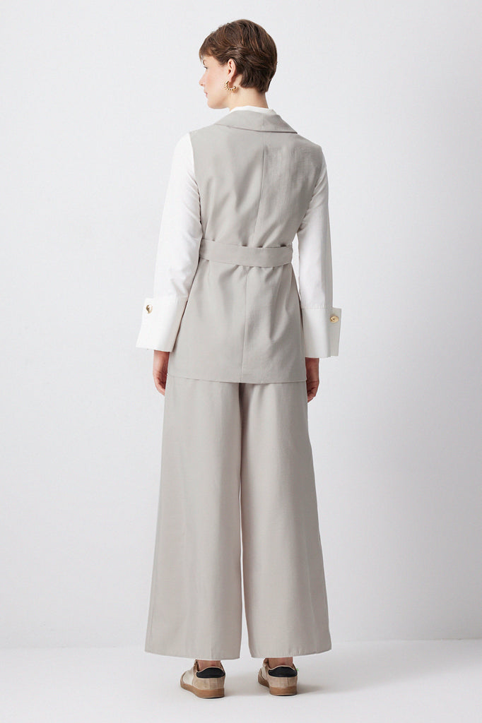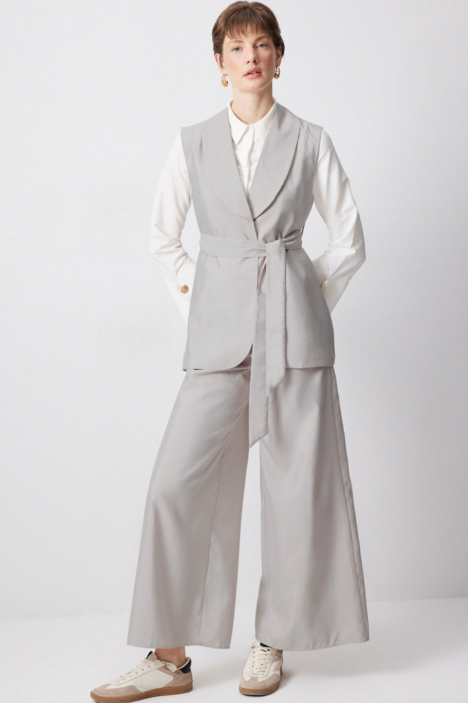 Kupra. Geniş katlamalı V yaka. Kolsuz. Aynı kumaştan kuşak bağlamalı yelek. Geniş paçalı pantolon. Yandan gizli fermuar kapama.