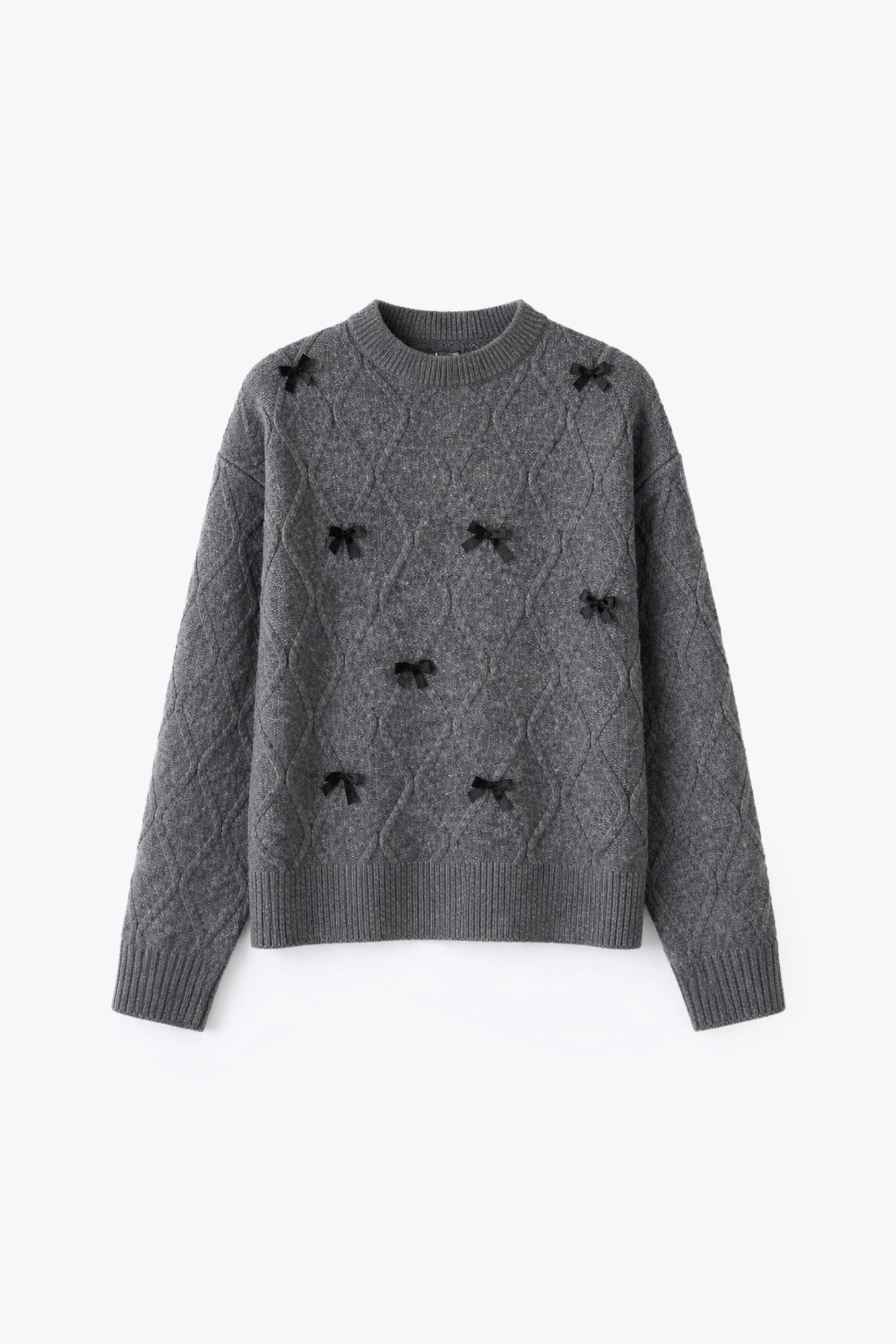 Bisiklet yaka. Uzun kollu. Ön yüzeyde kabartmalı baklava desen örgü.