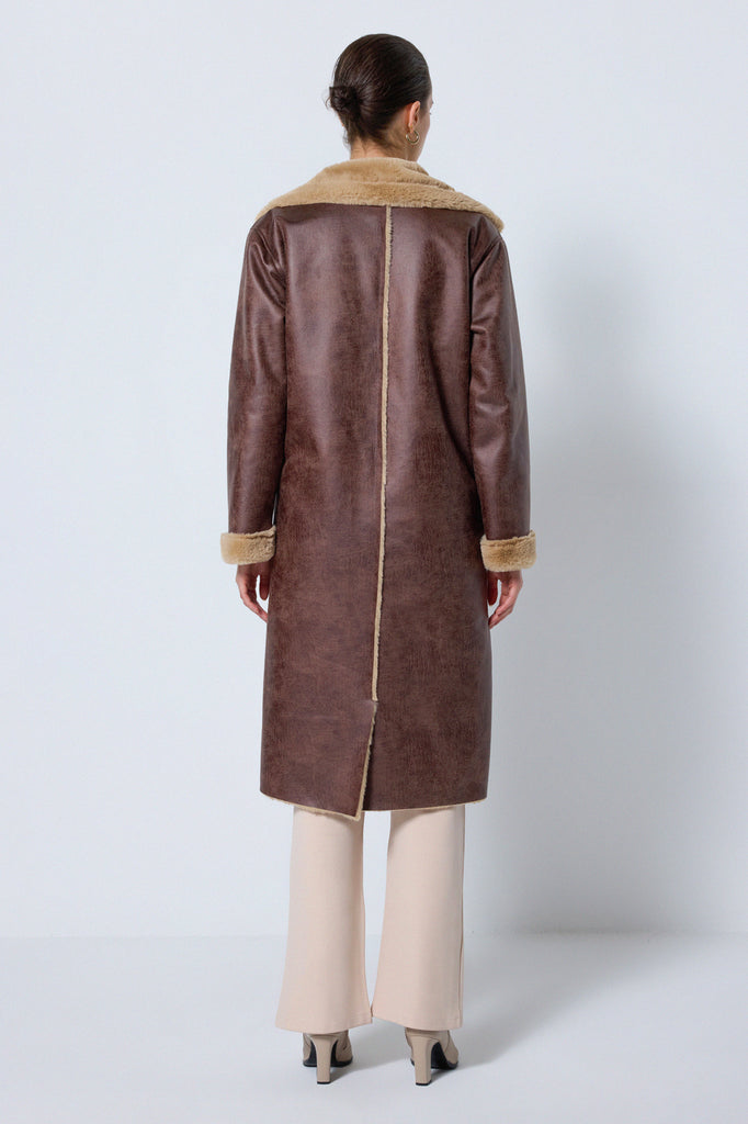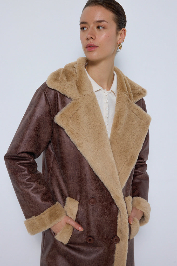 Suni kürk detaylı. Çift sıra düğme kapamalı. Geniş yaka. Yumuşak dokulu iç yüzey.
