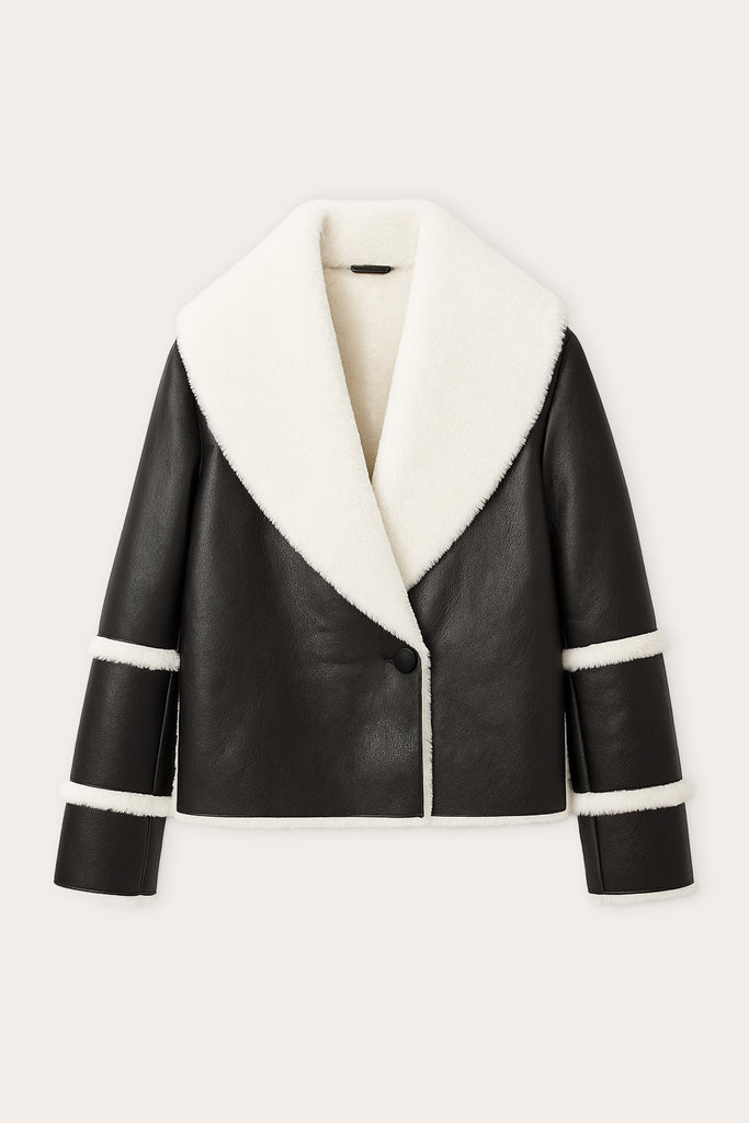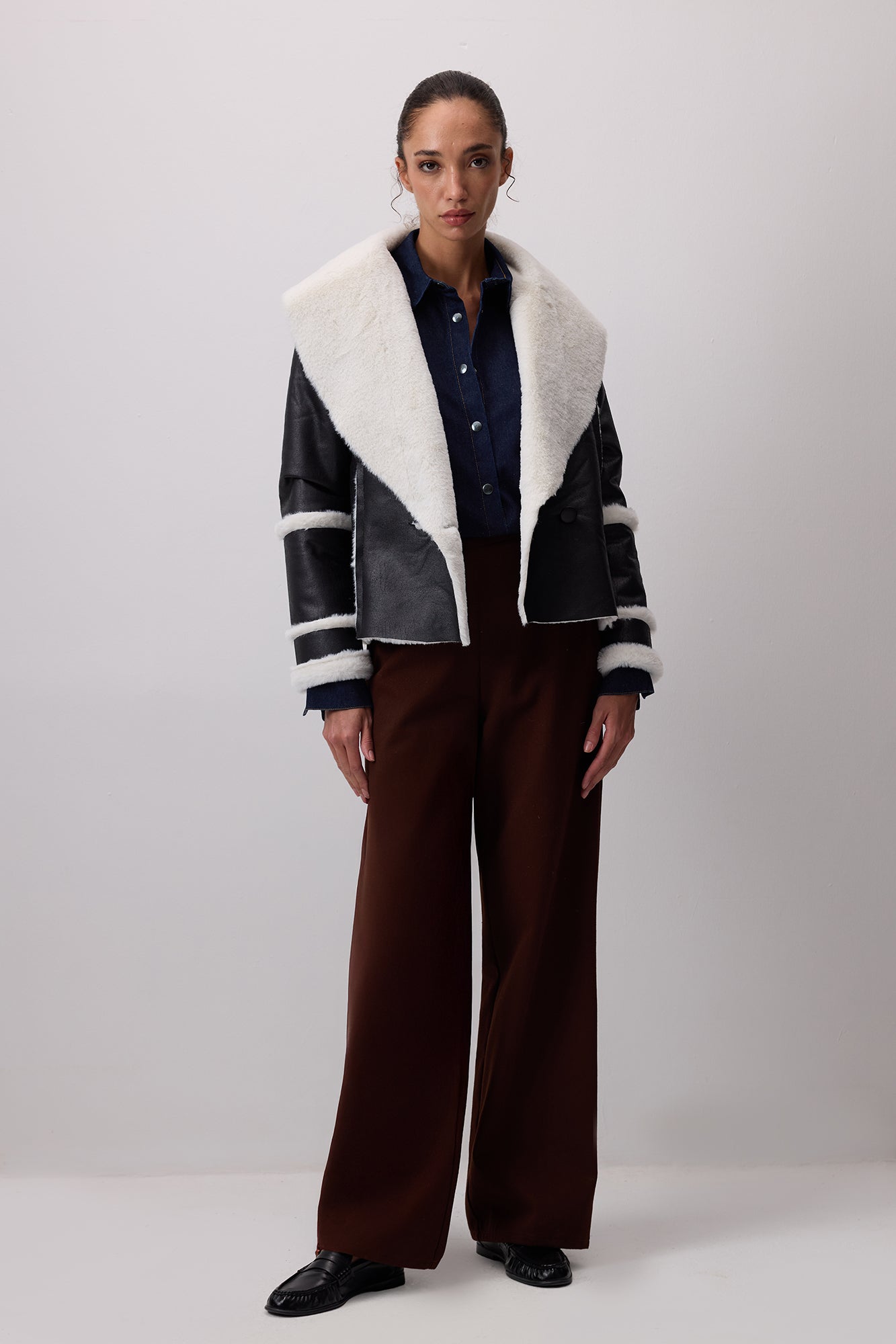 Geniş yakalı. Kontrast kürklü. Vegan deri ceket.