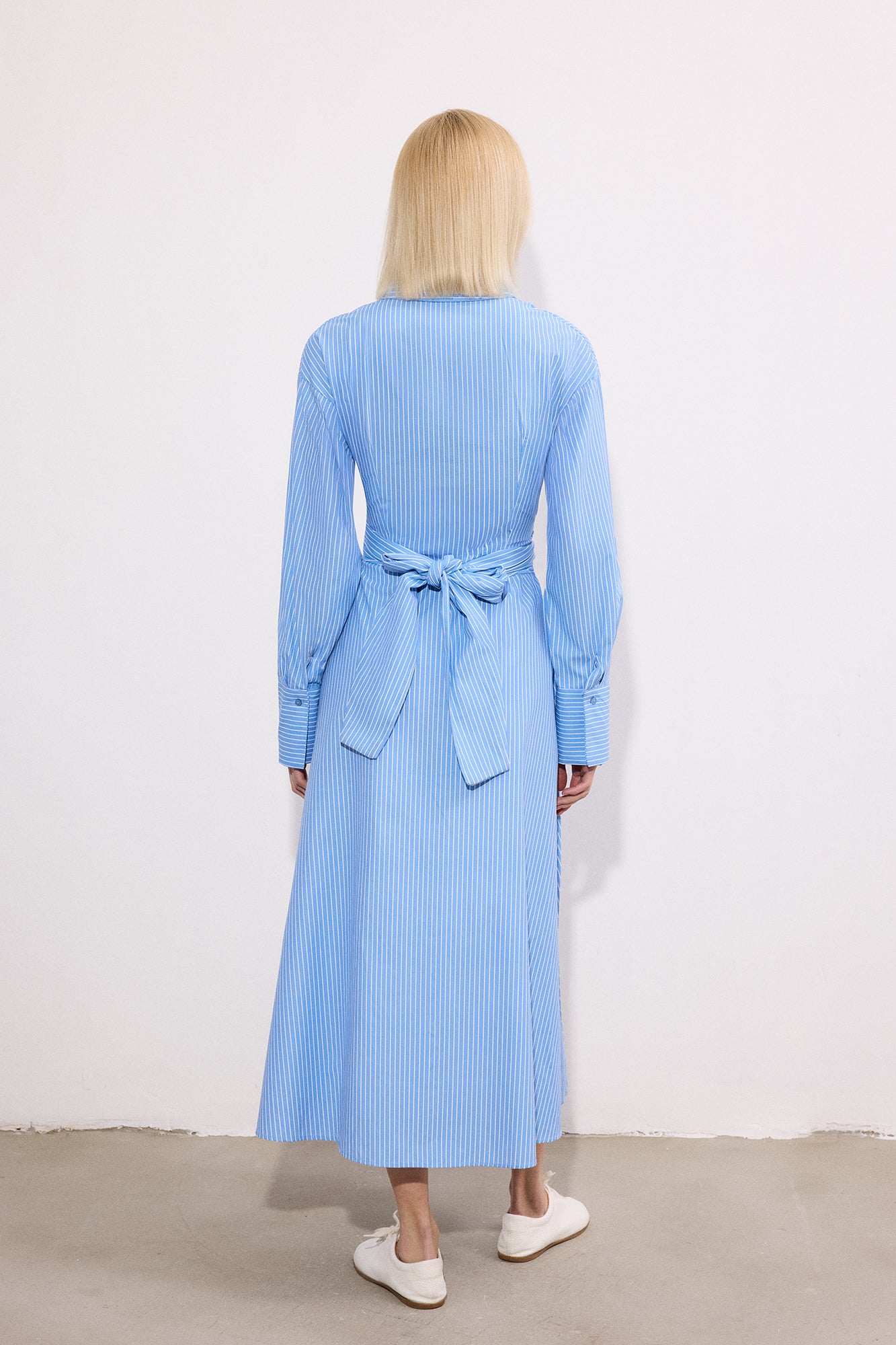 Gömlek yaka. Önü gizli düğme kapamalı. Uzun kollu. Manşetli kol ucu. Bel kısmı kuşaklı. Kuşak arkadan bağlama detaylı. Midi boy.