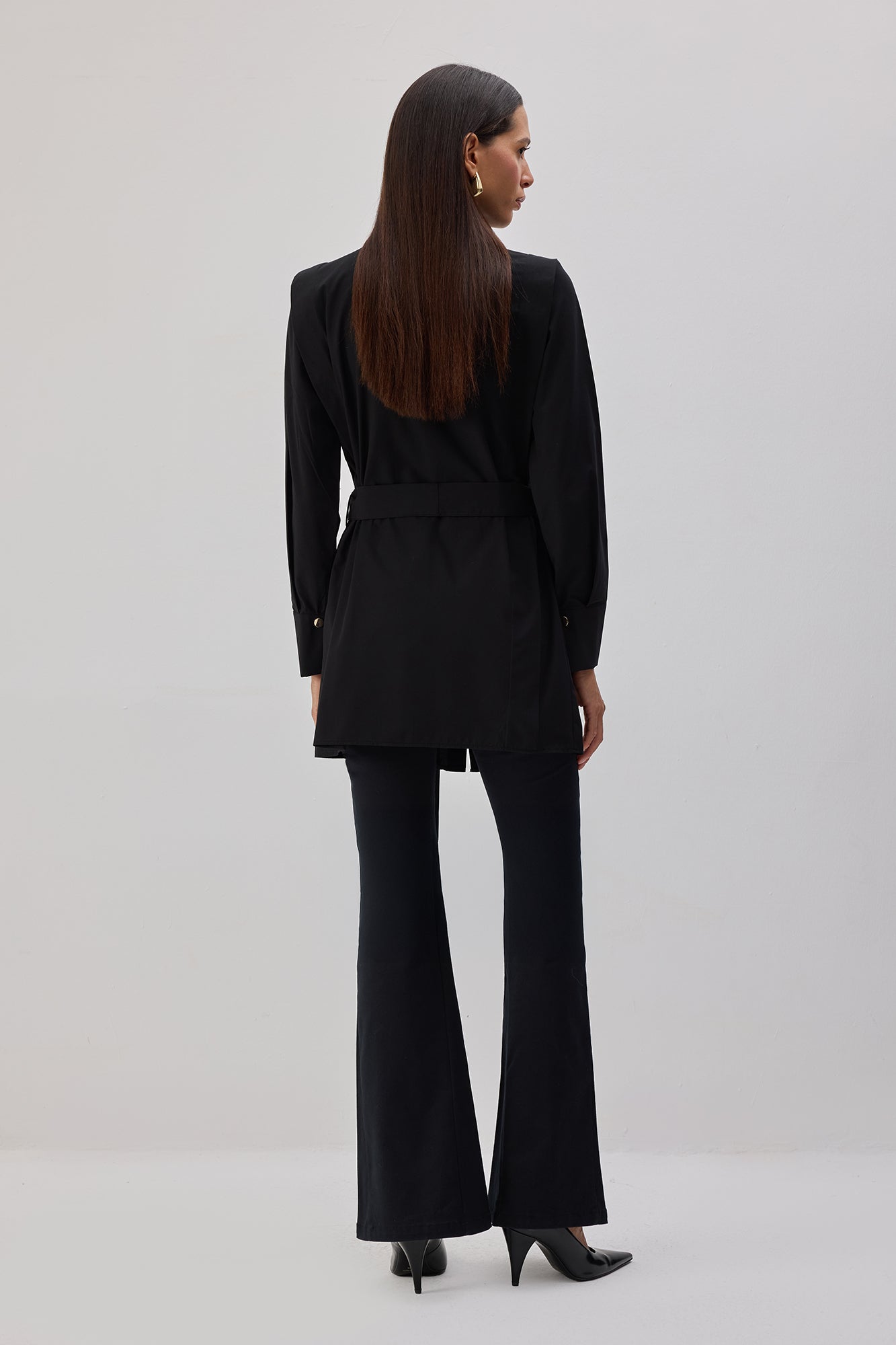 Önü tam boy gold çıtçıt düğme kapamalı. Belde kuşak geçiş detaylı. Çıtçıt düğmeli manşetli. Uzun kollu.