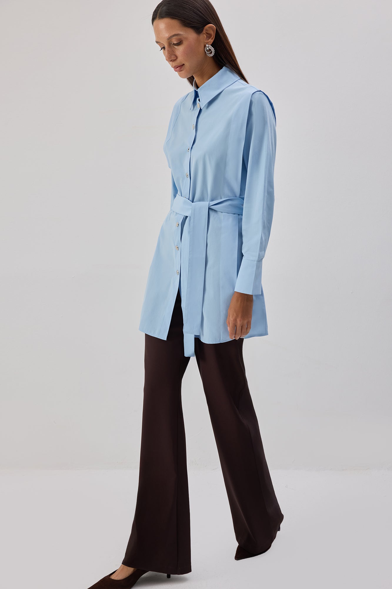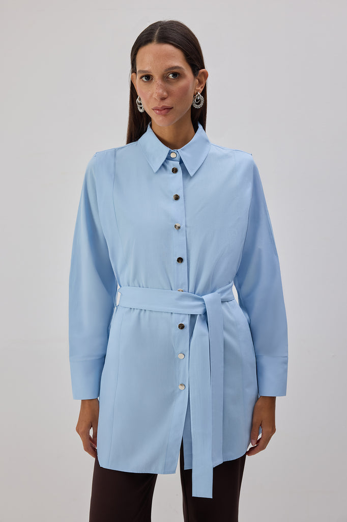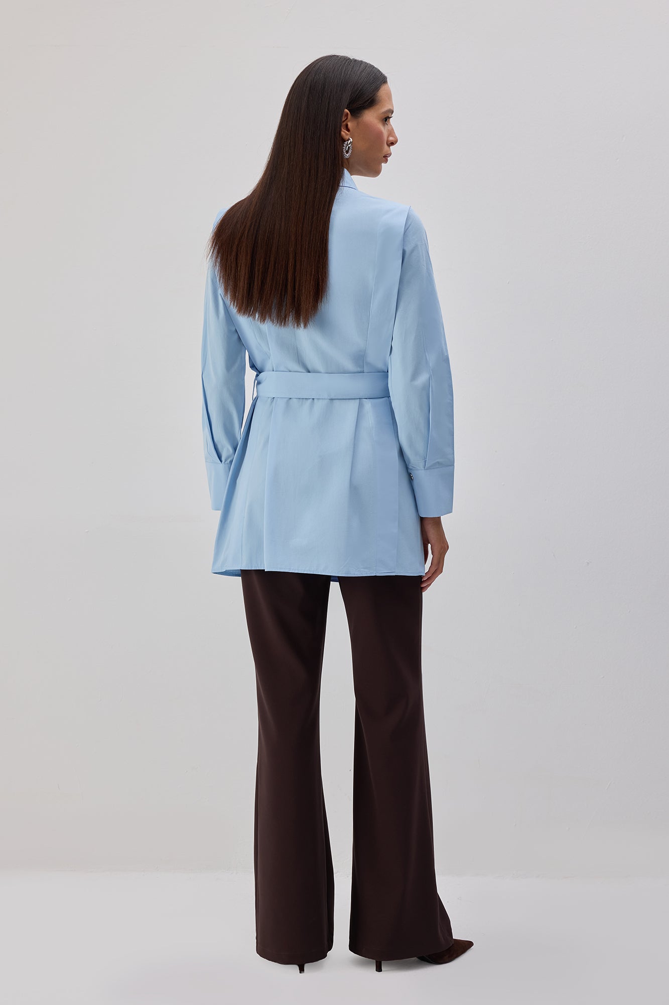 Önü tam boy gold çıtçıt düğme kapamalı. Belde kuşak geçiş detaylı. Çıtçıt düğmeli manşetli. Uzun kollu.