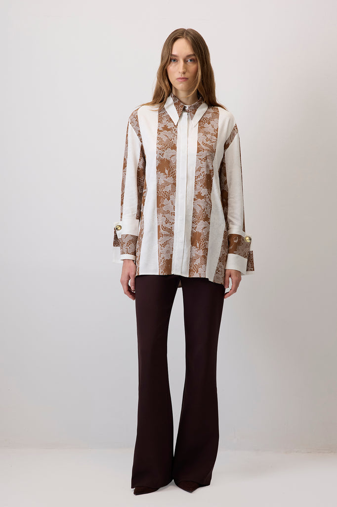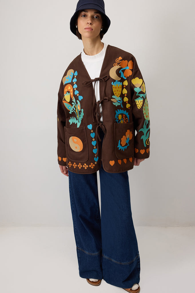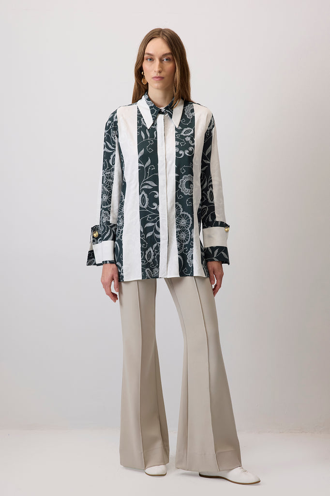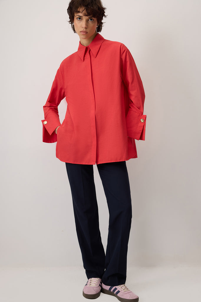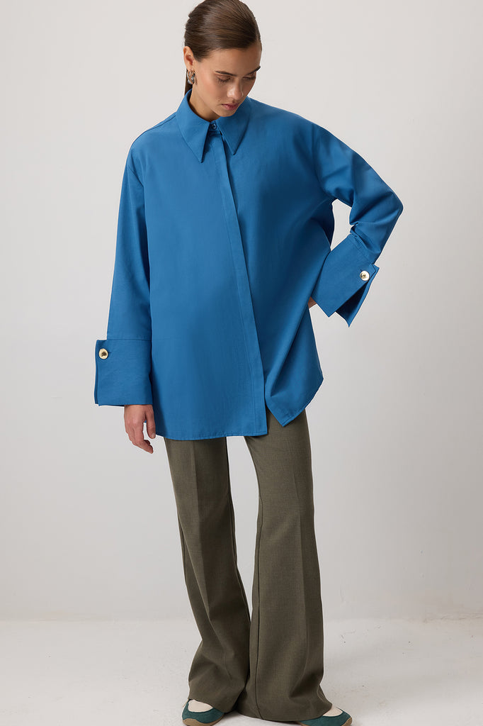 Klasik yaka. Uzun kollu ve manşetleri düğmeli. Kuşaklı. Önden düğme kapamalı.