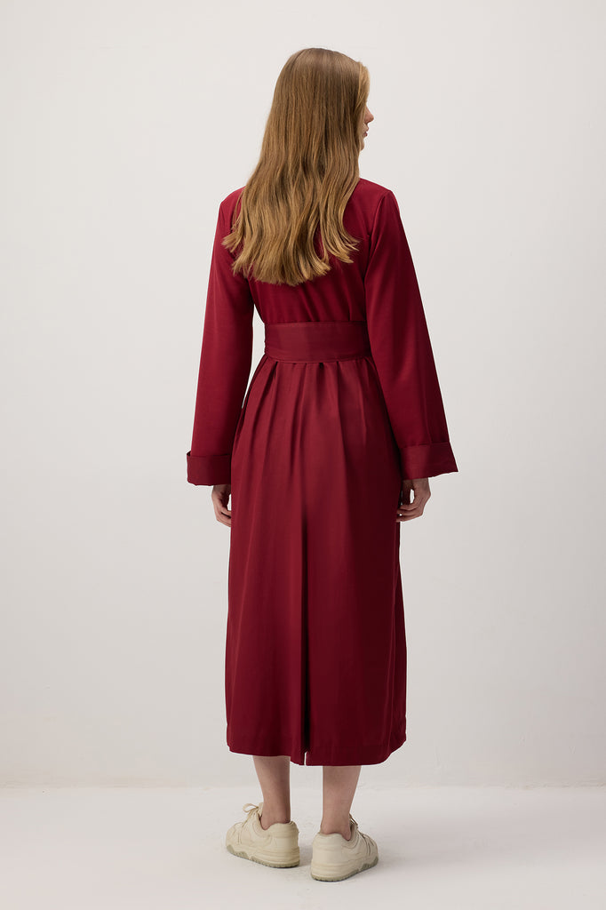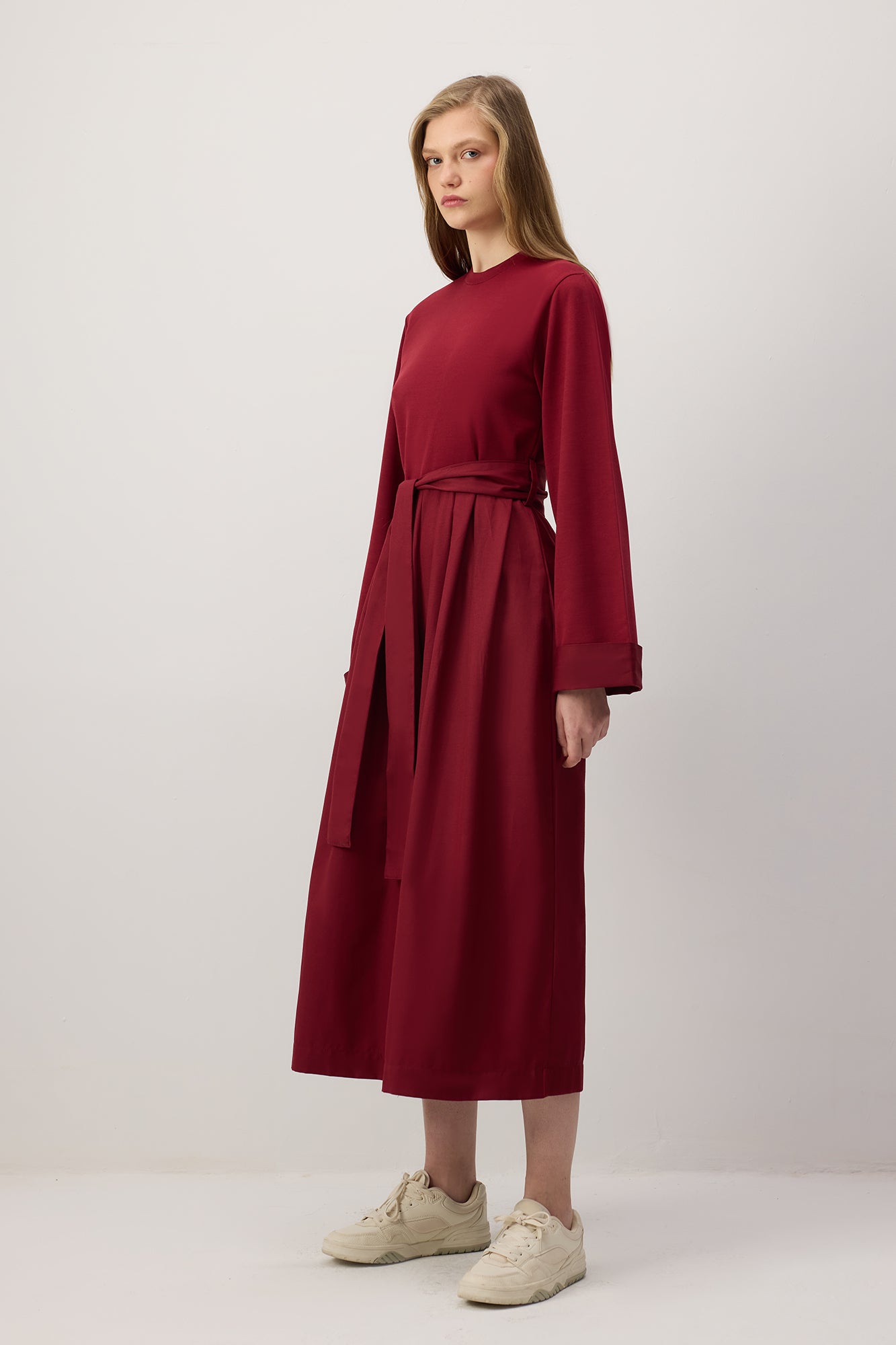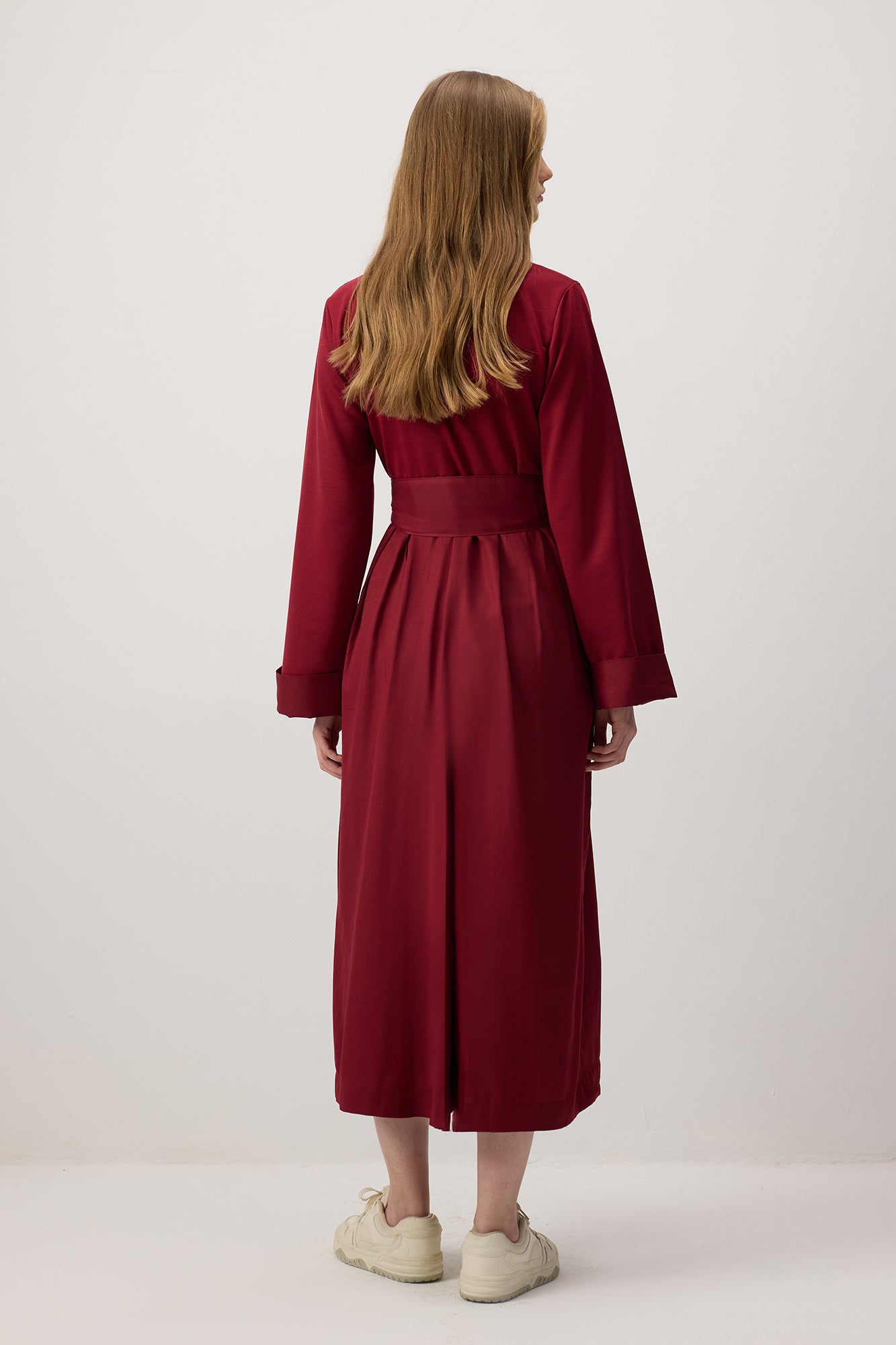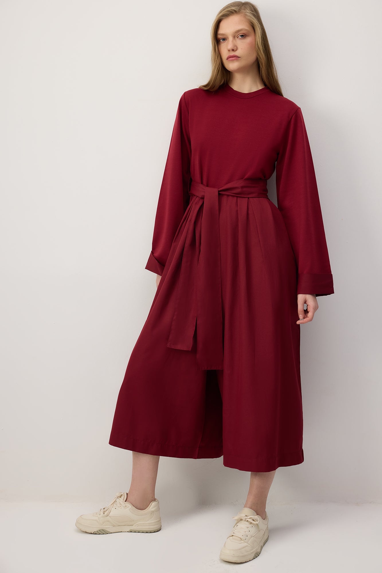 Kuşaklı, uzun kollu, rahat kesim tulum.