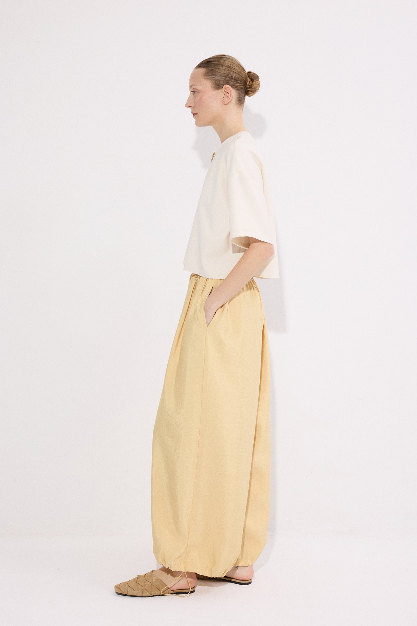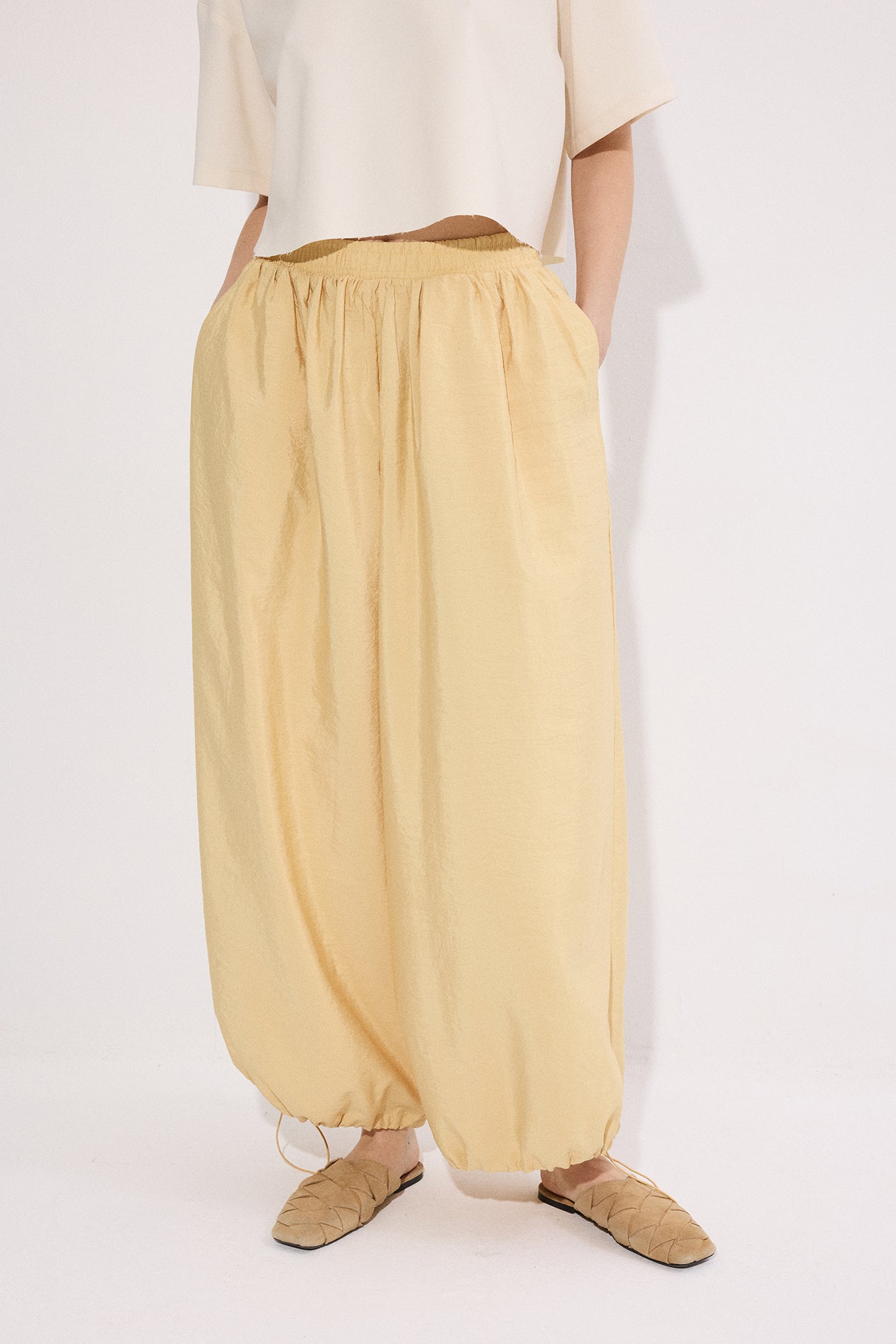 Yüksek bel. Beli lastikli. Yan cepli. Paça kısmı ayarlanabilir büzgü detaylı.