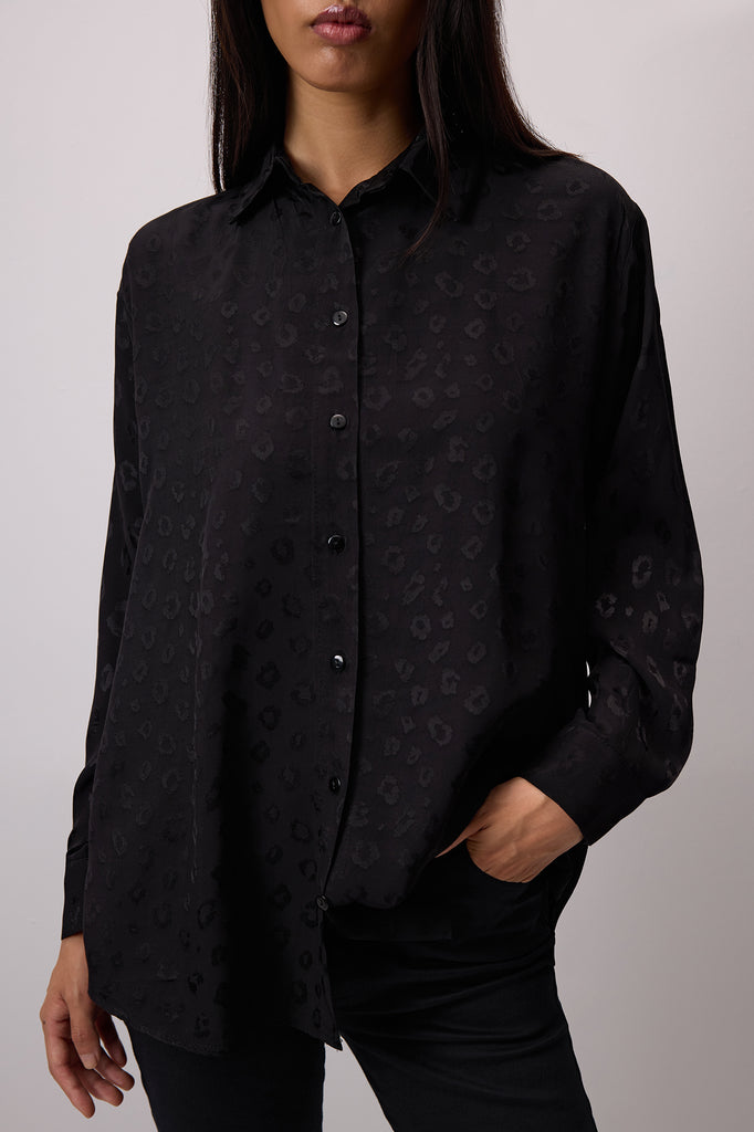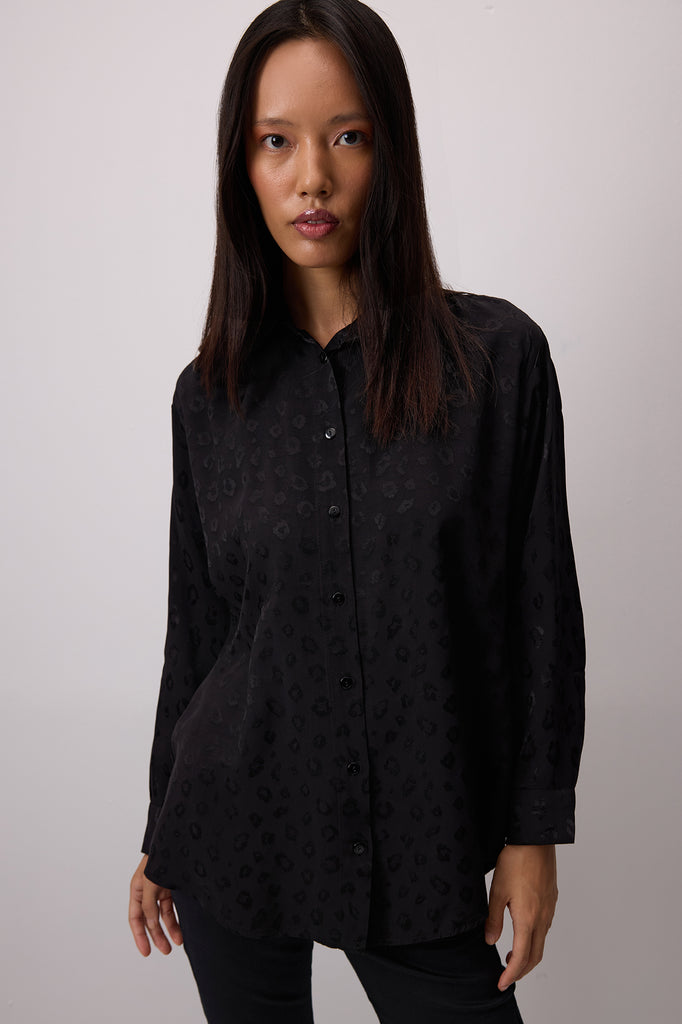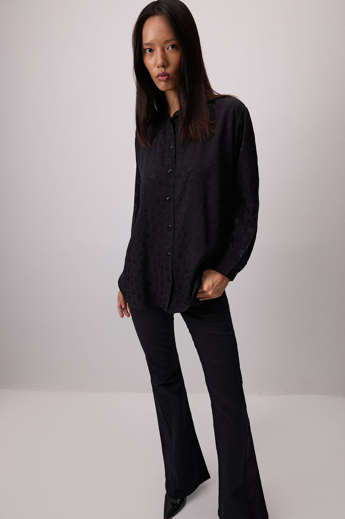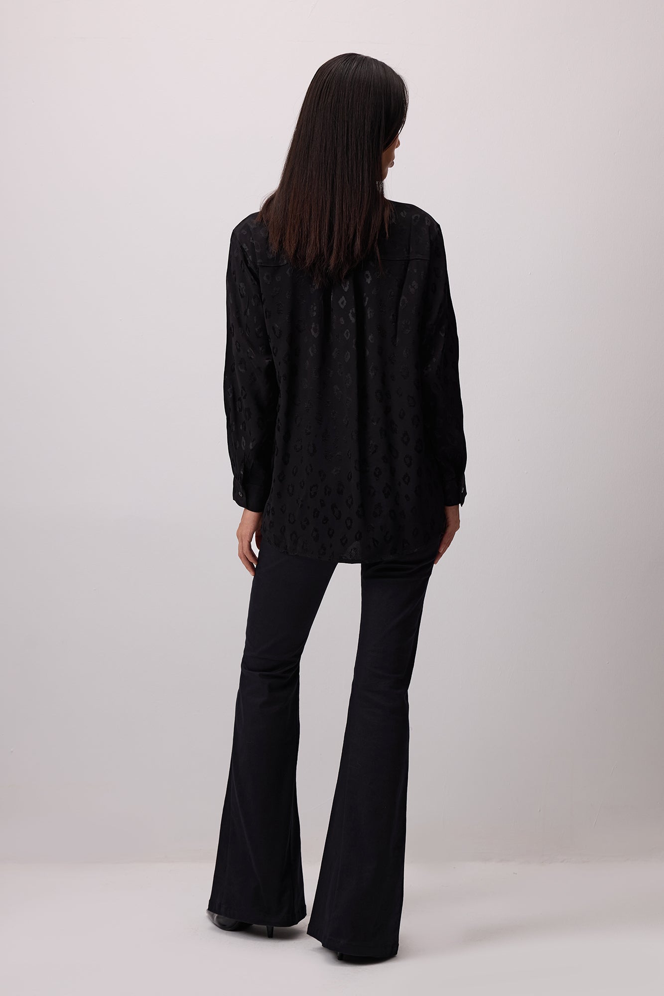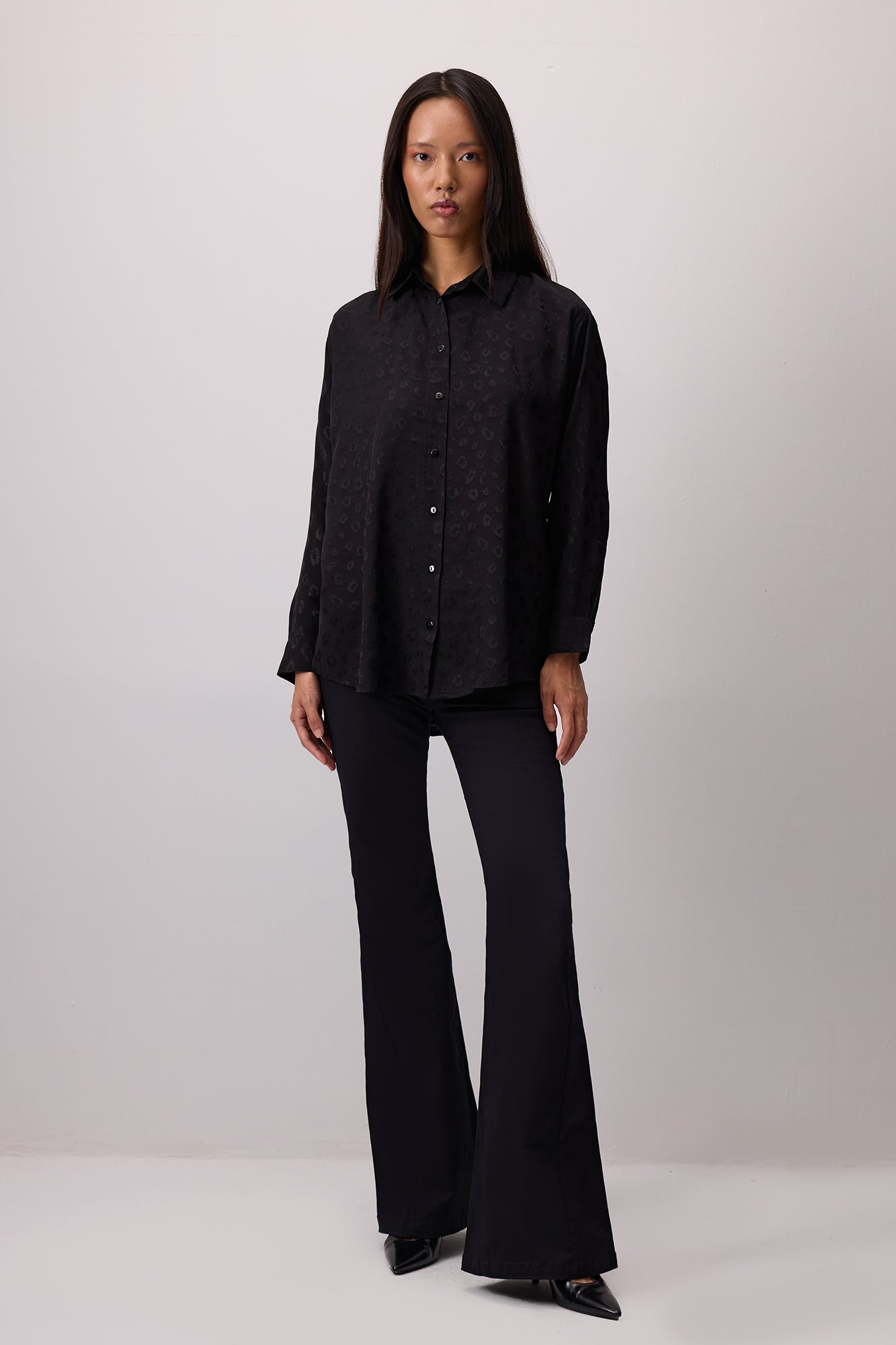 Klasik yaka. Uzun kollu ve manşetleri düğmeli. Leopar desenli. Önden düğme kapamalı. Gömlek.