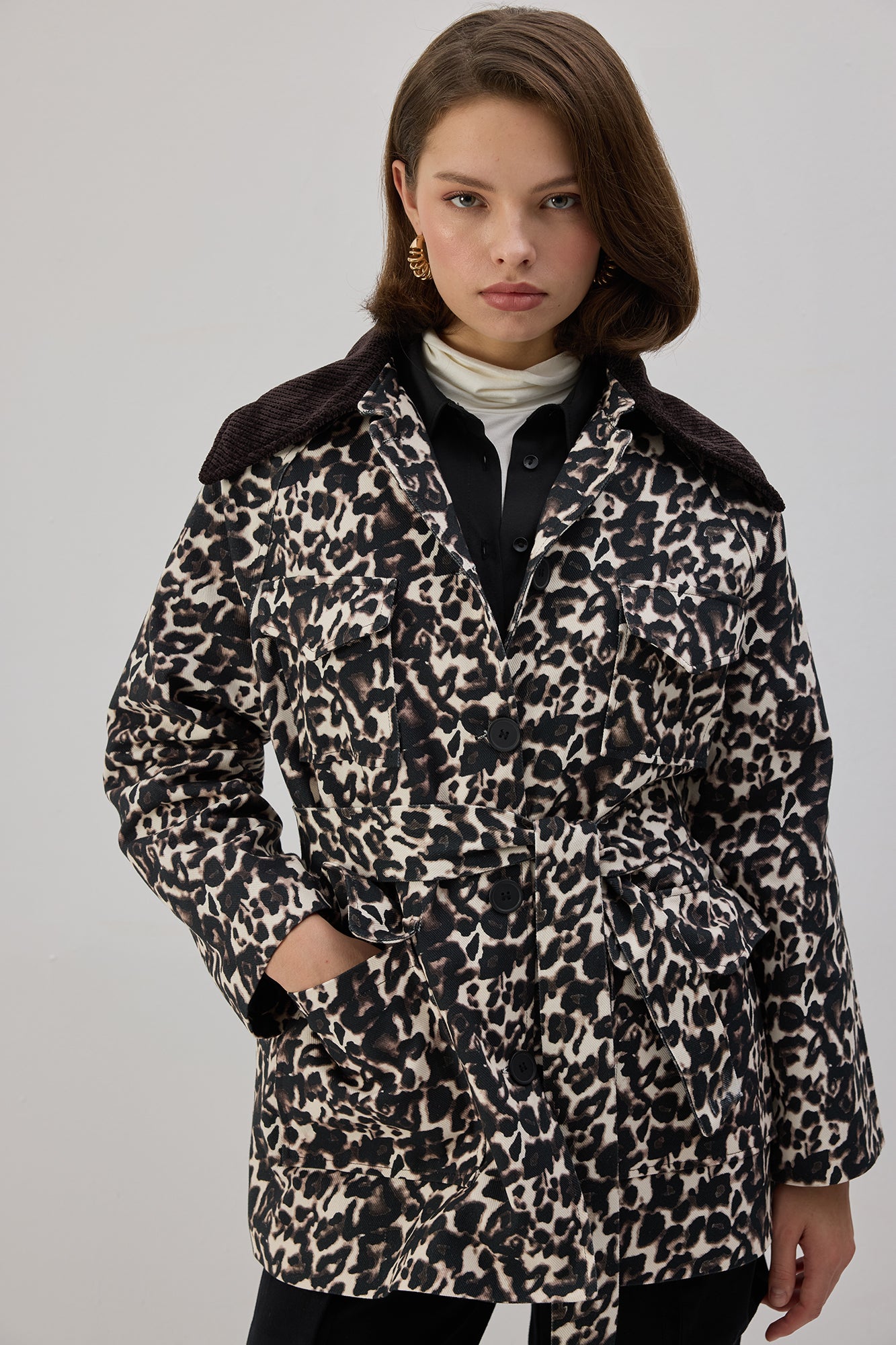 Önden düğmeli kapama. Leopar desenli. Kontrast kadife yaka. Ön yüzeyde kapaklı cep detaylı.