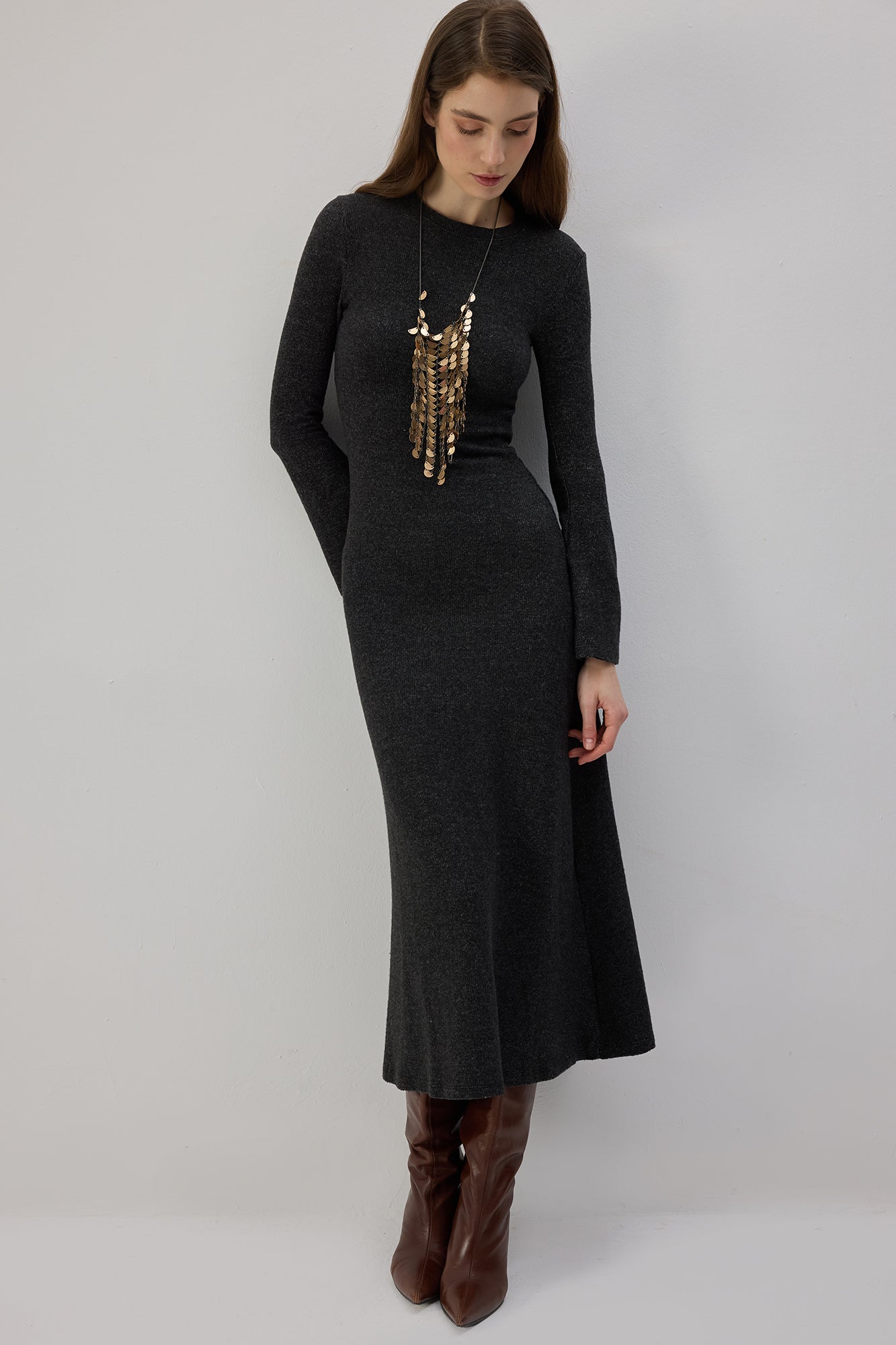 Bisiklet yaka. Uzun kollu. Triko. Midi boy.