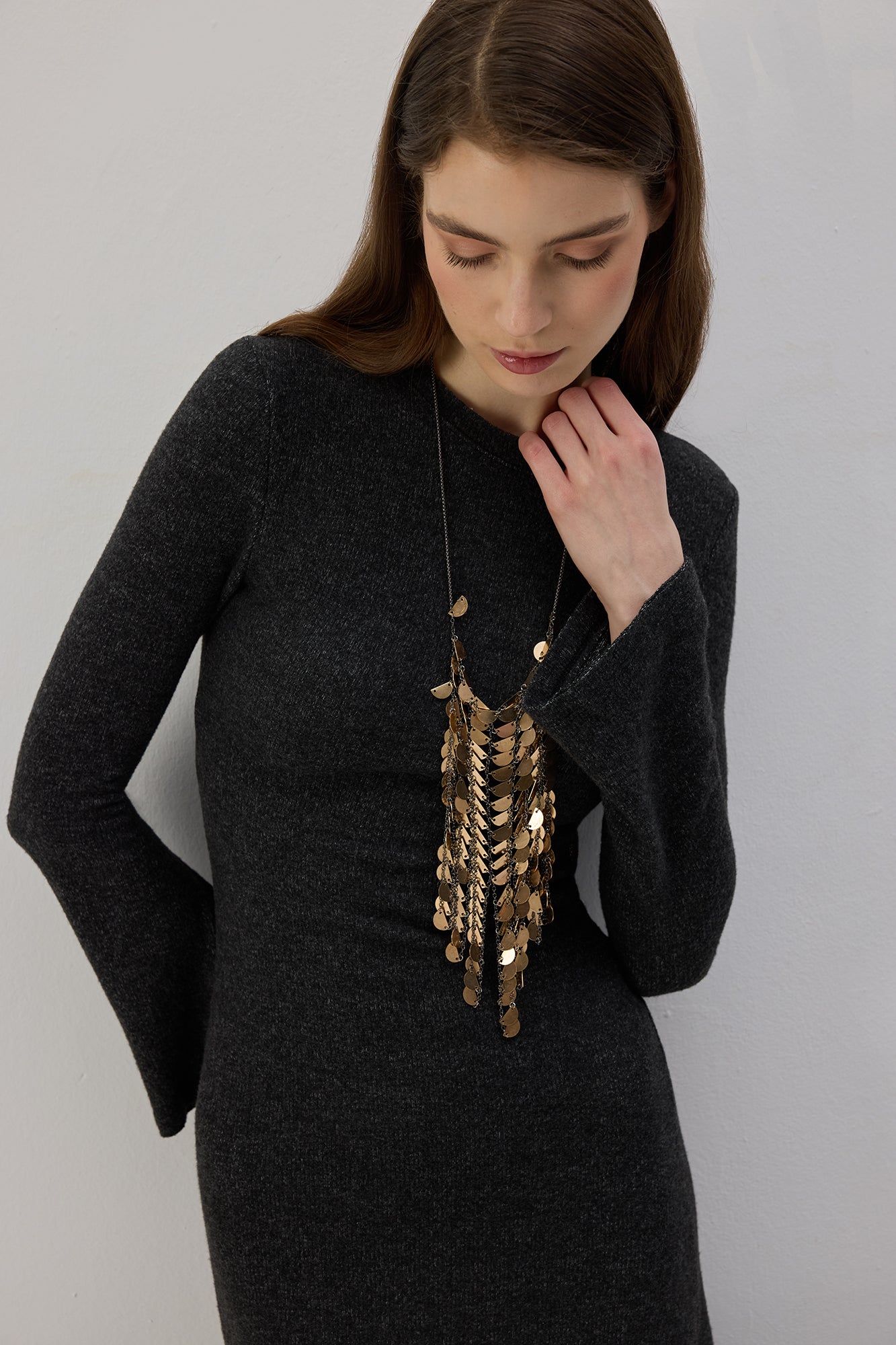 Midi–uzun boy kesimi sayesinde hem günlük hem de daha şık kombinlere uyum sağlayan bu elbise; botlar, çizmeler veya topuklu ayakkabılarla kolayca tamamlanabilir. Tek başına güçlü bir stil parçası olan tasarım, aksesuarlarla zenginleştirildiğinde akşam davetleri ve özel günler için de tercih edilebilir.