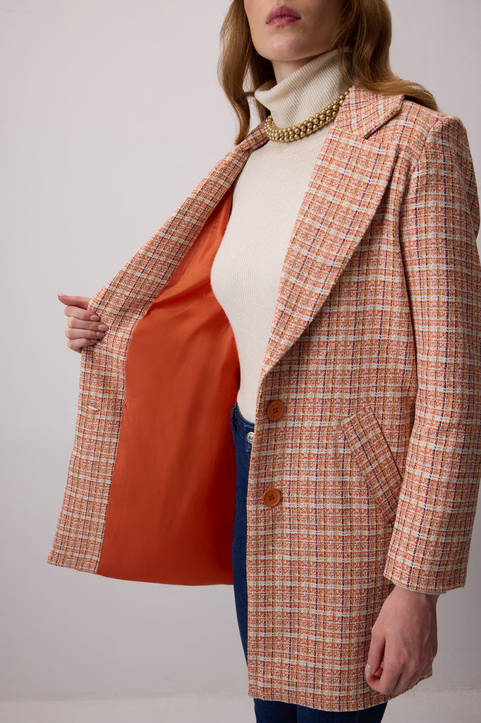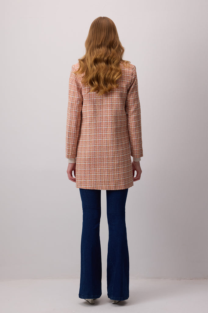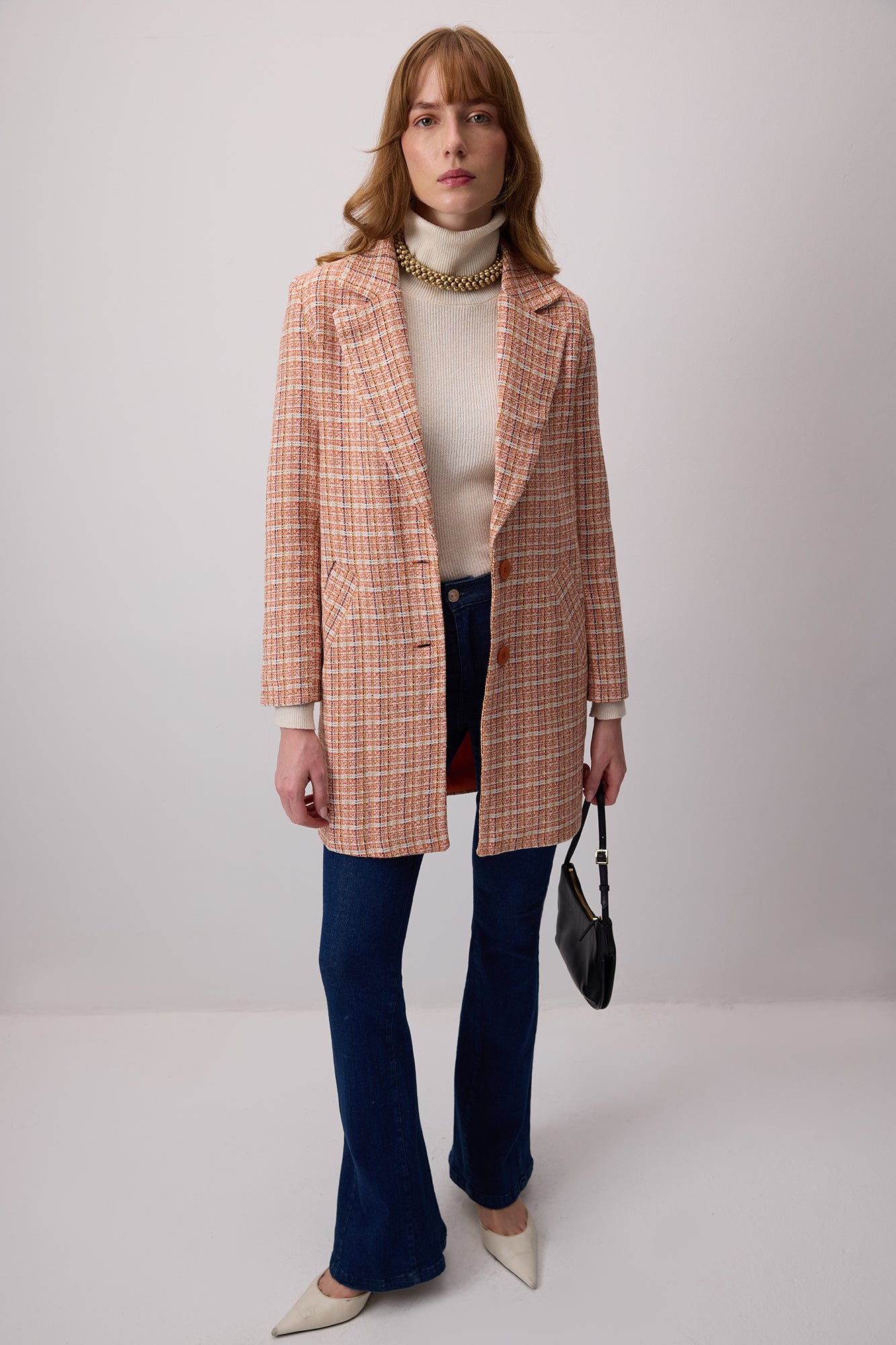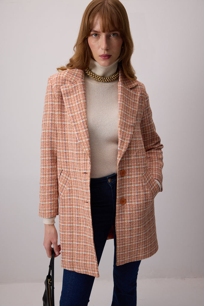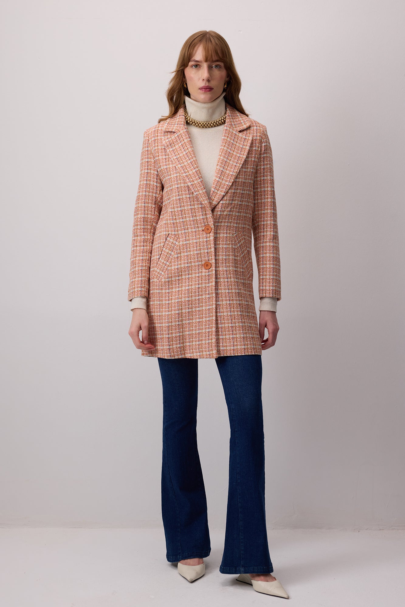 Çentik yaka. Uzun kollu. Ekoseli. Tüvit. Önden düğme kapamalı.