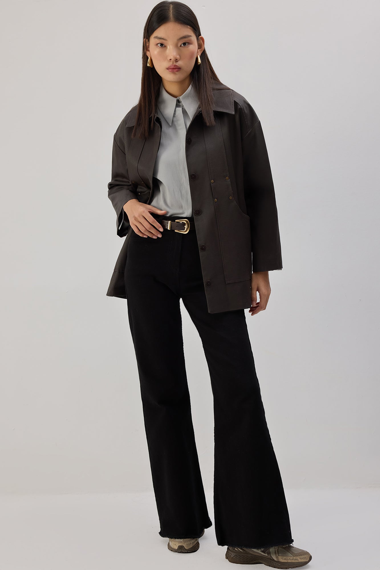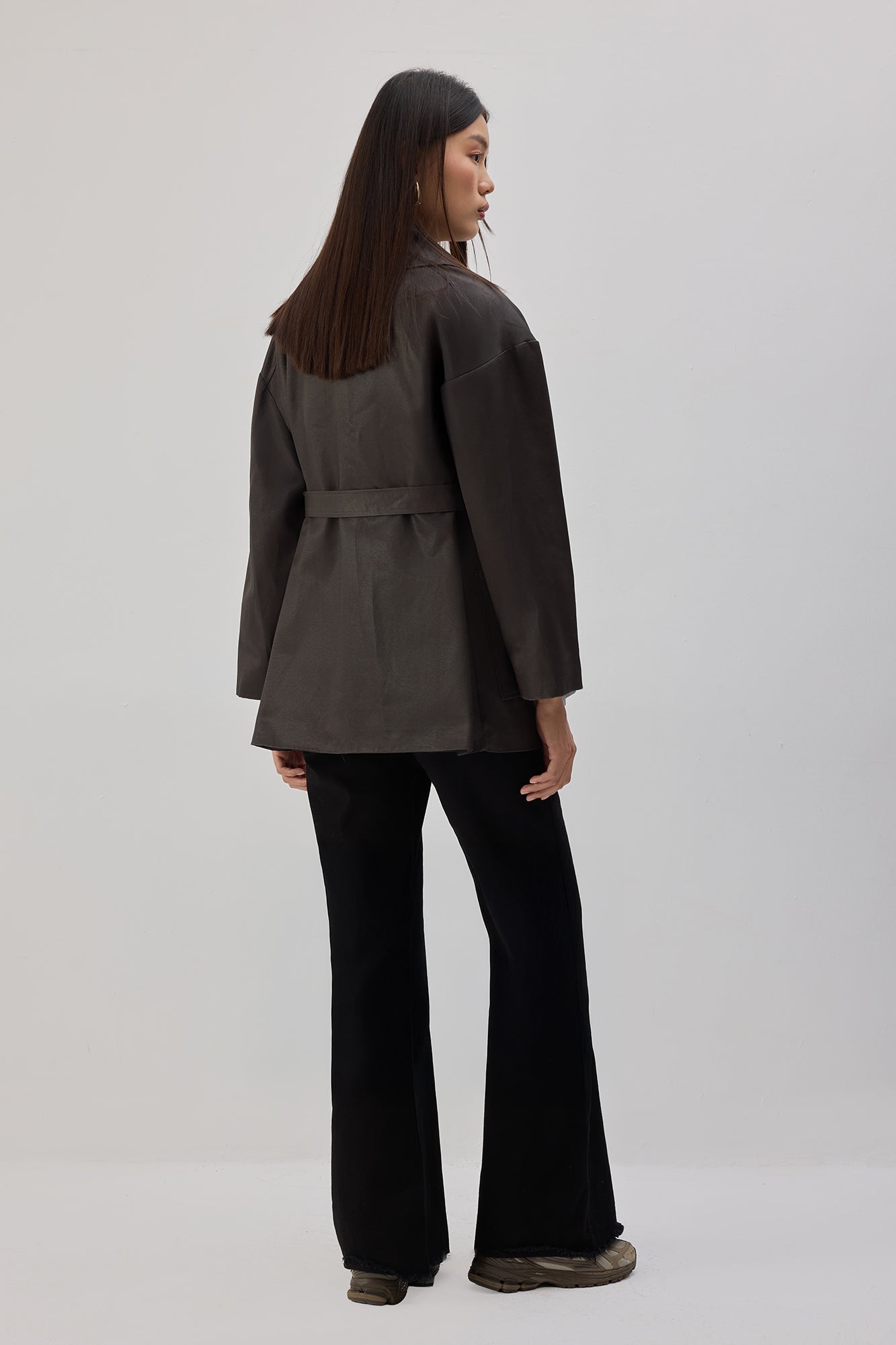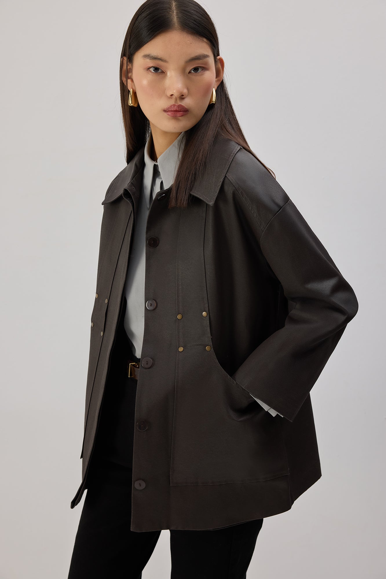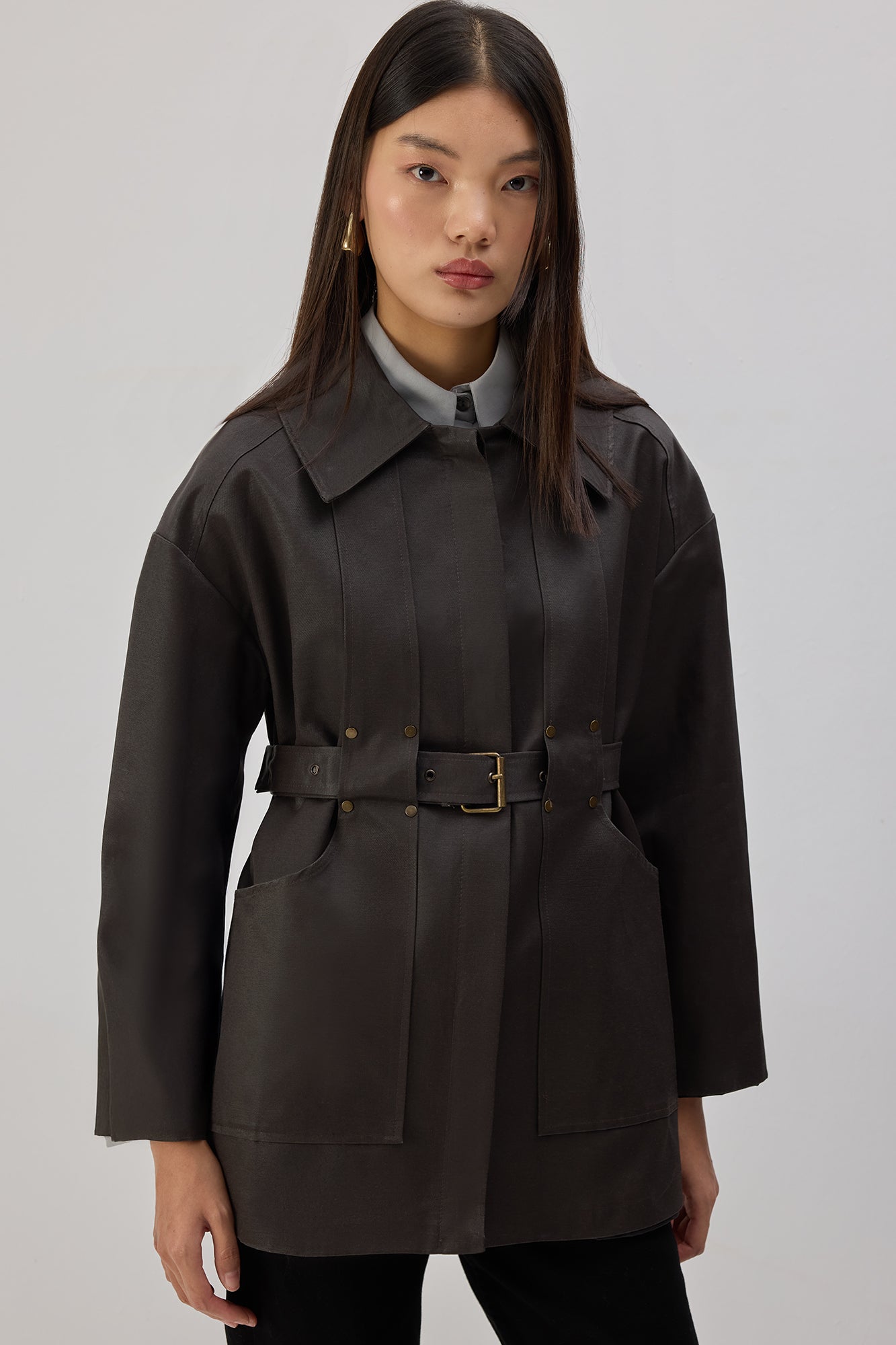 Klasik yaka. Önde düğme kapama. Mumlu apre yüzey dokusu. Ön ceplerde metal perçin detaylı. Yanlarda geçirgen kemer tüneli ve çıkarılabilir kemer.