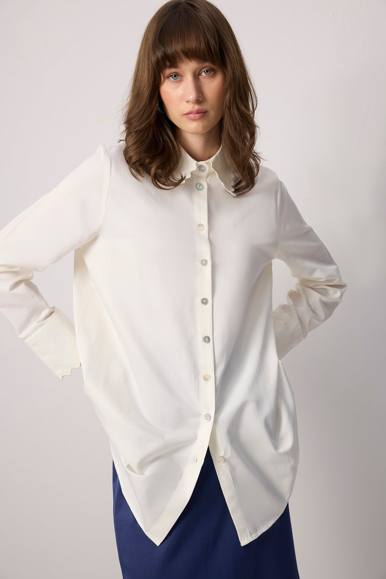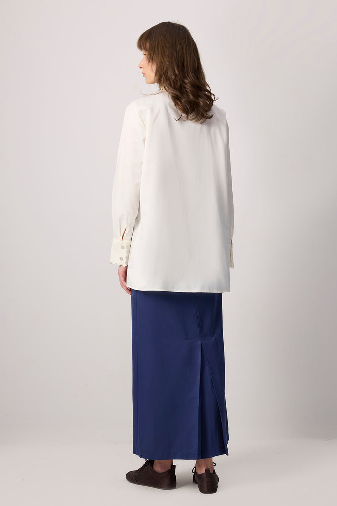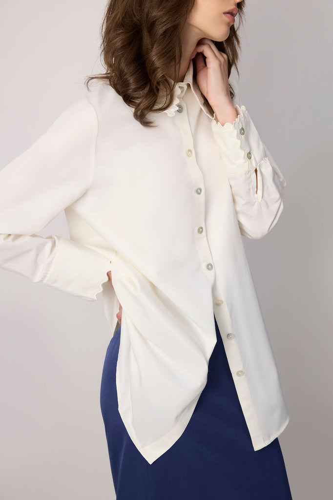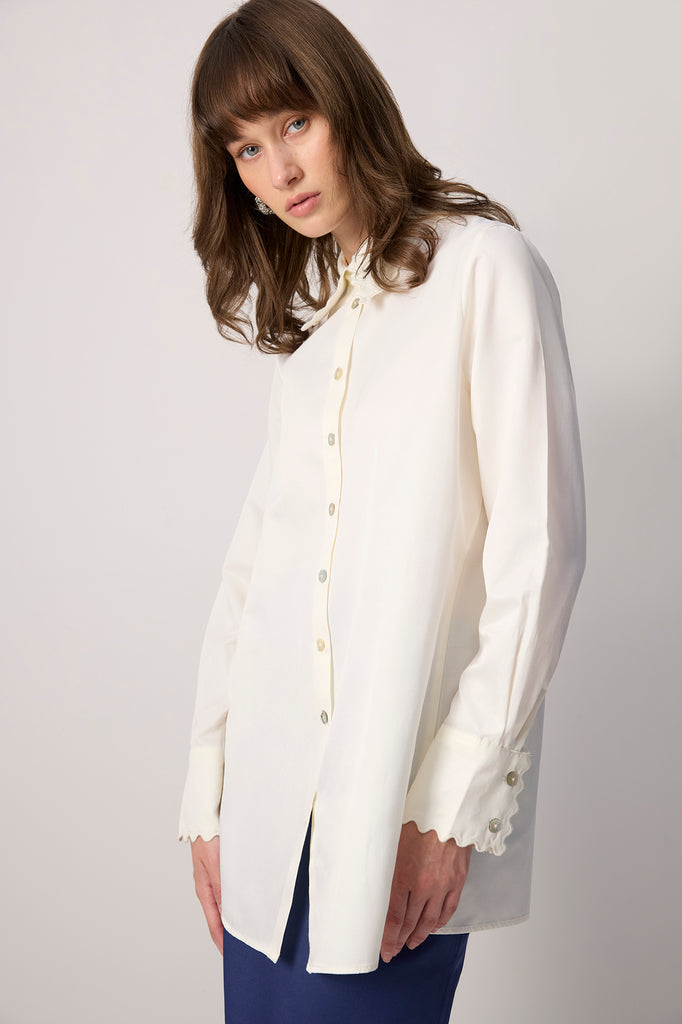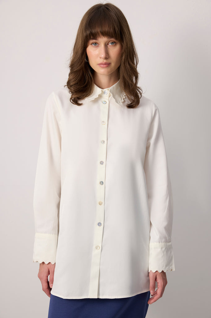 Pamuklu. Gömlek yaka. Ön ve manşetler düğme kapamalı. Nakış detaylı yaka ve manşetler.