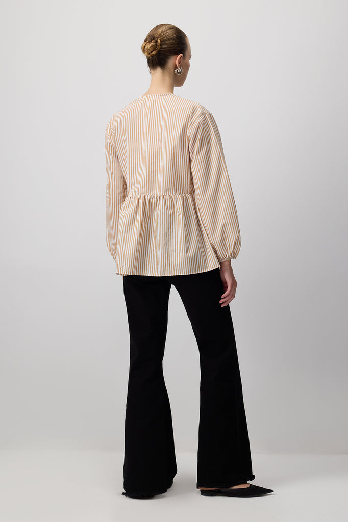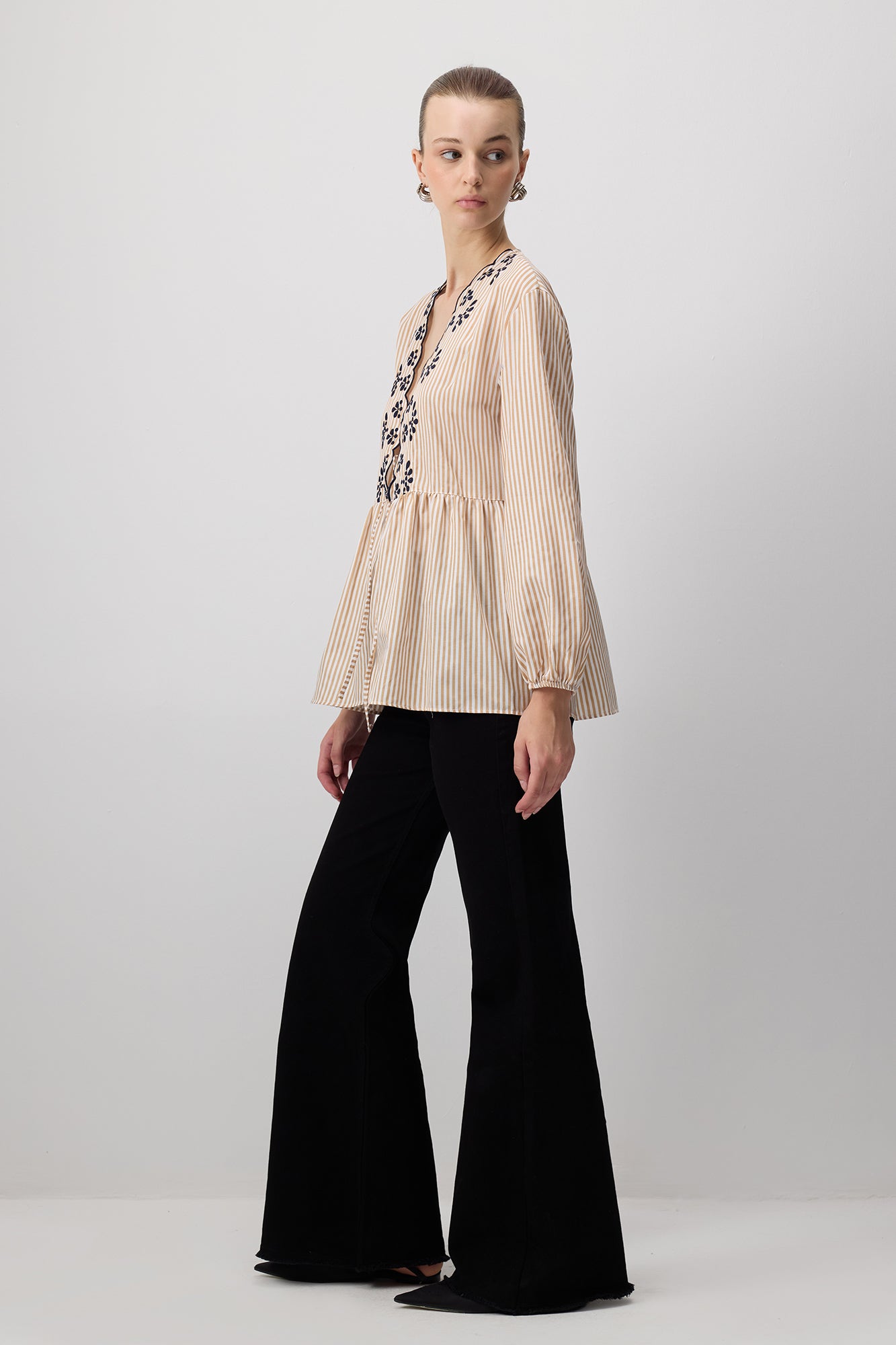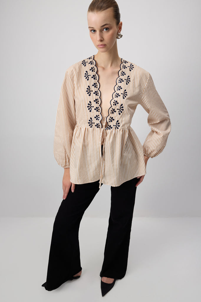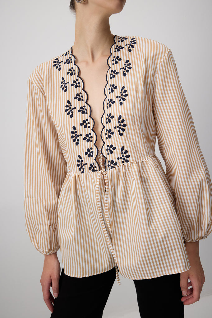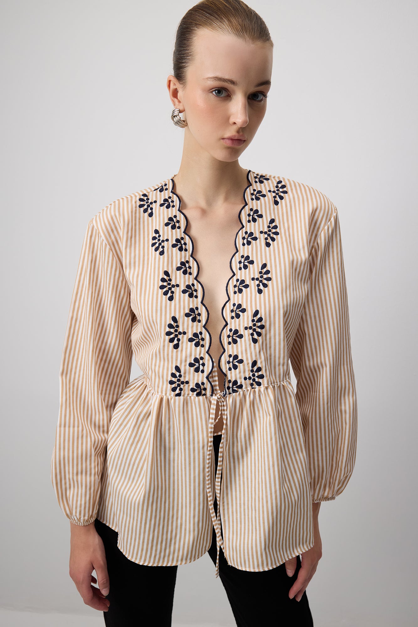 Nakış işlemeli. Uzun kollu. Elastik manşet. Kontrast çizgili. Önden bağlama detaylı.