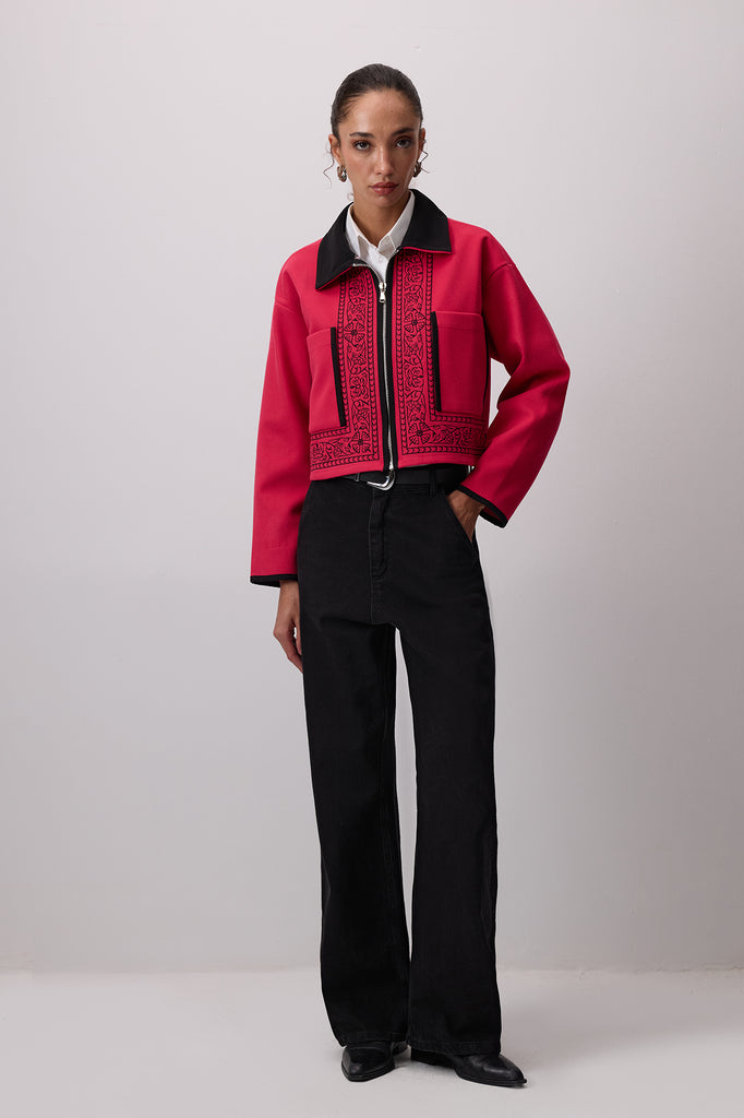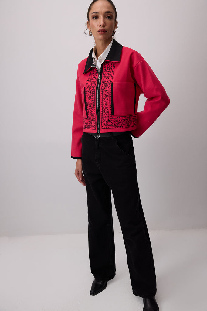 Klasik yaka. Uzun kollu. Nakışlı. Yama cepli. Önden fermuar kapama.