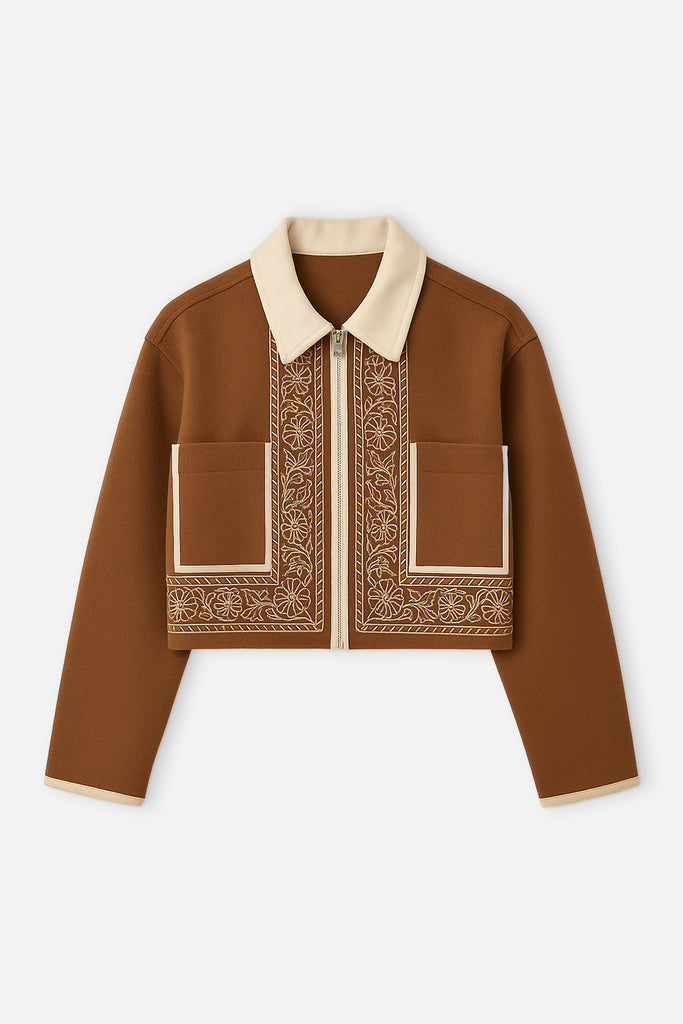 Klasik yaka. Uzun kollu. Nakışlı. Yama cepli. Önden fermuar kapama.