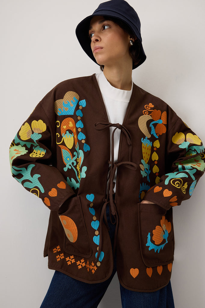 %100 Pamuklu gabardin kumaş. V yaka. Önden ayarlanabilir biye bağlamalı. Çift cepli. Önde ve kollarda renkli nakış süslemeli. Oversize.