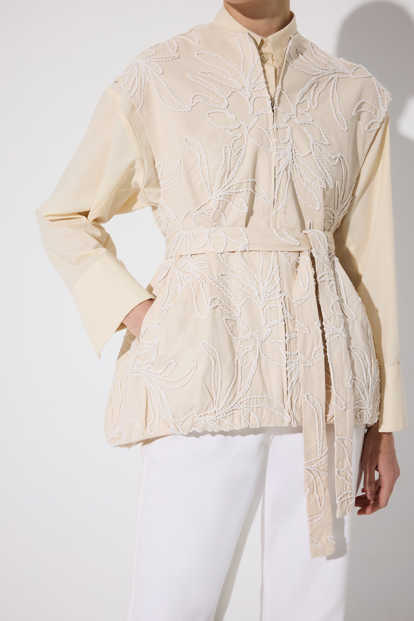 Kolsuz. Önü fermuar kapamalı. Beli kuşaklı. Yan cepli.