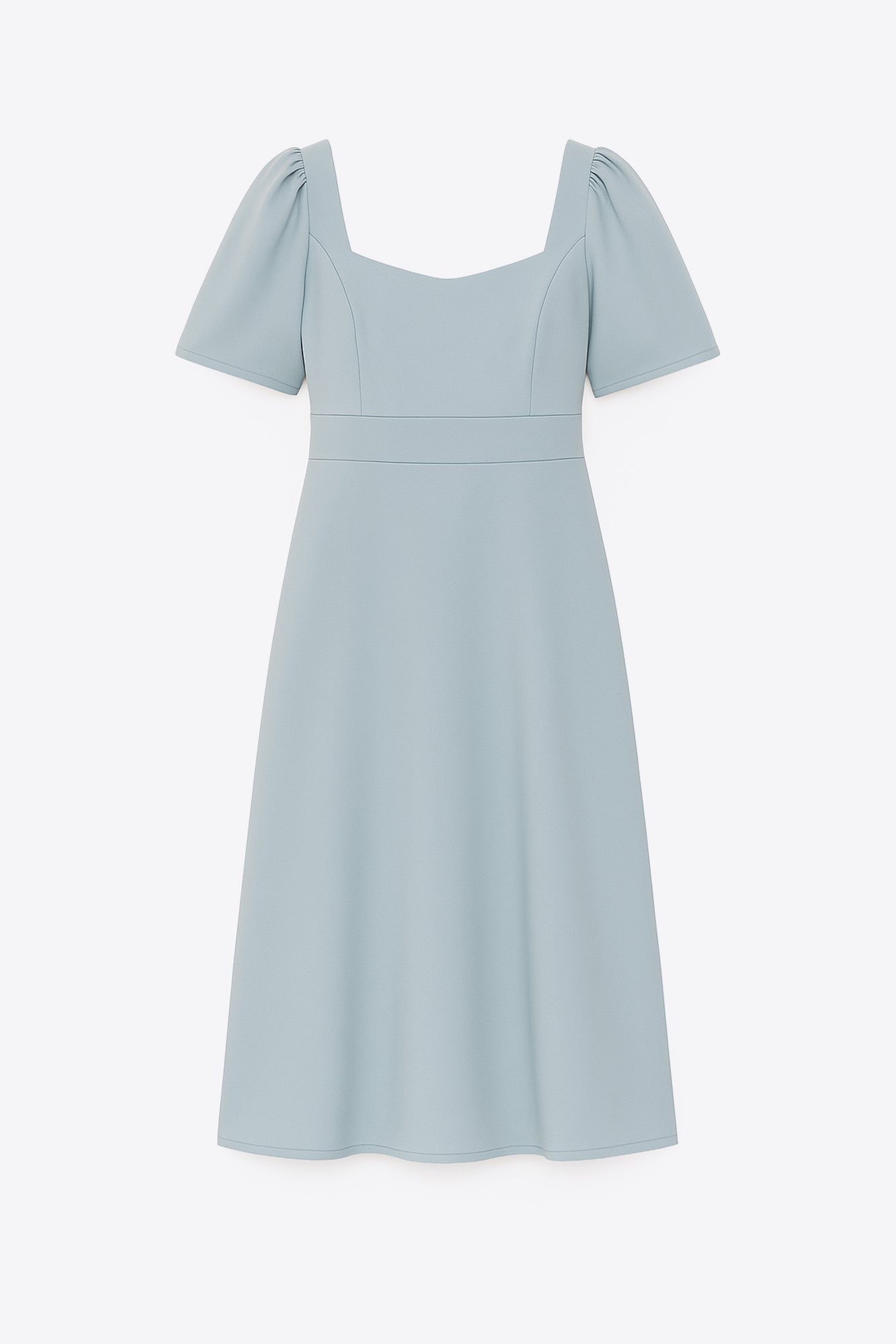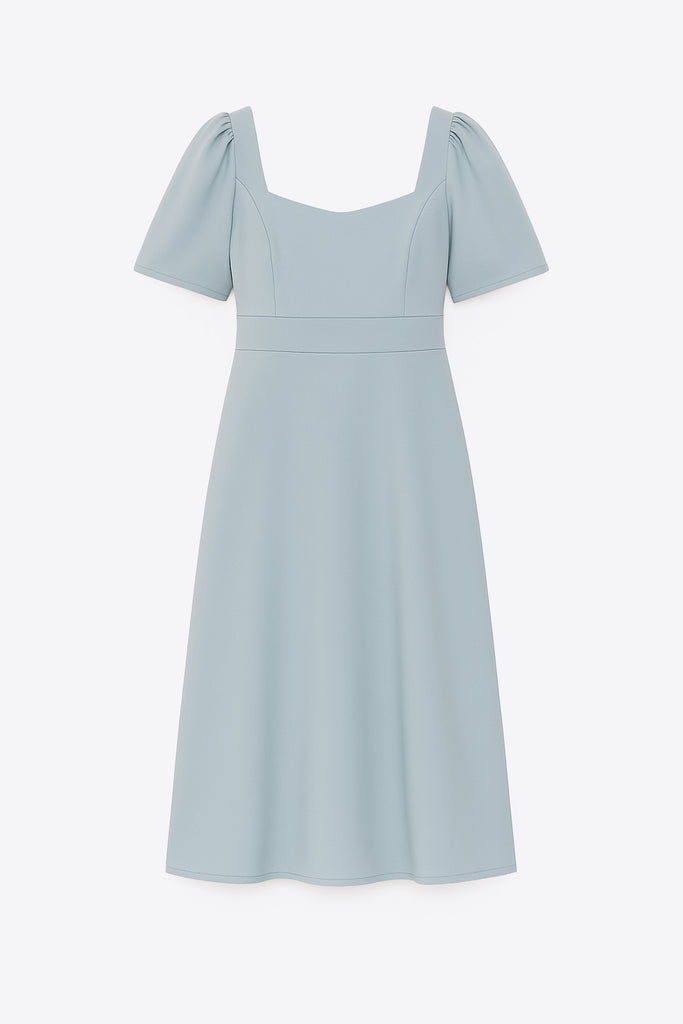 Kare yaka. Kısa kollu. Arka gizli fermuar kapama.