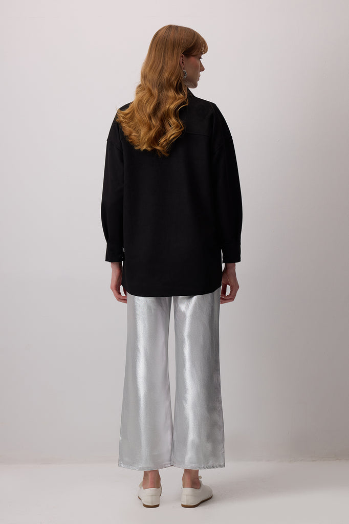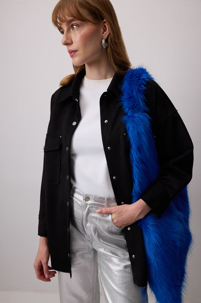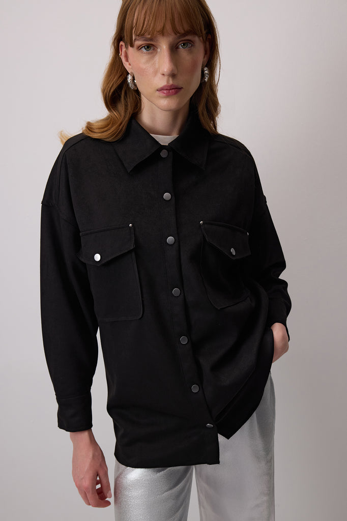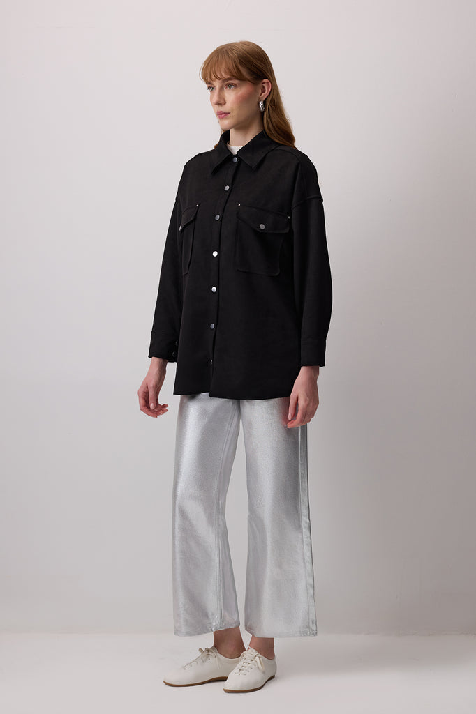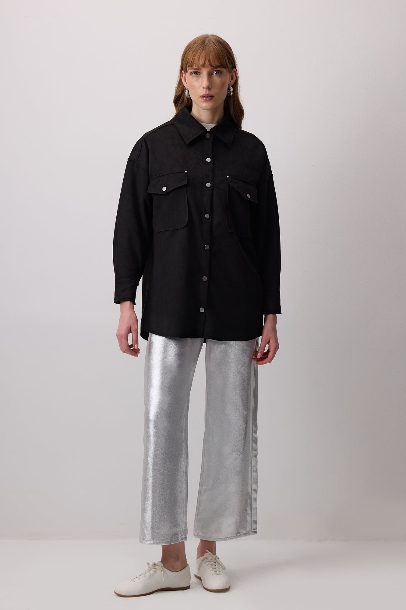 Klasik yaka. Uzun kollu ve manşetleri çıt çıt kapama. Göğüs hizasında kapaklı yama cep detaylar. Süet. Önden çıt çıt kapama.