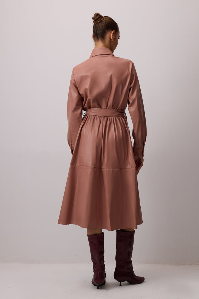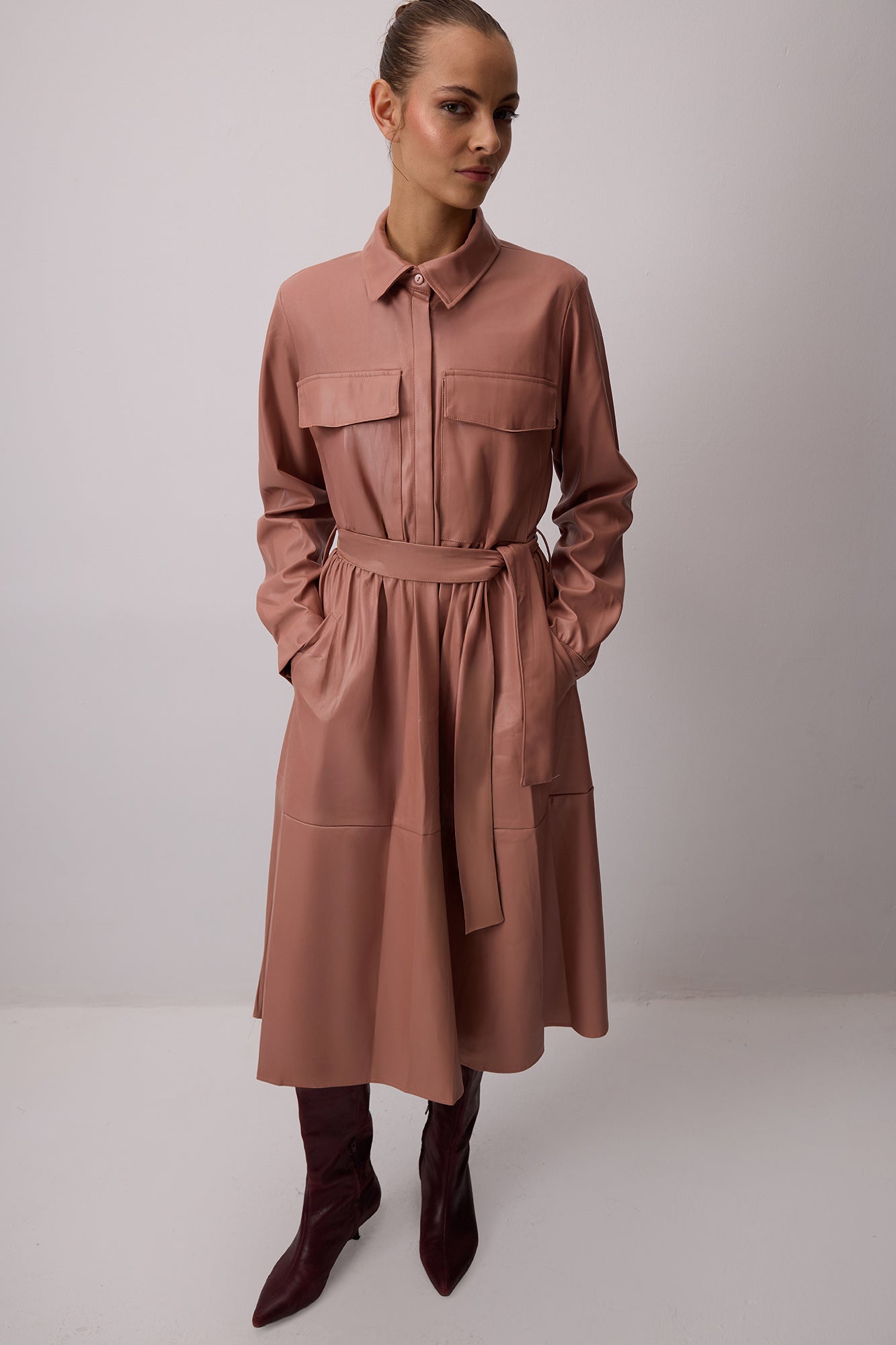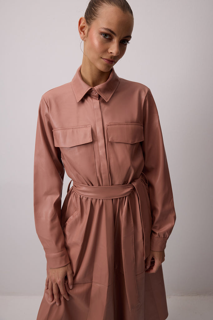 Klasik yaka. Uzun kollu ve manşetleri düğmeli. Göğüs hizasında kapaklı yam cepli. Kemer köprülü ve kuşaklı. Önden yarım düğme kapamalı. Deri elbise.