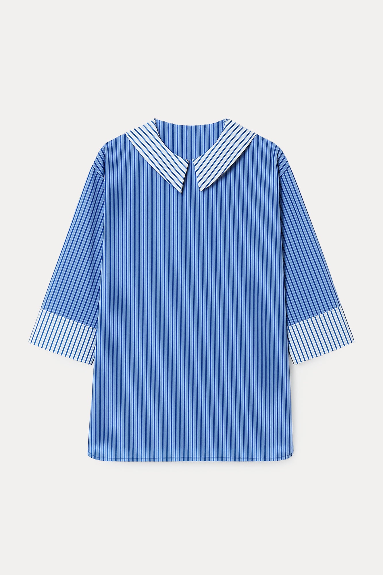 Kontrast renkli çizgili yaka. Uzun kollu ve düşük omuzlu. Organze.