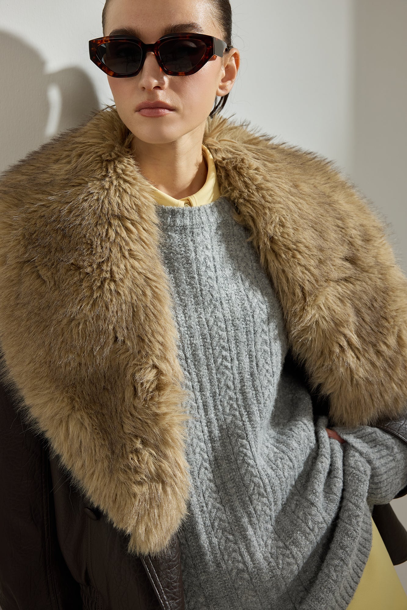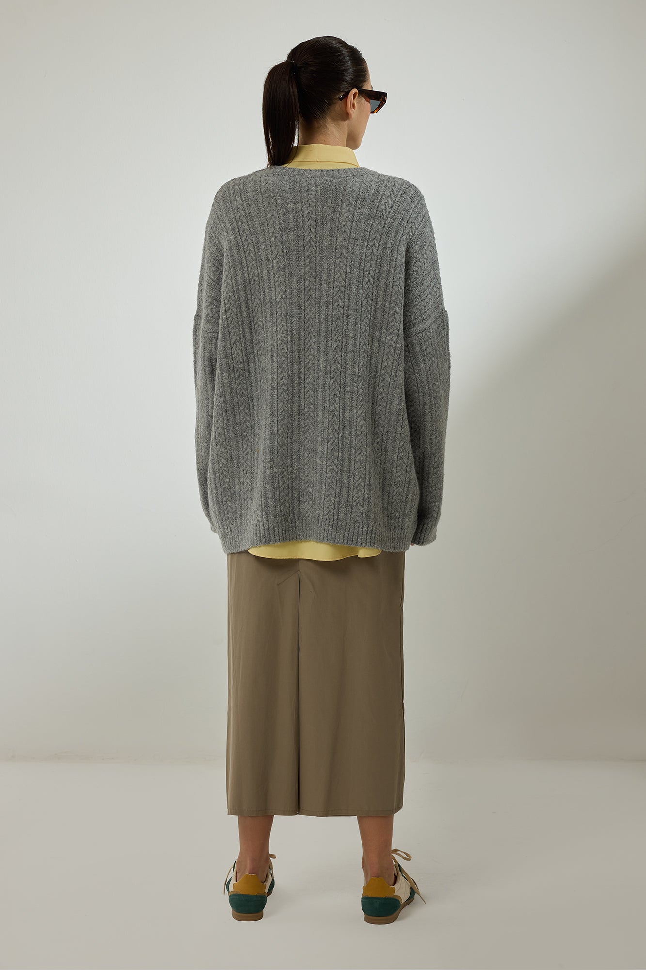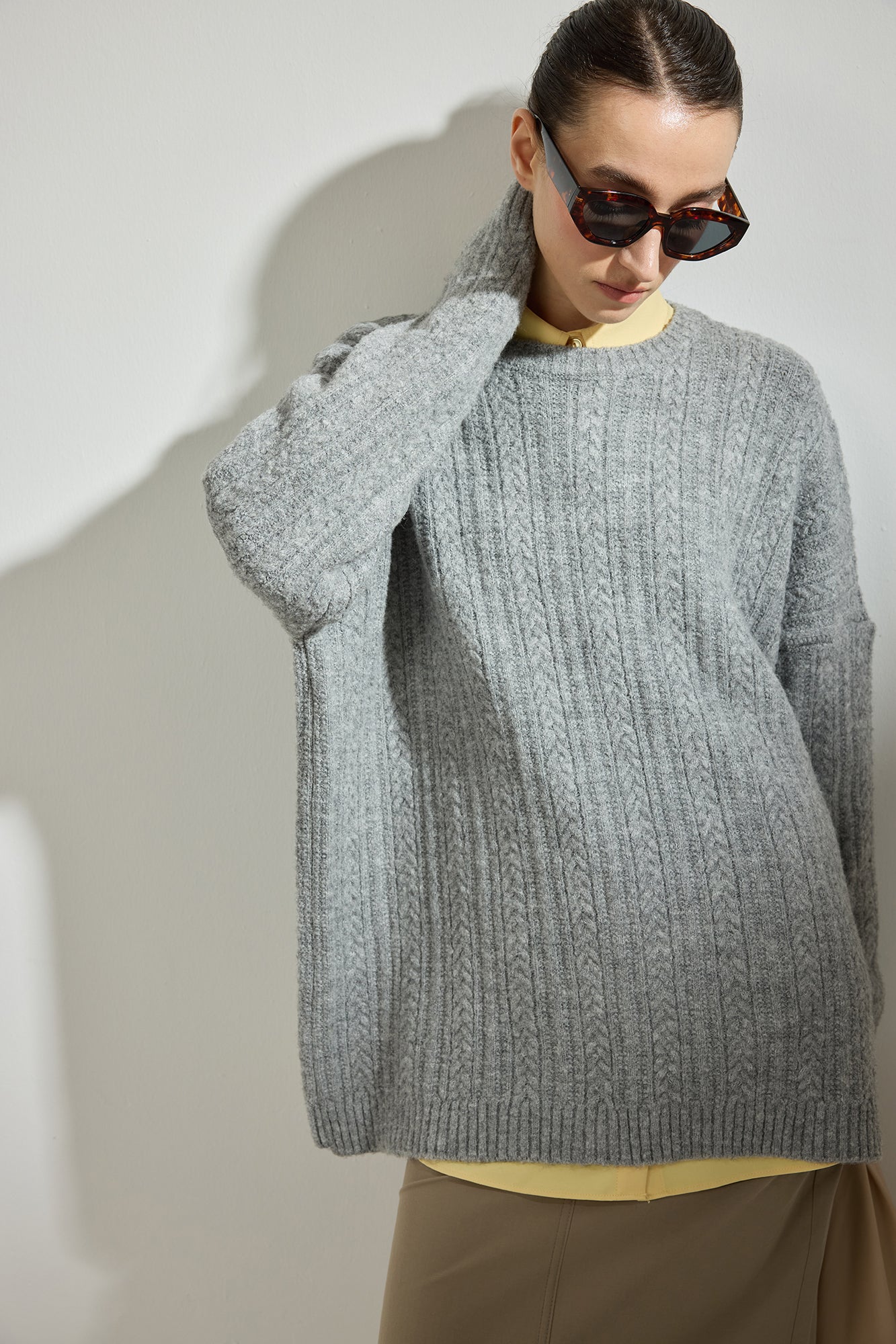 Bisiklet yaka. Düşük omuz. Örgülü. Triko kazak.