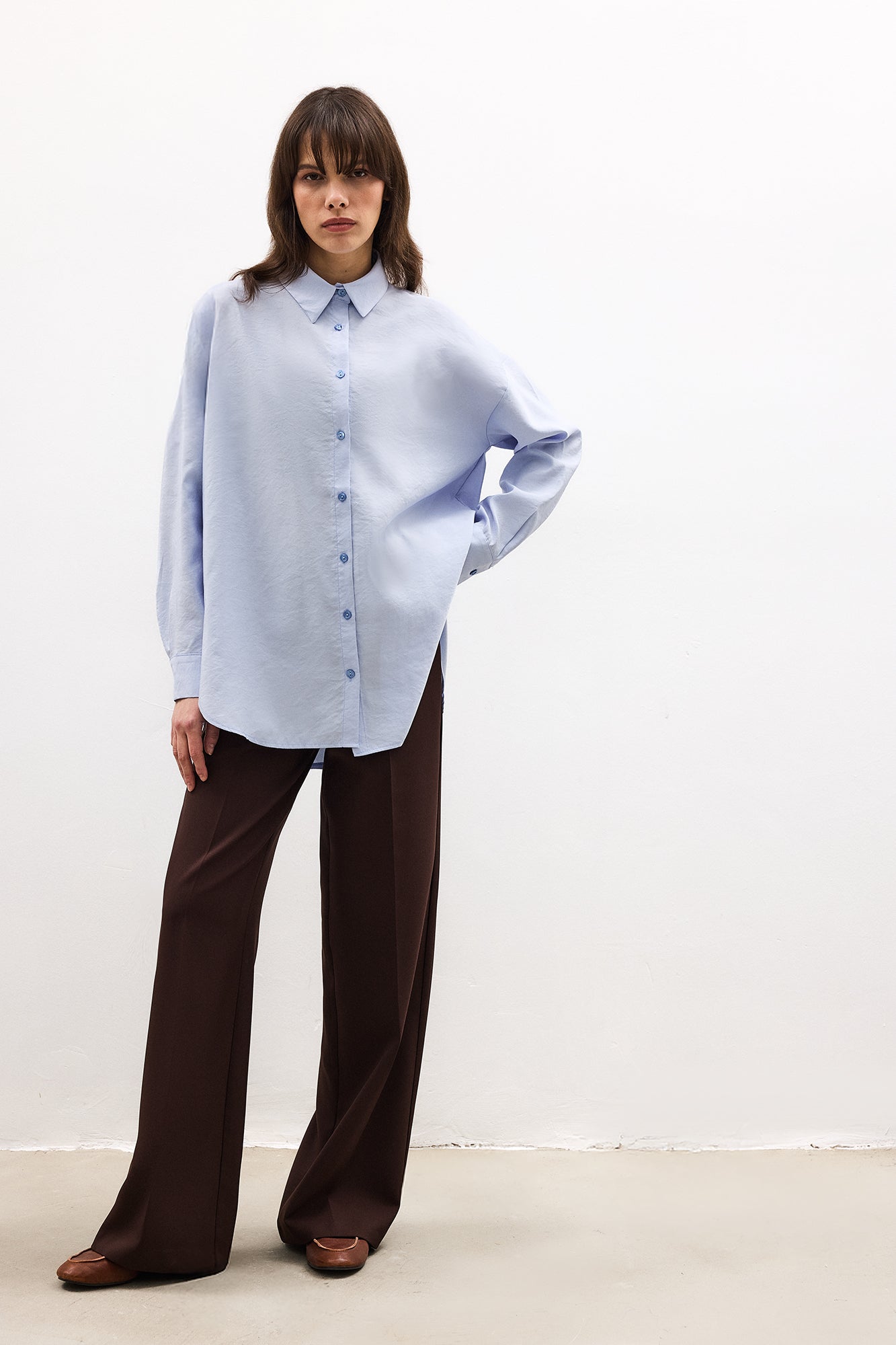 Gömlek yaka. Önü düğme kapamalı. Uzun kollu. Oversize.
