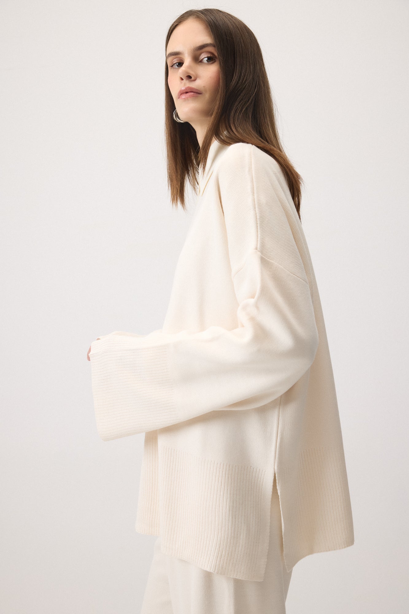 Rahat kesim kazak ve geniş paça pantolondan oluşan triko takım. Yumuşak dokulu.