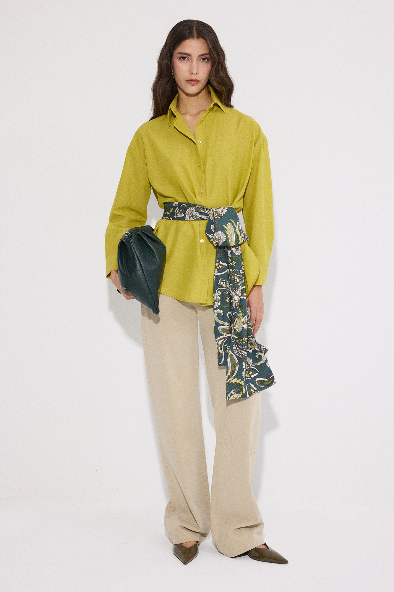 Gömlek yaka. Önü düğme kapamalı. Uzun kollu. Oversize.