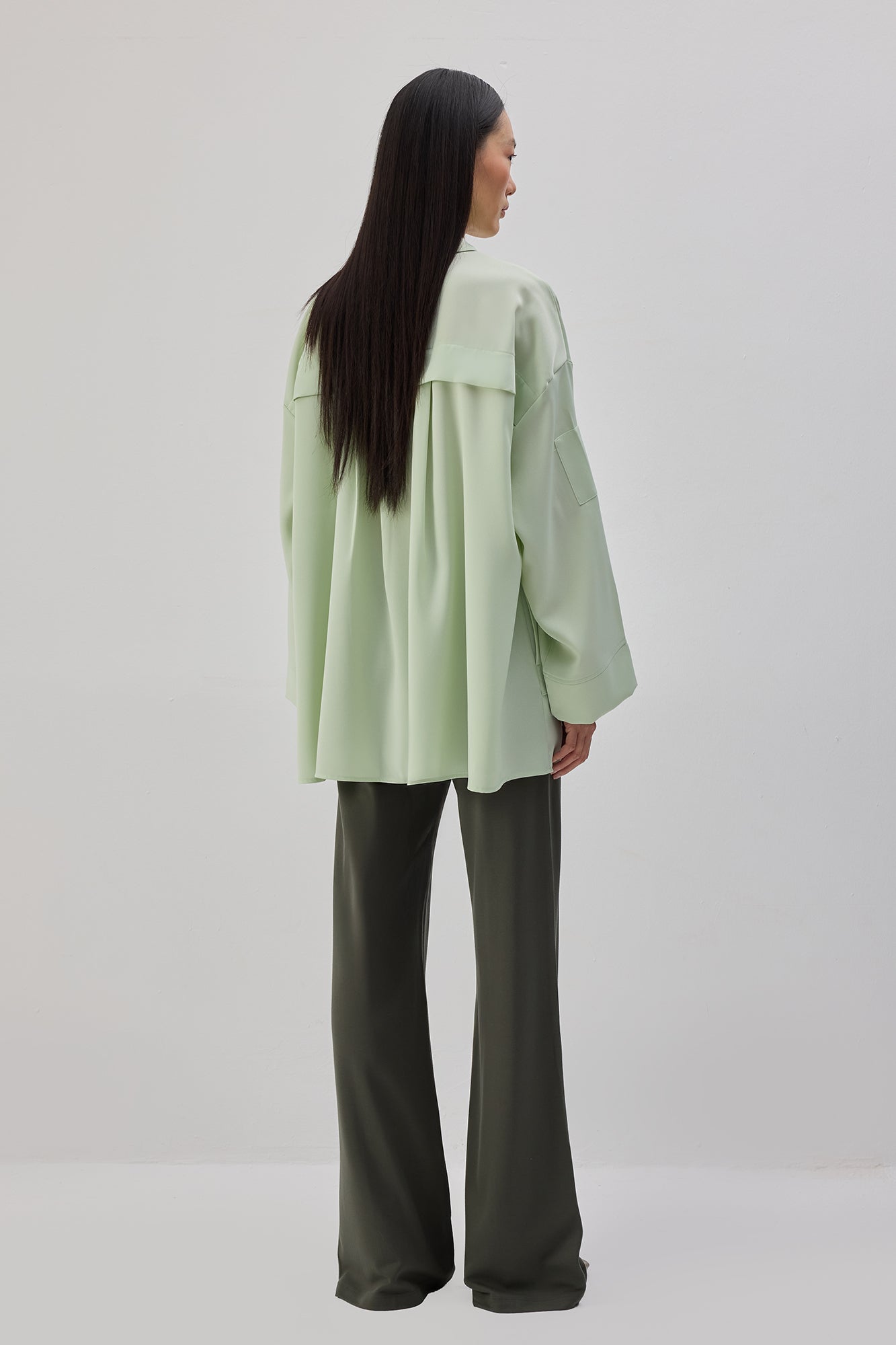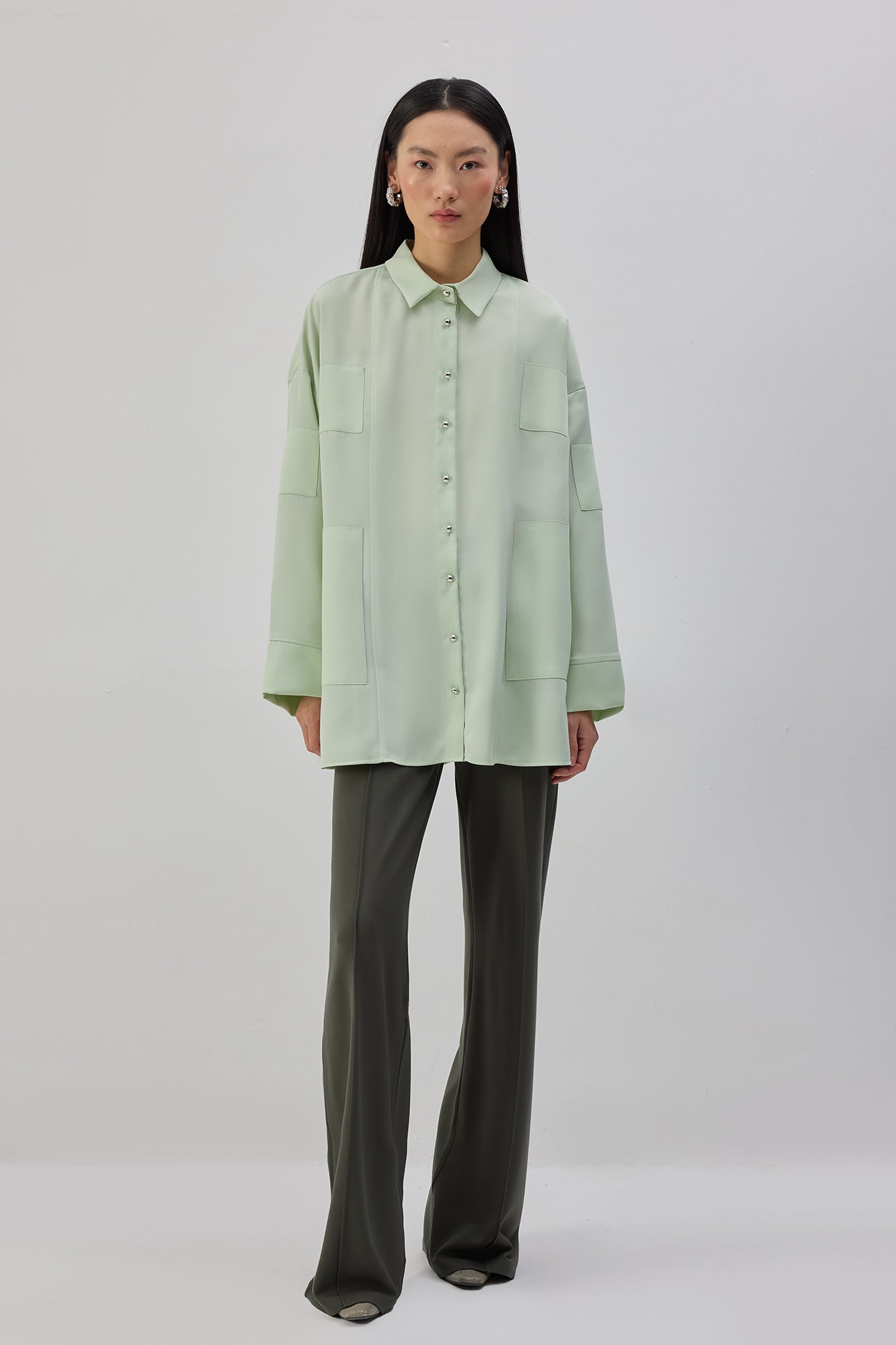 Gömlek yaka. Uzun kollu. Öden düğme kapamalı. Fonksiyonel cep detaylı. Akıcı ve hafif dokulu. Oversize.