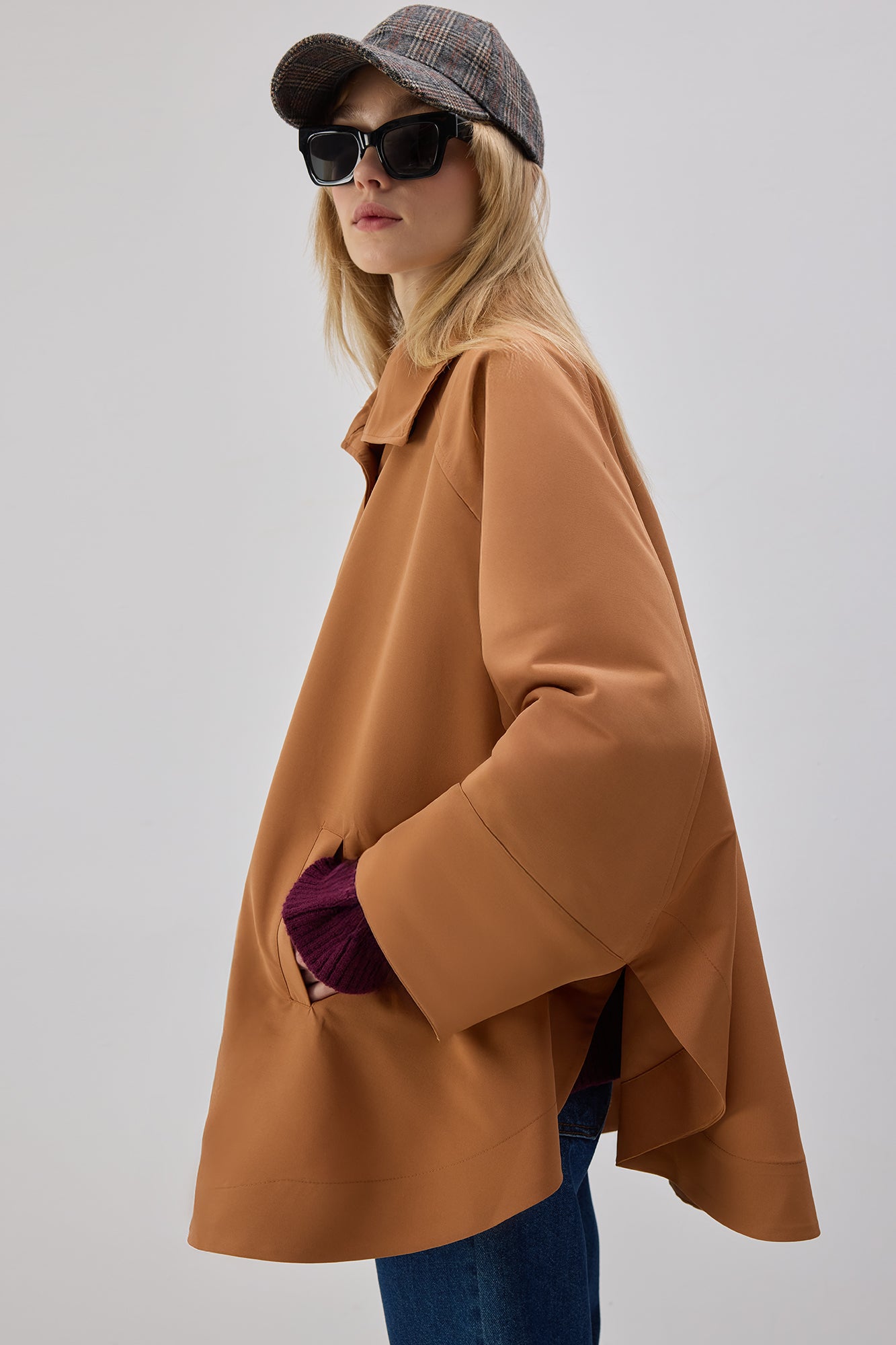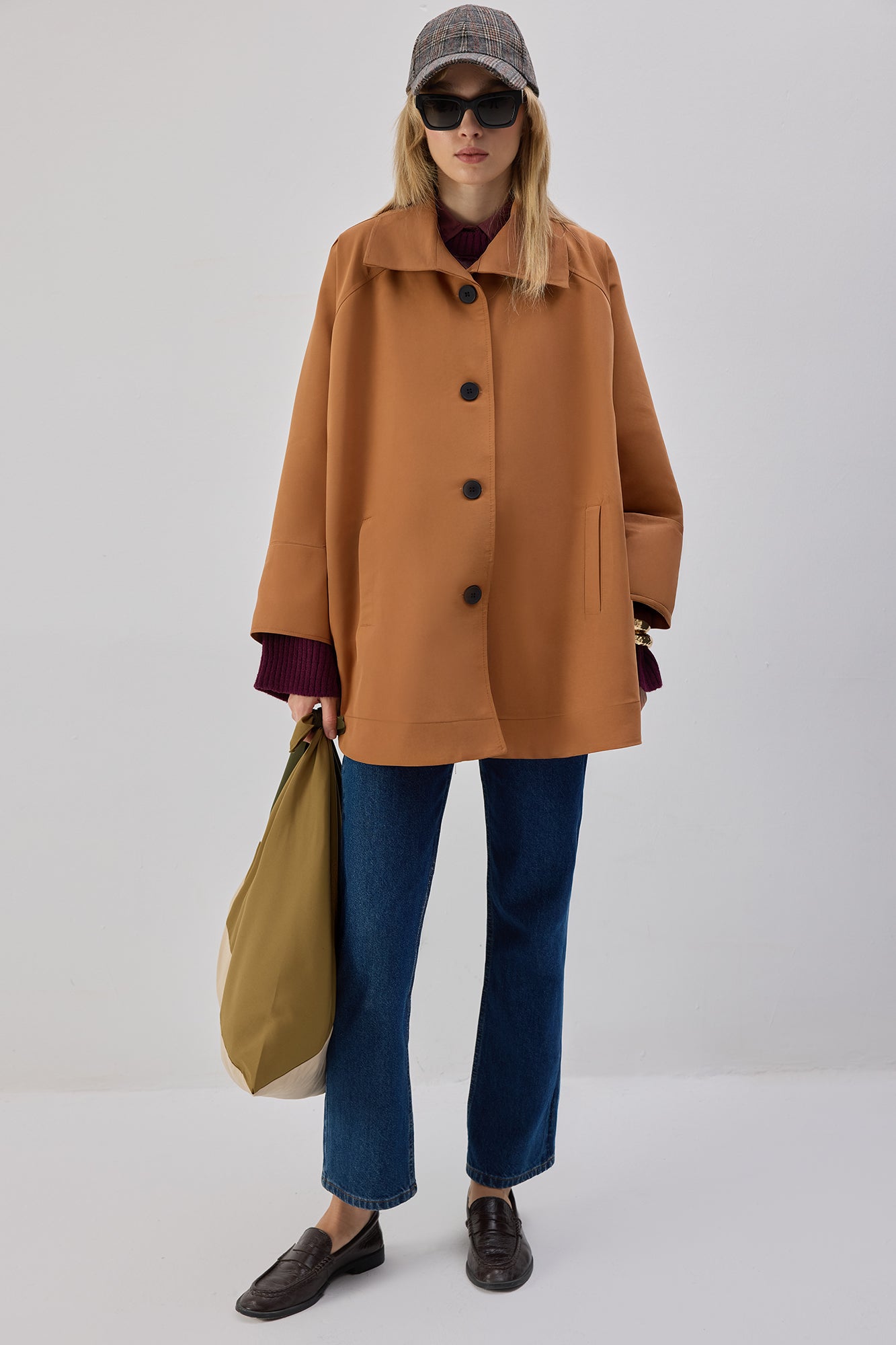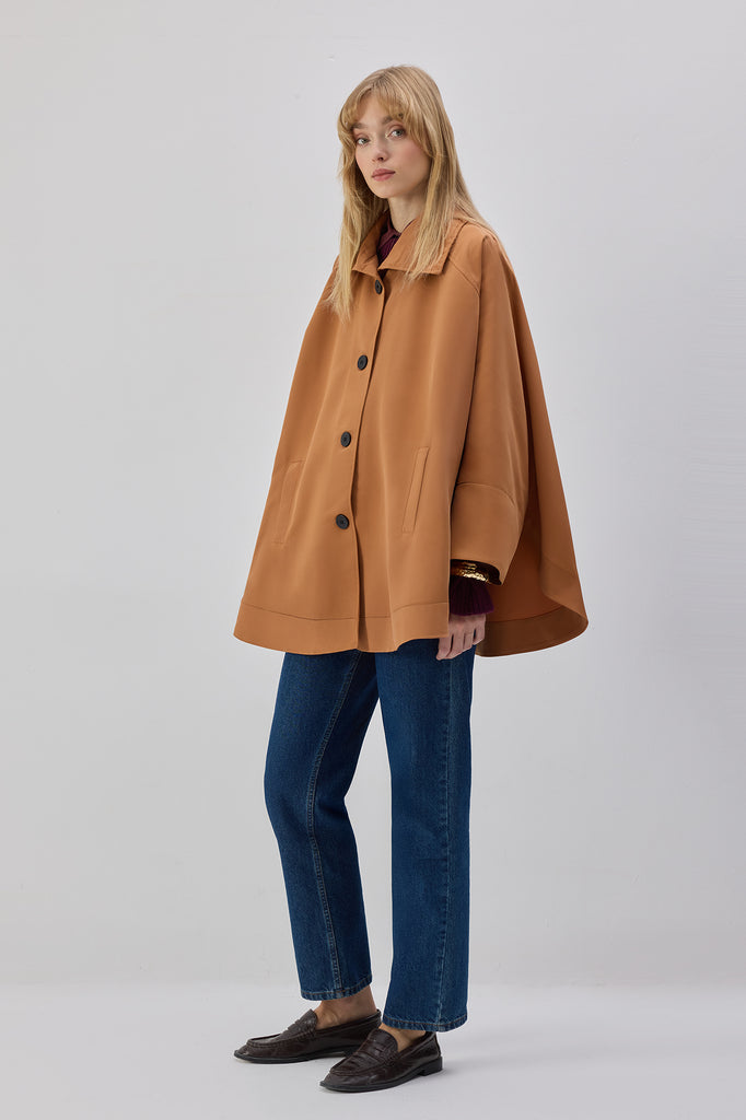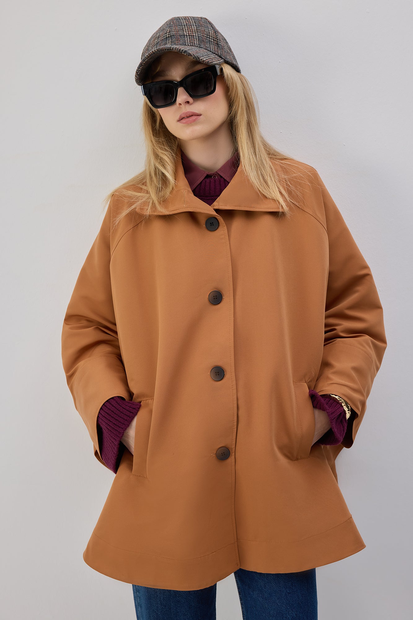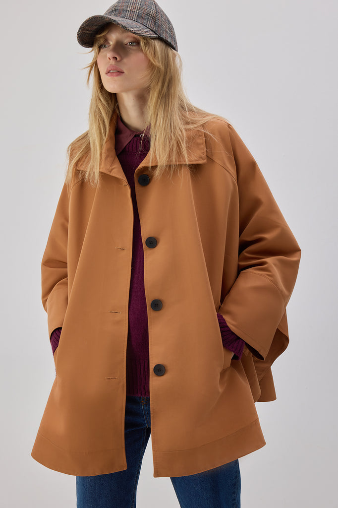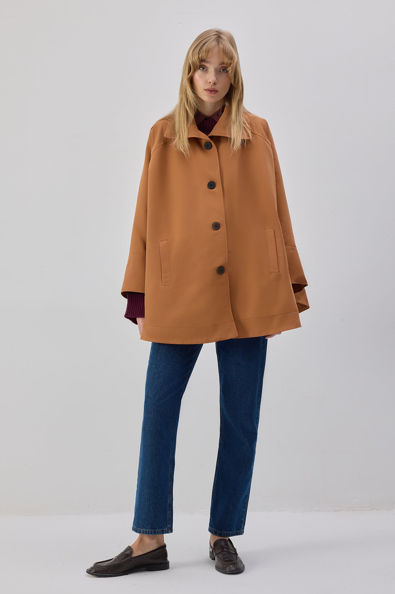 Geniş yakalı. Önden düğme kapamalı. Cepli.
