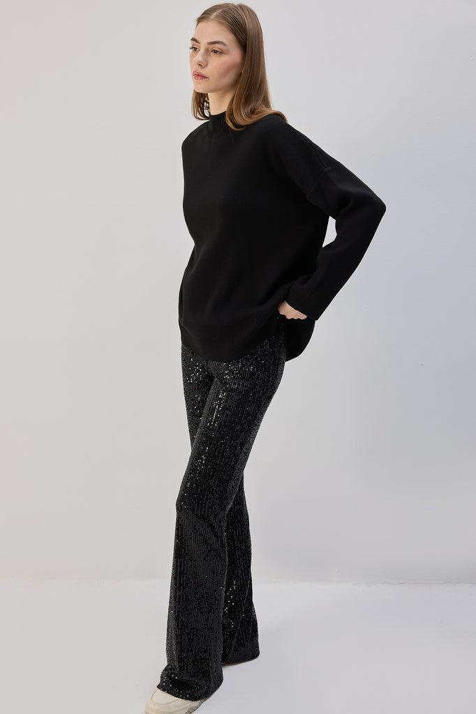 Payet kaplama, esnek yapıda, geniş paça detaylı pantolon.