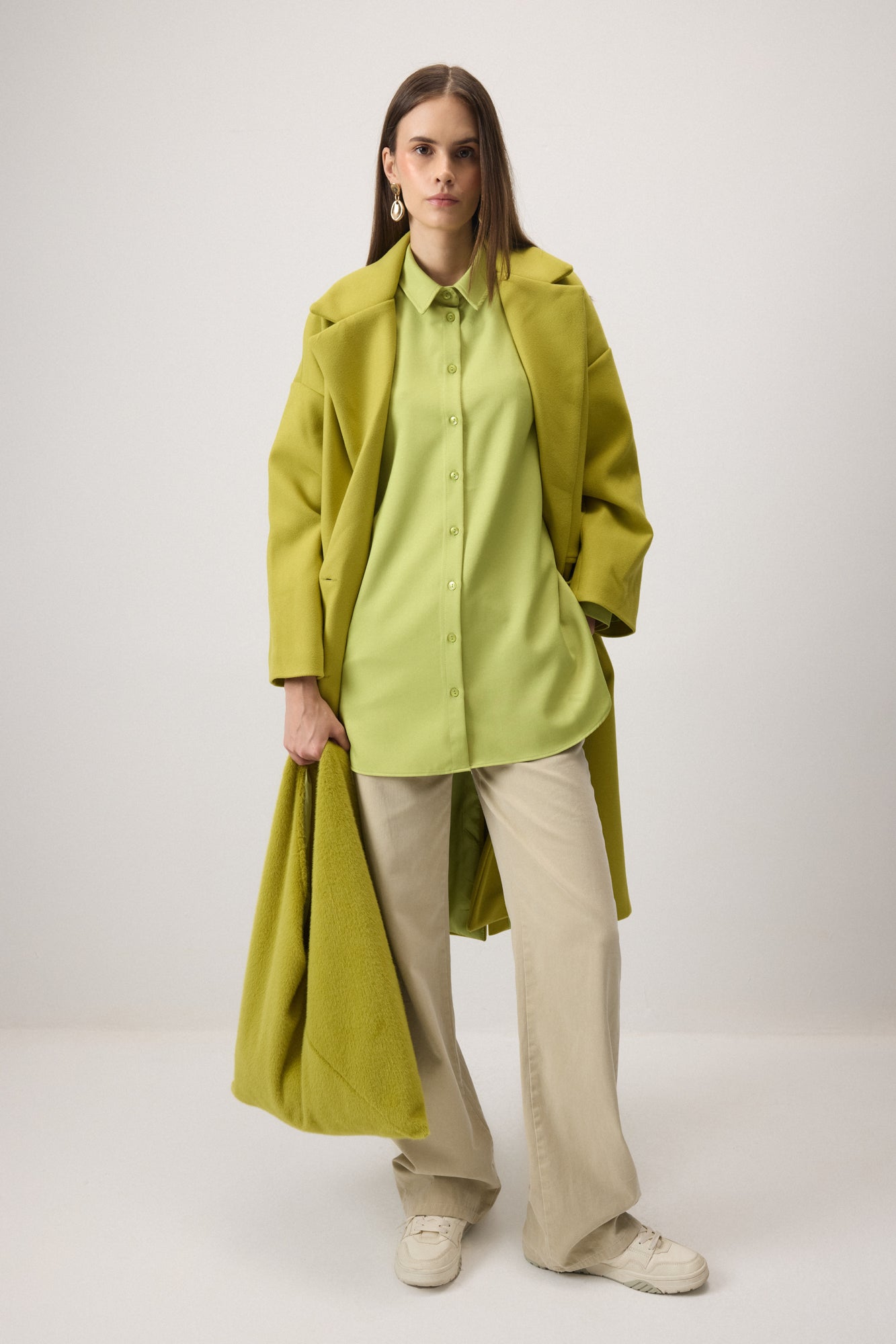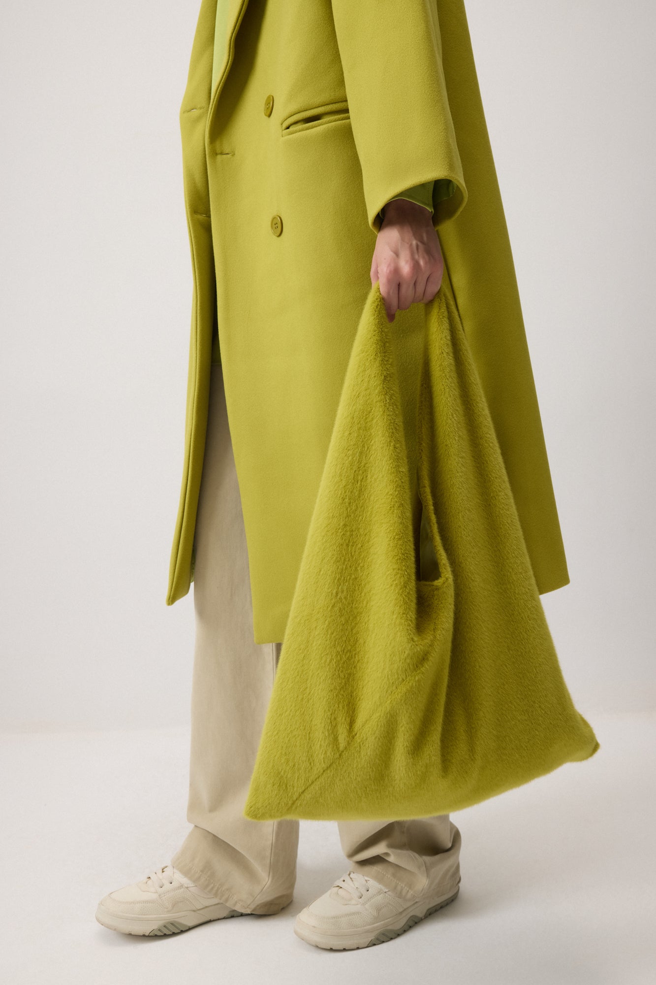 Yumuşak dokulu, geniş hacimli omuz çantası. Tek bölmeli. Üçgen form