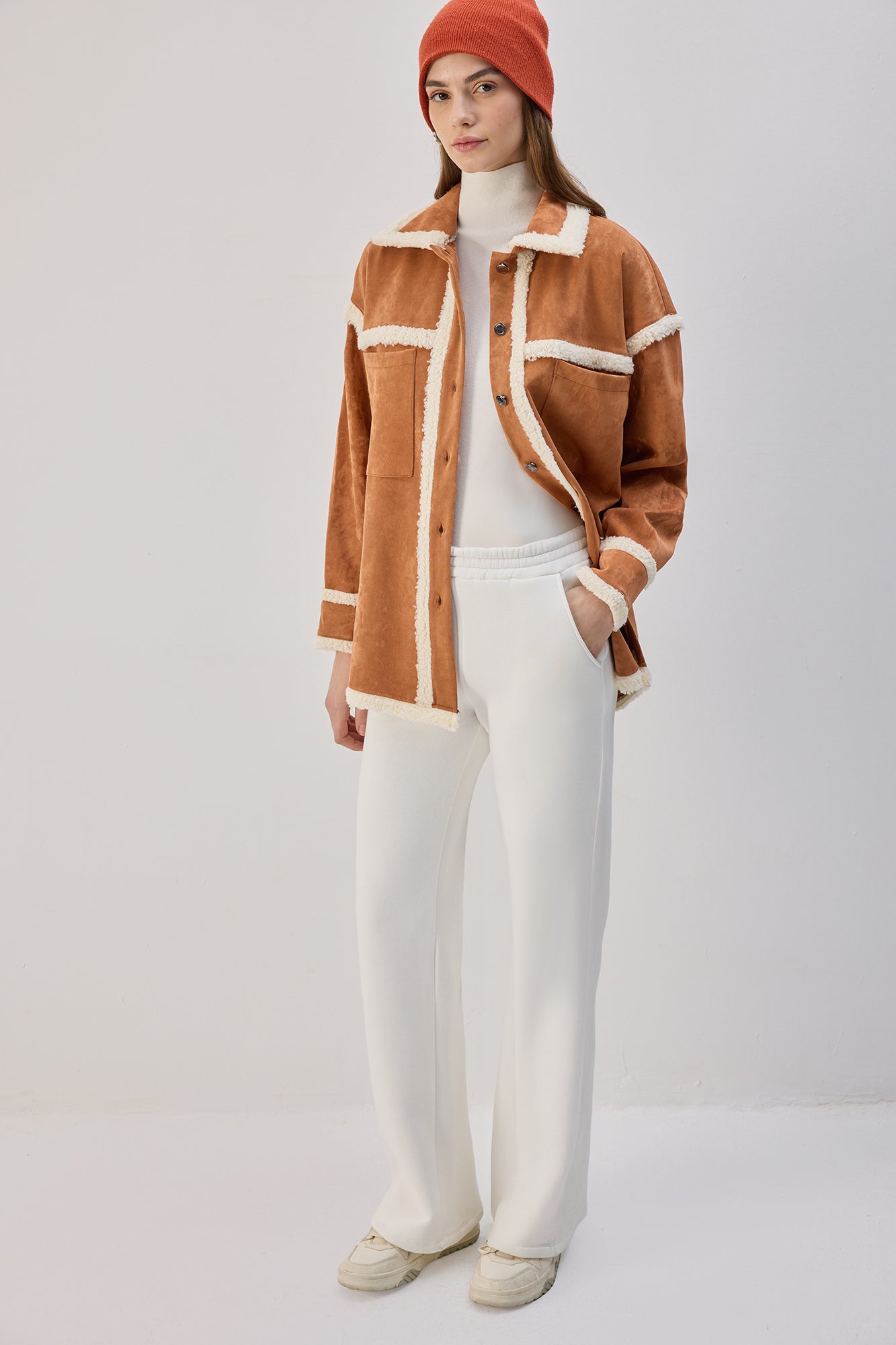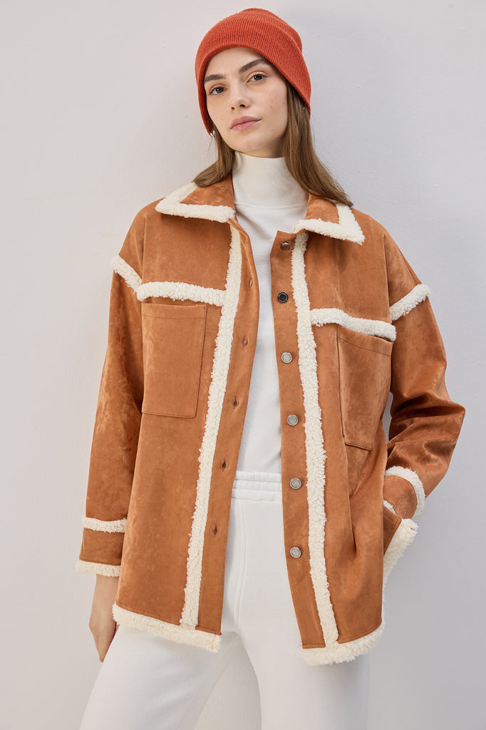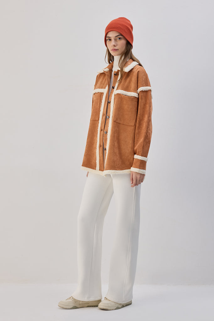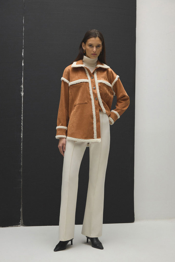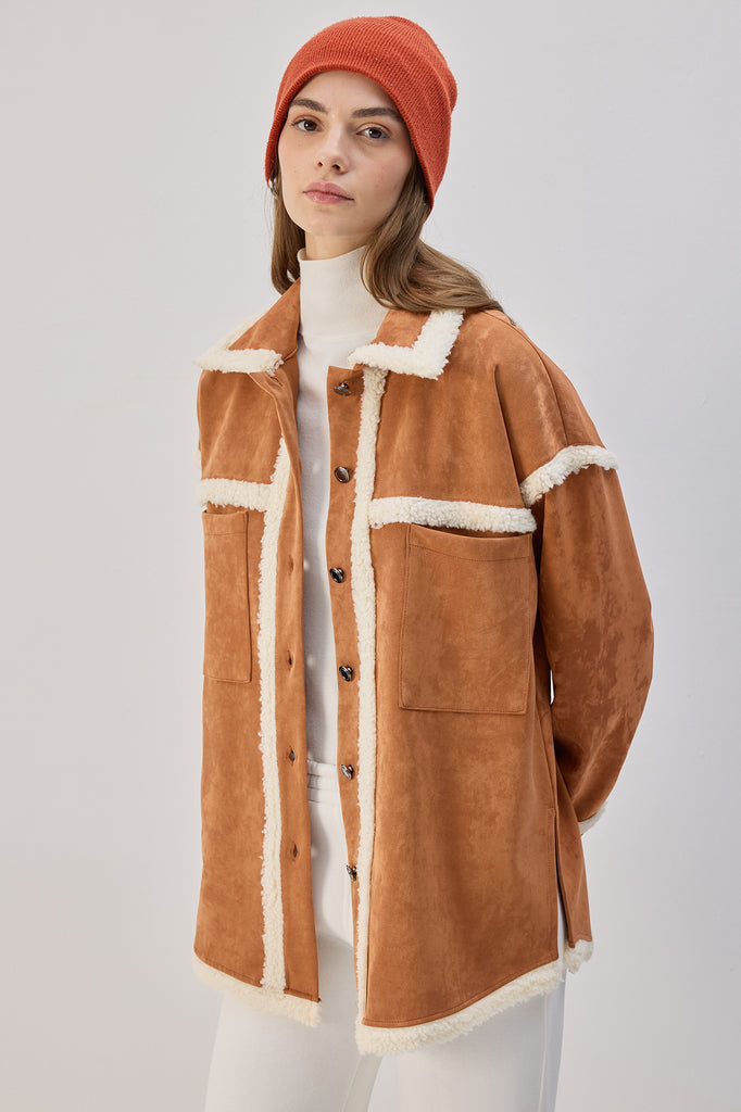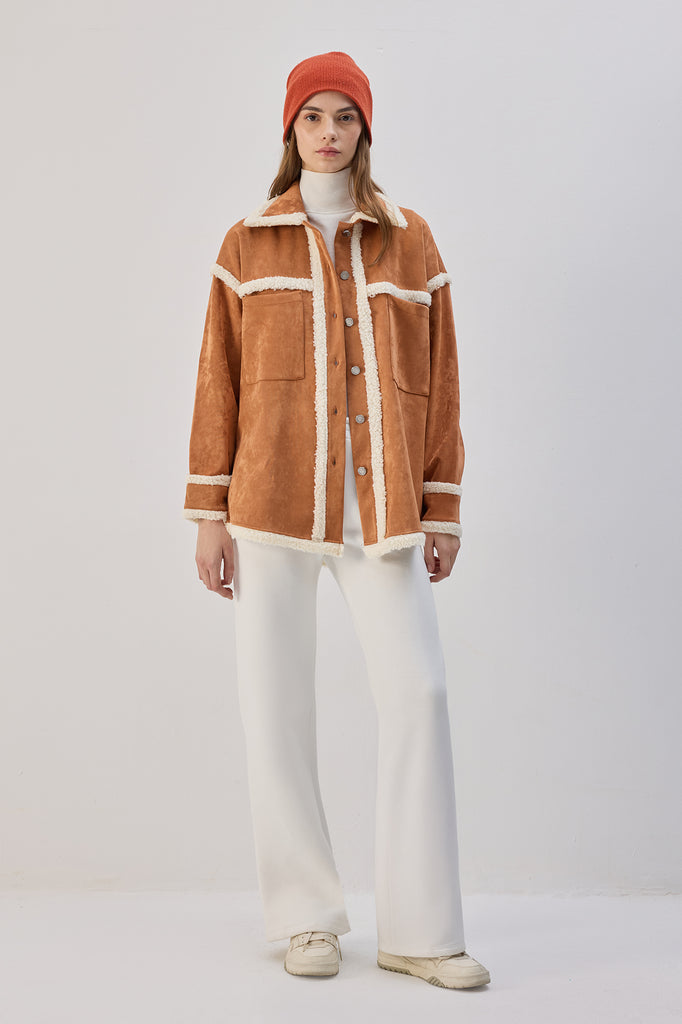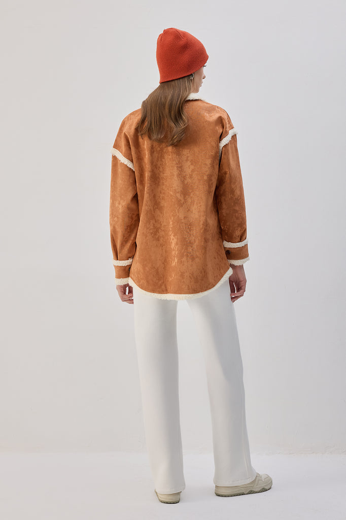 Klasik yaka. Uzun kollu. Manşetleri düğme kapamalı. Peluş detaylı. Göğüs hizasında yama cepli. Süet. Önden düğme kapamalı.