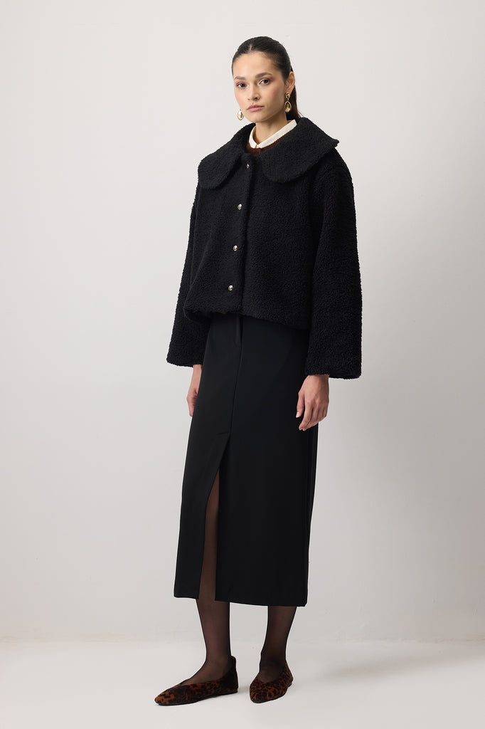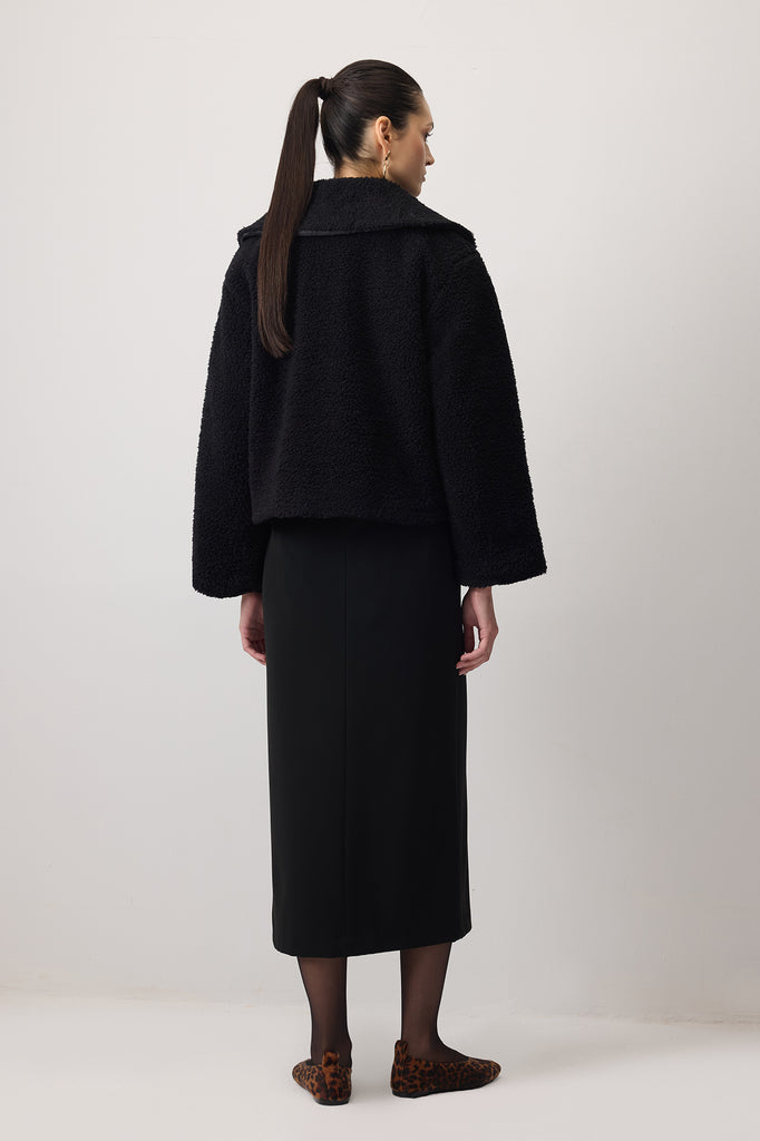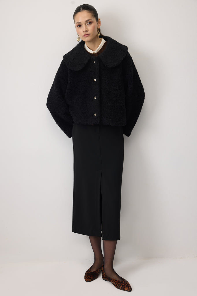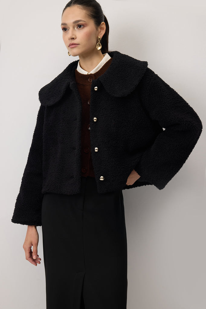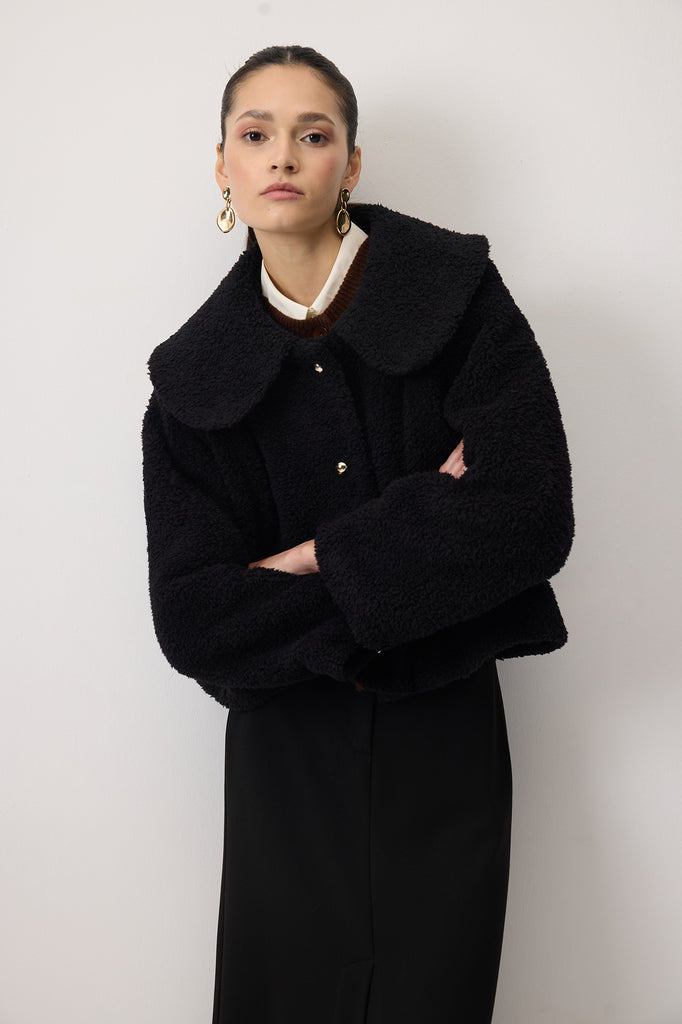 Yumuşak dokulu, teddy görünümlü kısa peluş ceket.