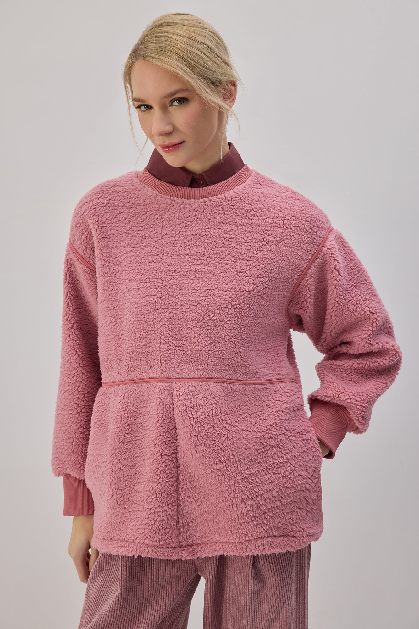 Yumuşak dokulu. Uzun kollu. Bisiklet yaka. Yan cepli. Elastik manşetli. Peluş sweatshırt.