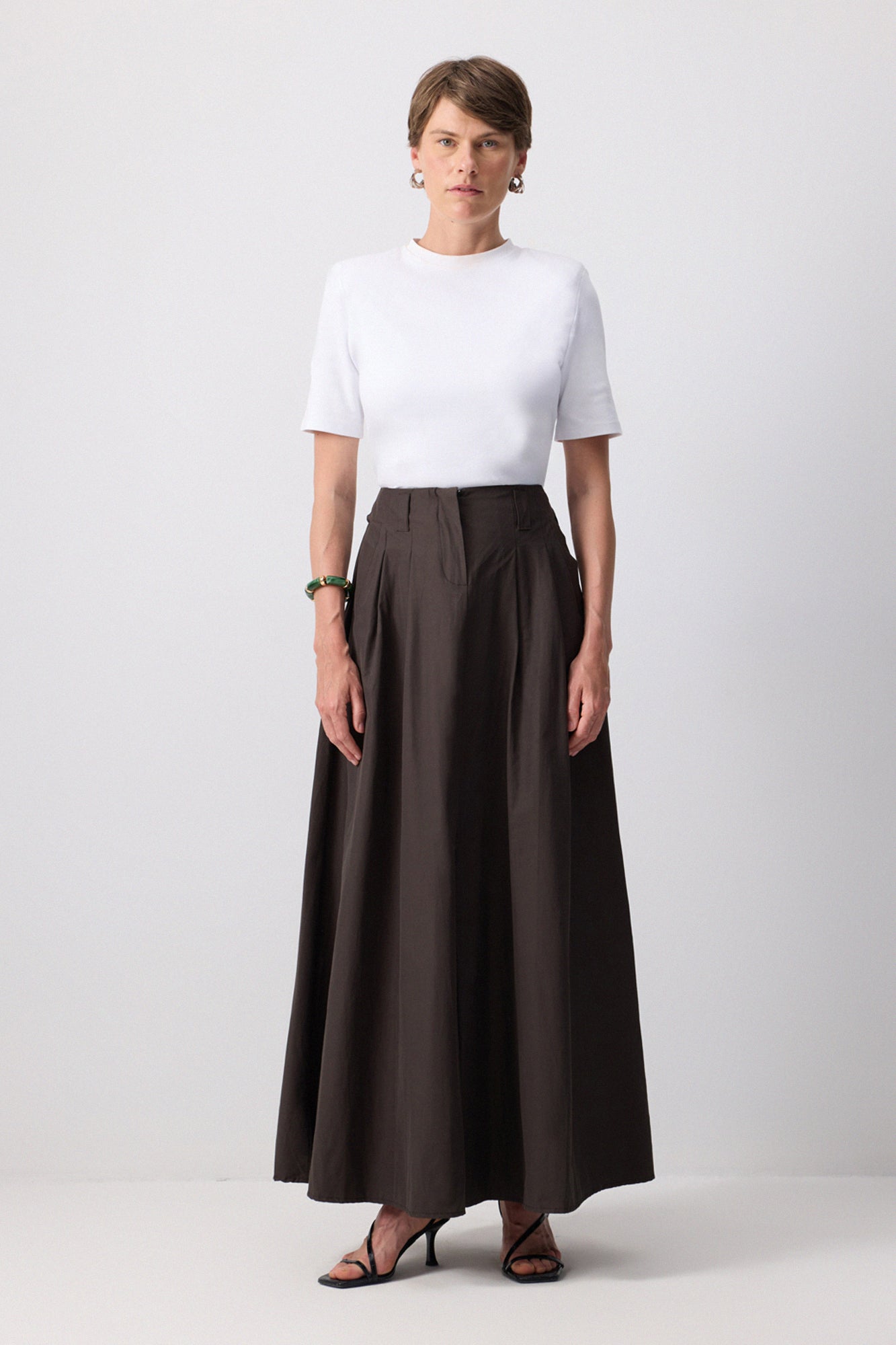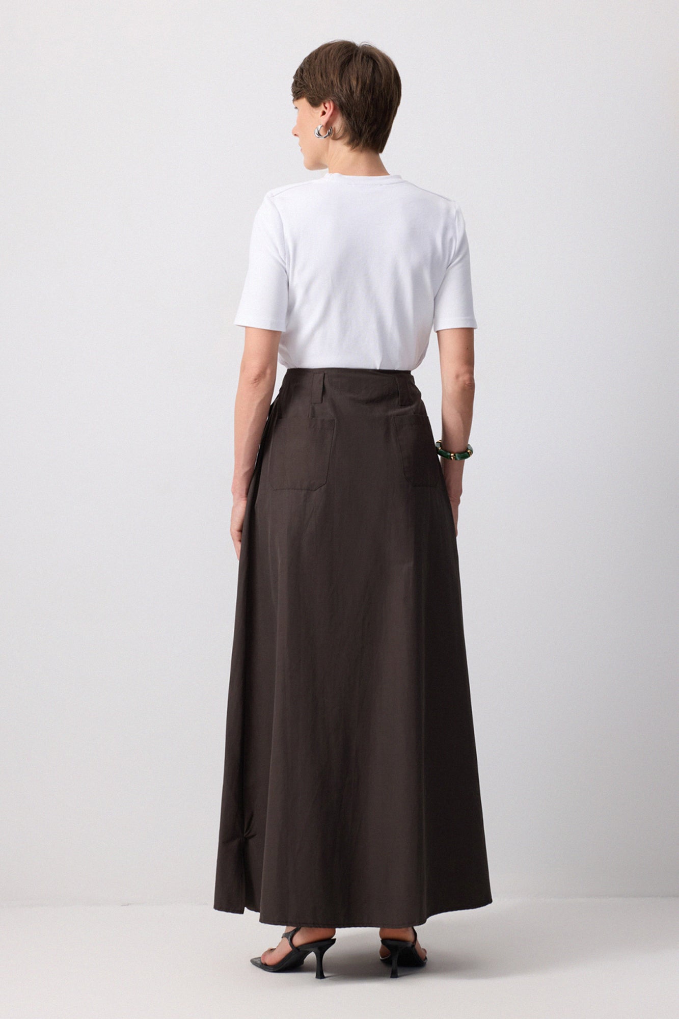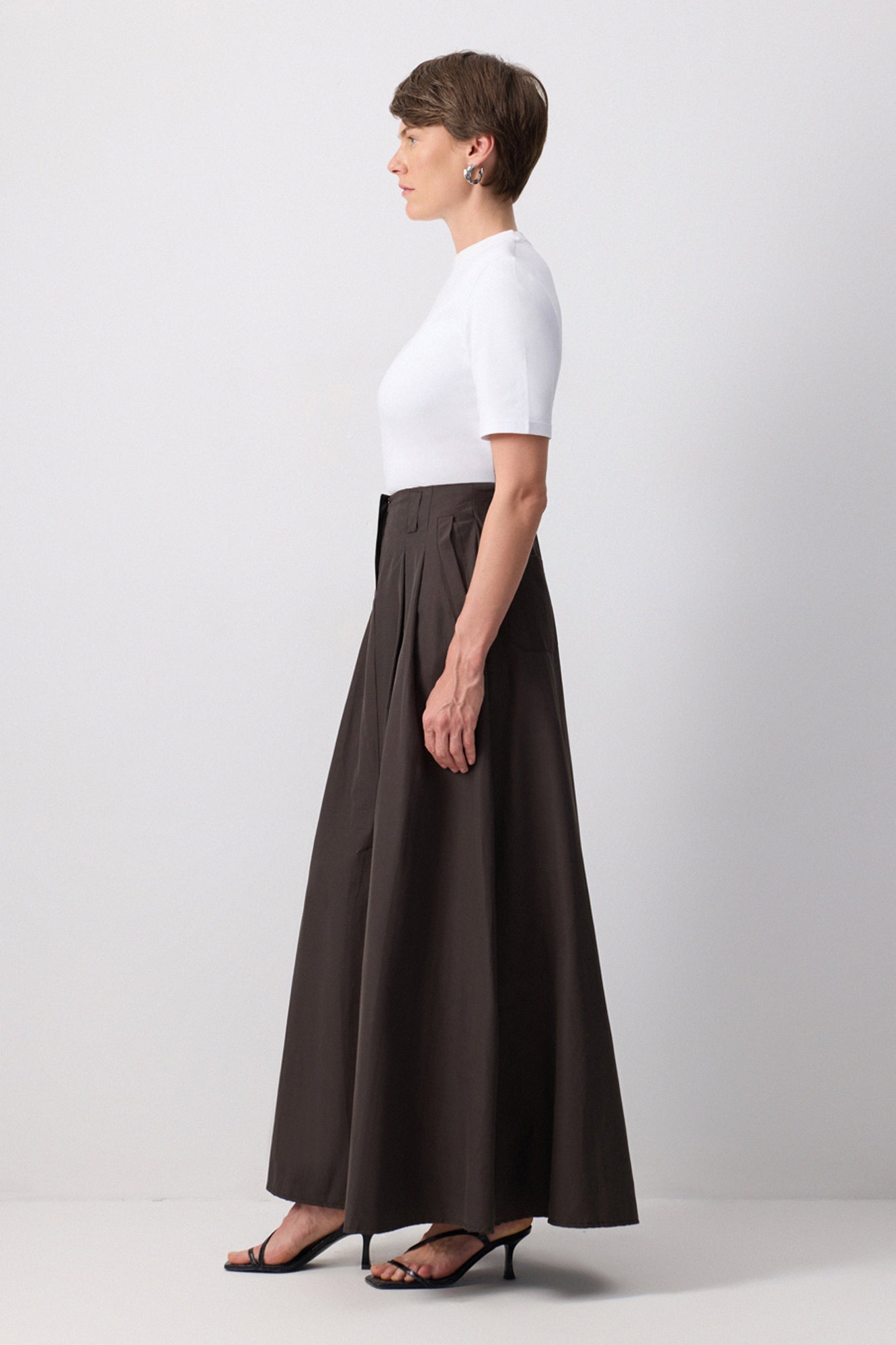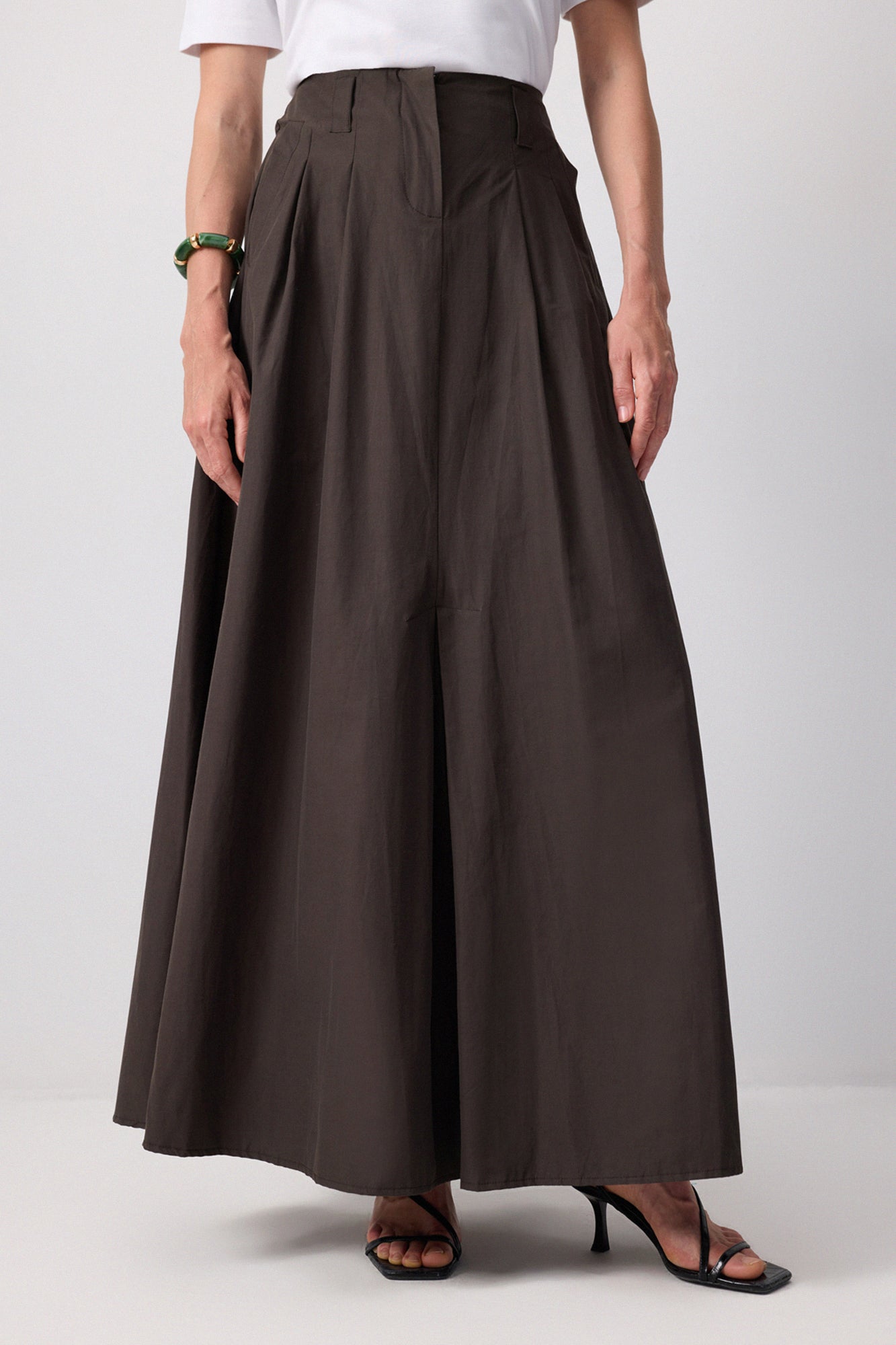 Pamuklu kumaş. Önü pensli. A kesim. Fermuar kapamalı. Kemer köprülü.