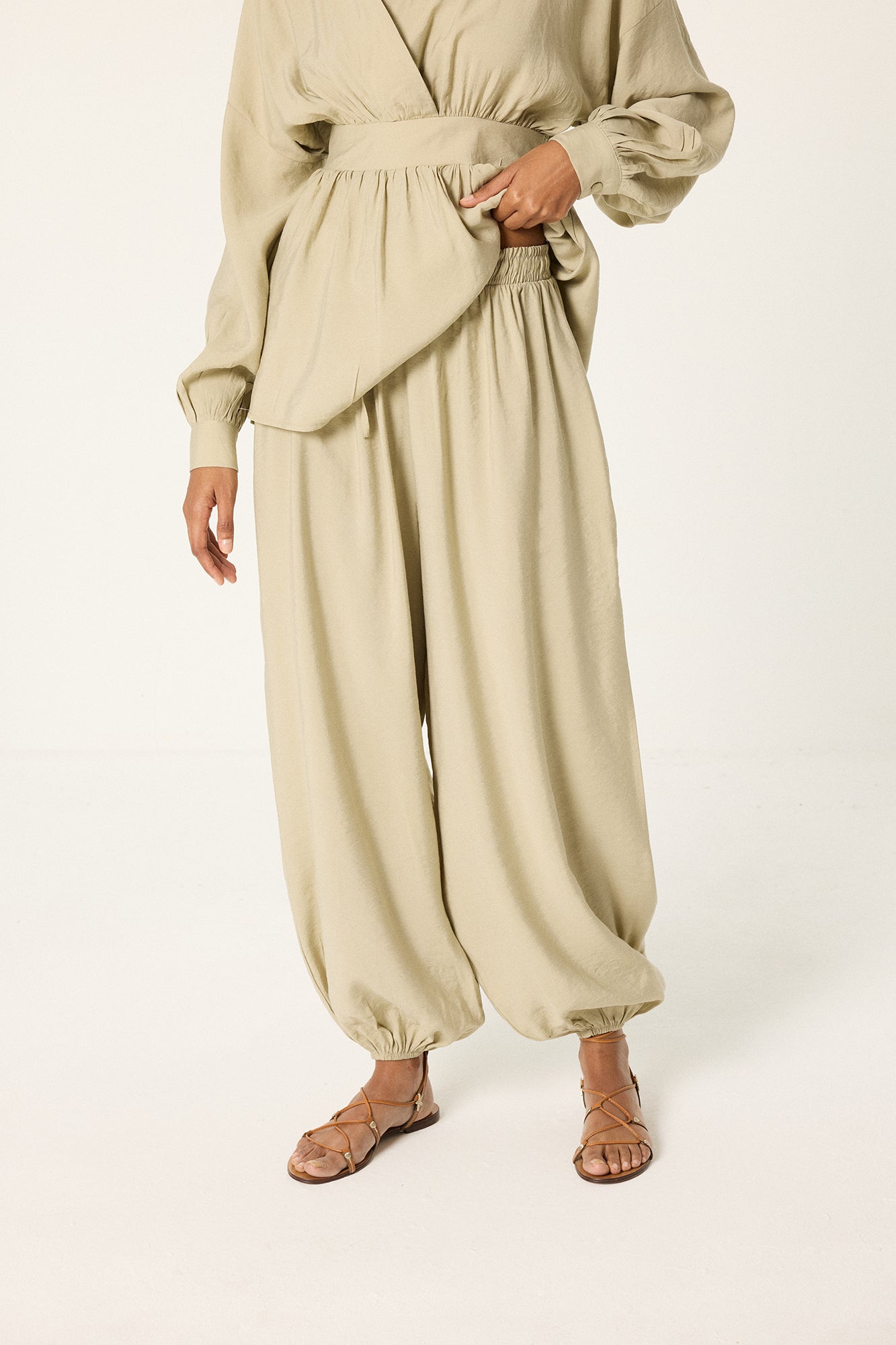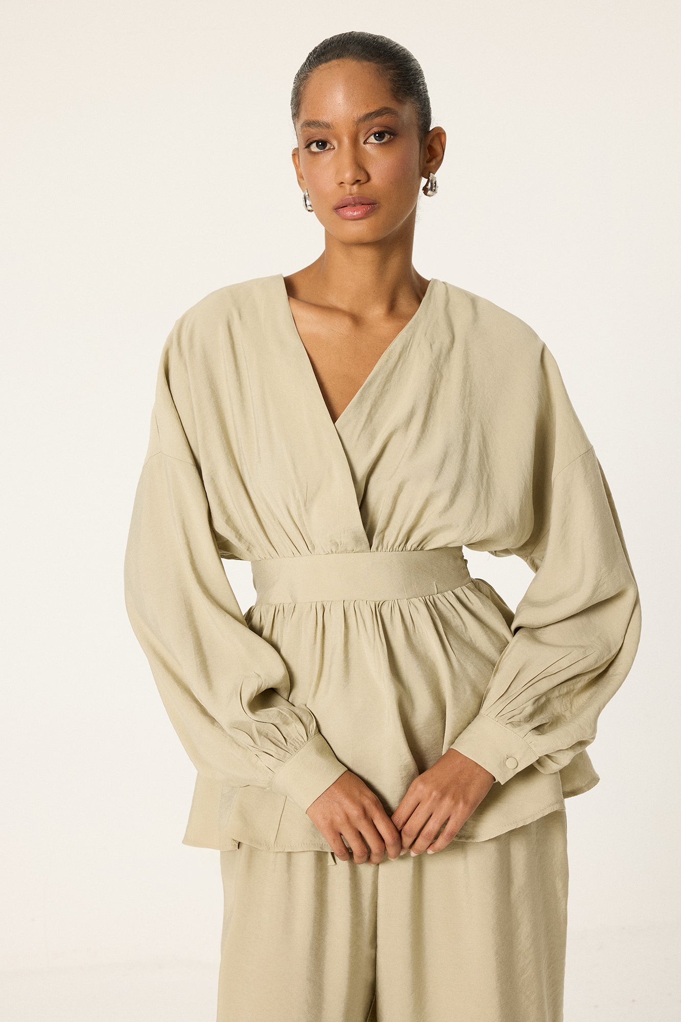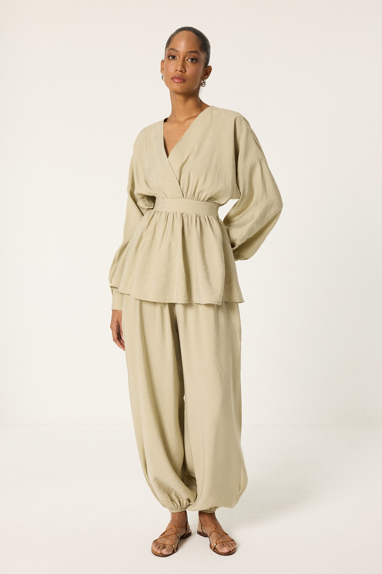 V yaka. Uzun kol. Bel bağlama detaylı. Yan fermuar kapamalı. Lastikli bel pantolon.