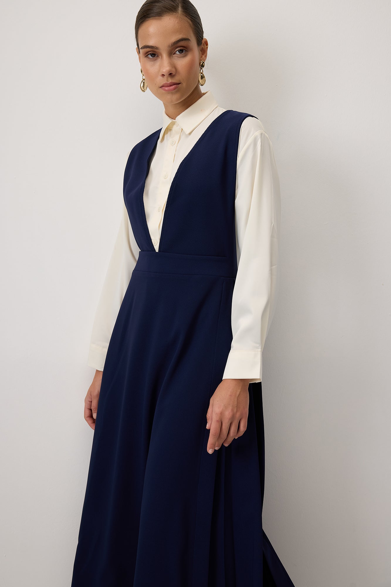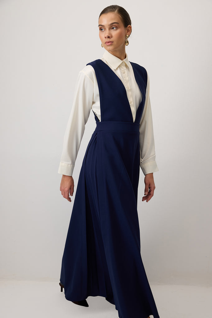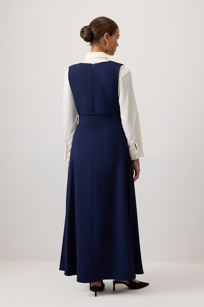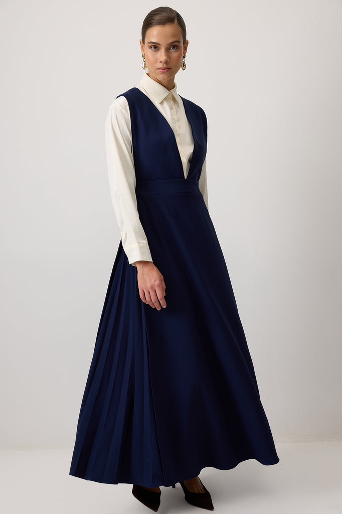 Krep. V yaka. Kolsuz. Yanları pile detaylı. Gizli fermuar kapamalı.
