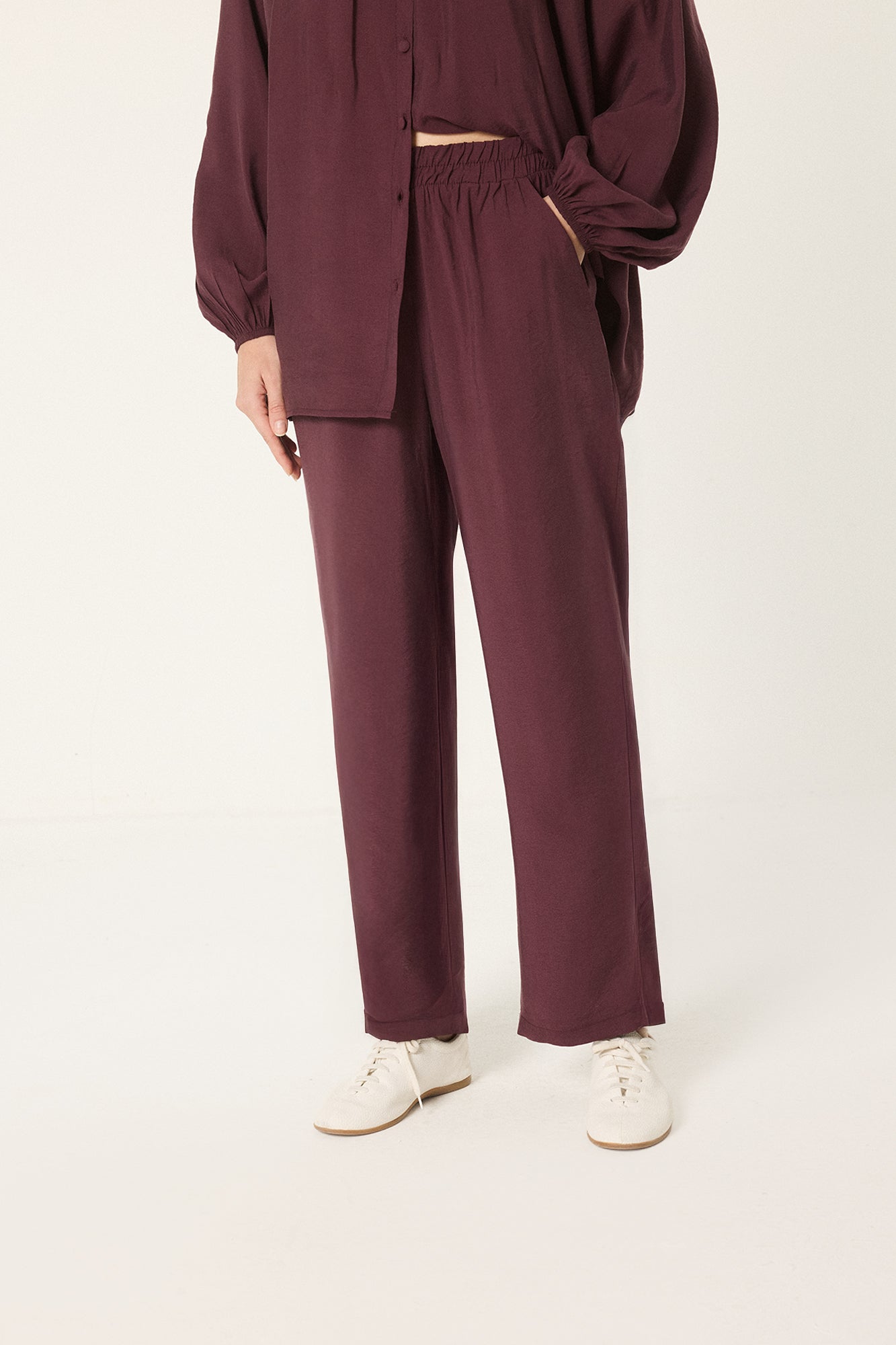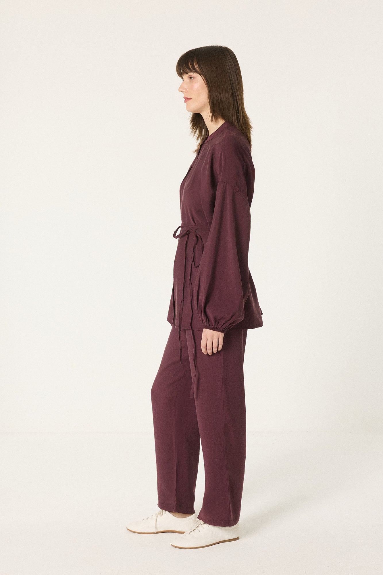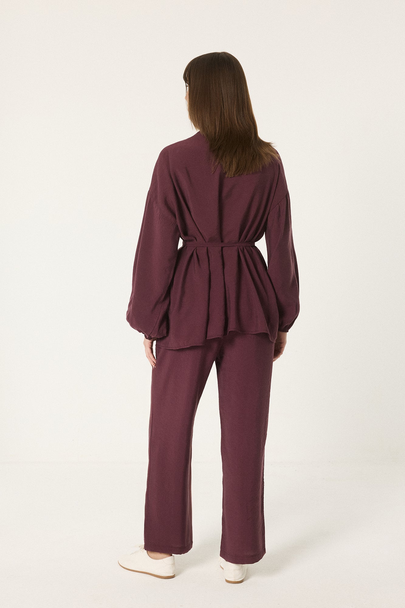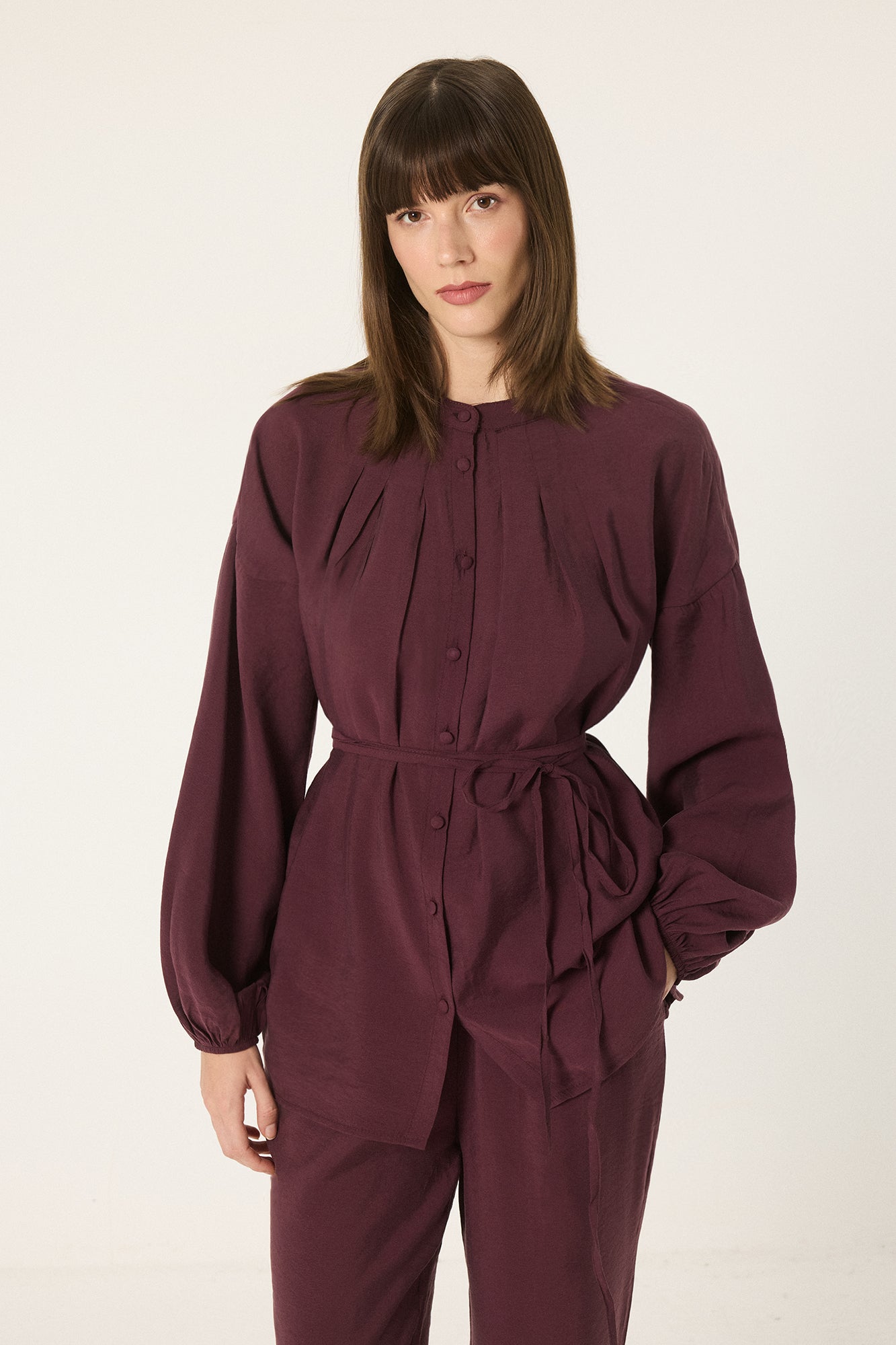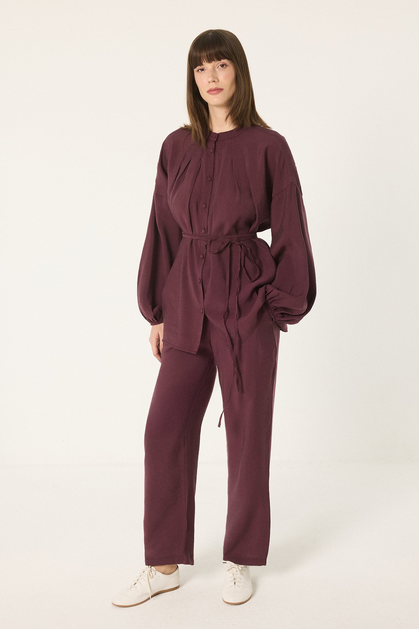 Bisiklet yaka. Uzun kol. Önü düğme kapamalı. Ön kısımda pile detaylı. Lastikli bel. Düz paça pantolon.