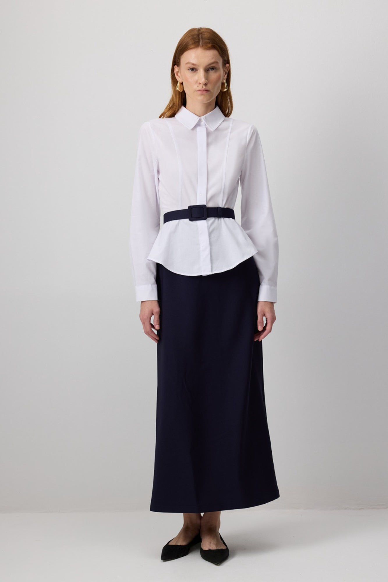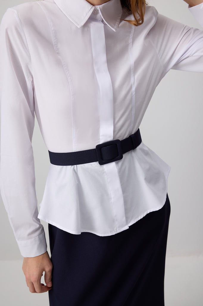 Klasik yaka. Uzun kollu. Önden düğmeli. Pile detaylı poplin elbise.
